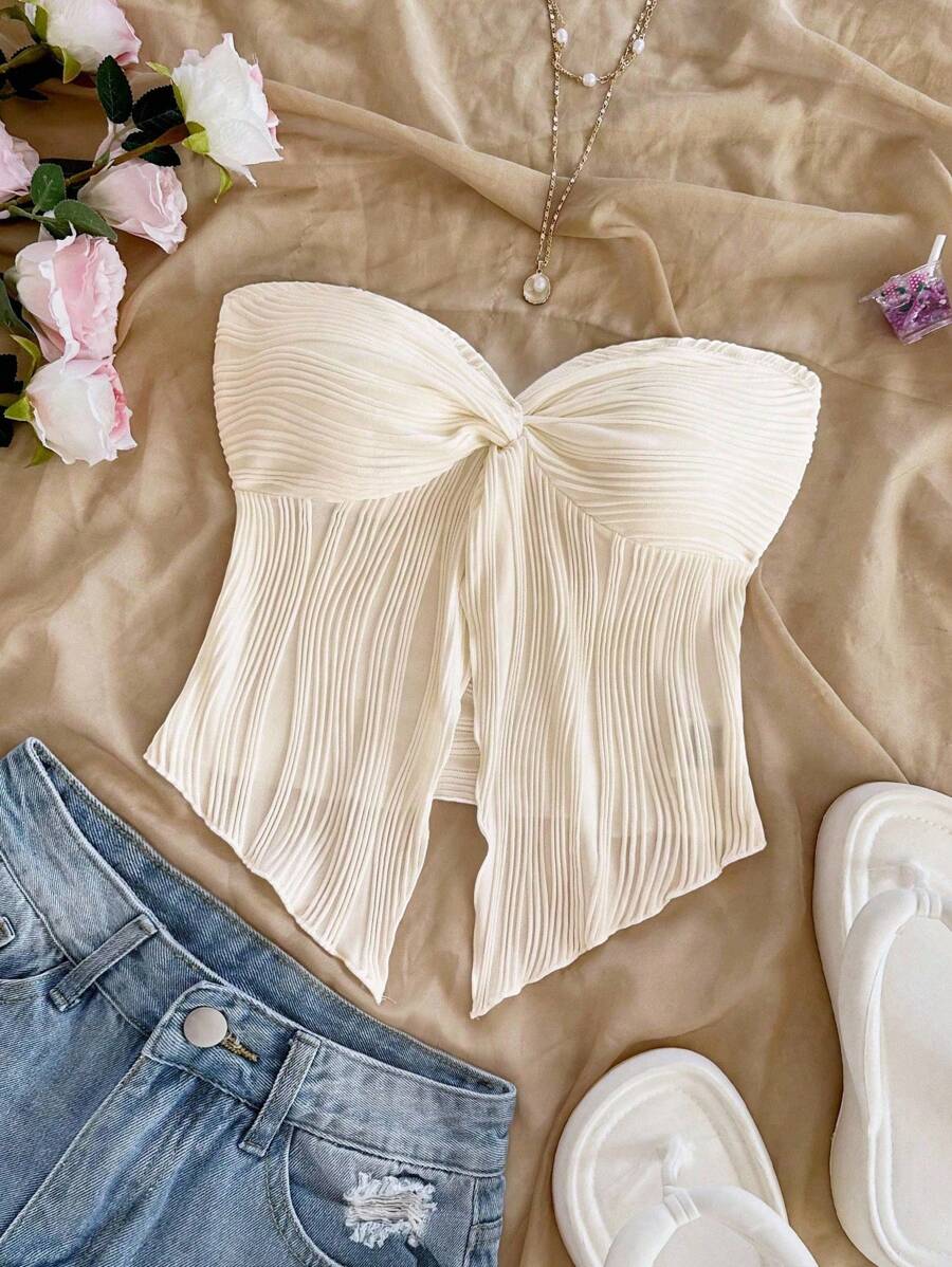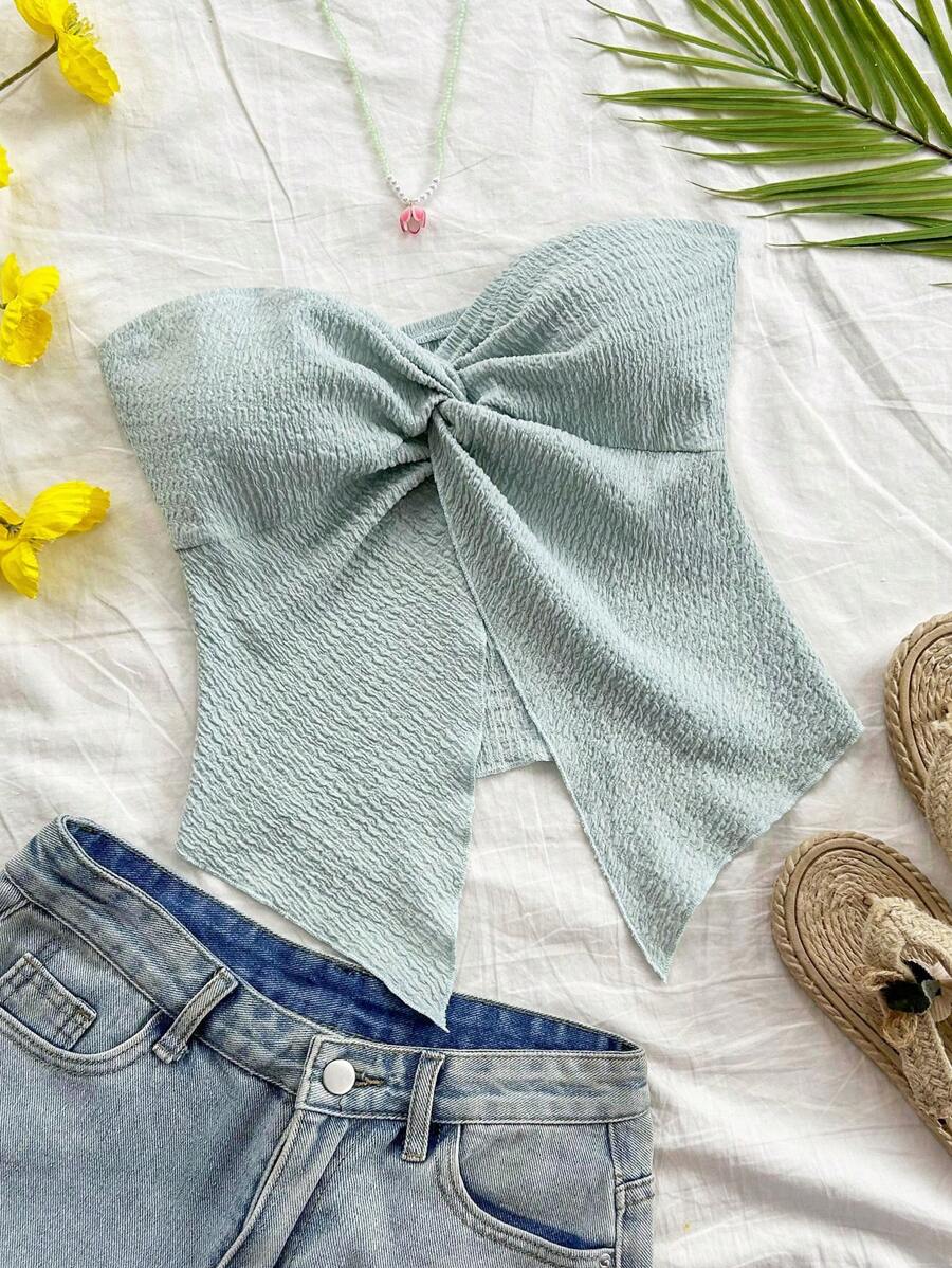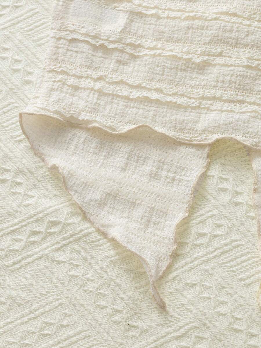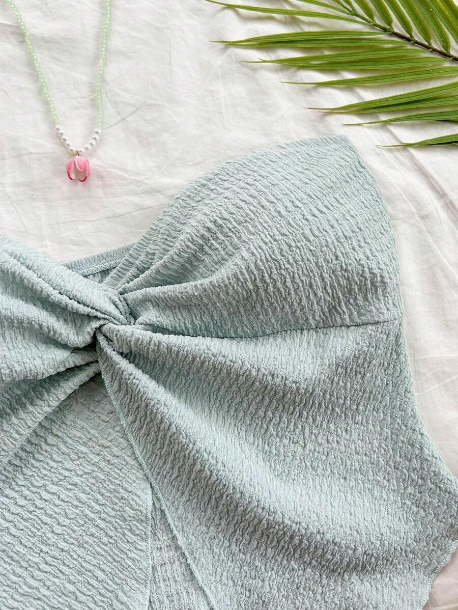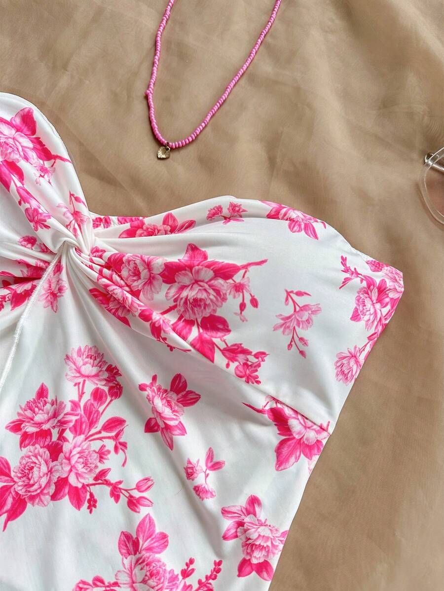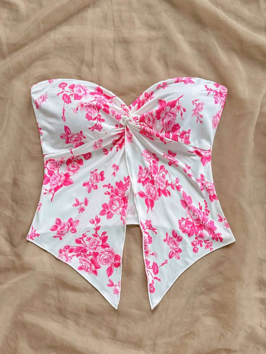 Blusa de gasa comoda con estampado floral azul y blanco, corte halter y abertura frontal, adecuada para te de la tarde, temporada de graduacion, y como capa para el invierno