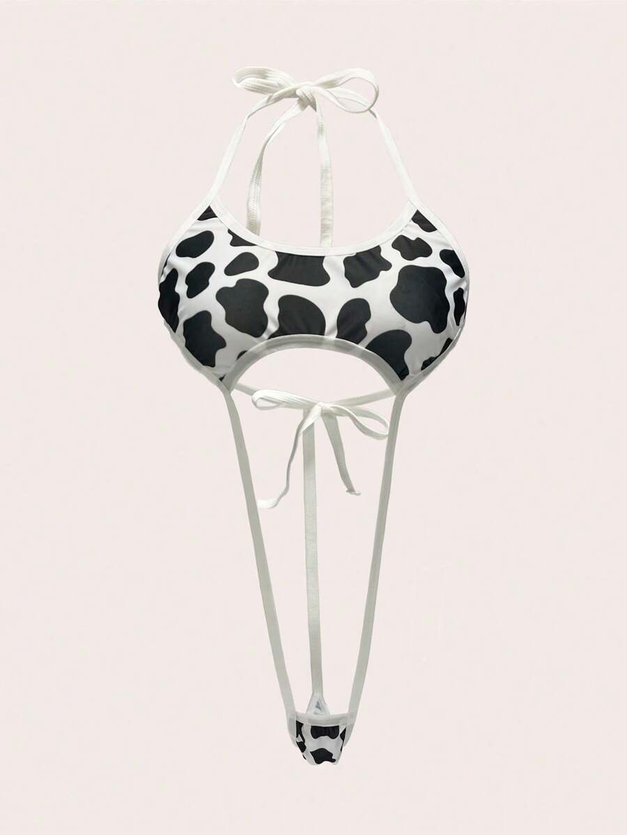 Conjunto de una pieza de lenceria sexy para mujer, enterizo sexy, tanga con estampado de vaca y corbata de cuello colgante, para fiesta