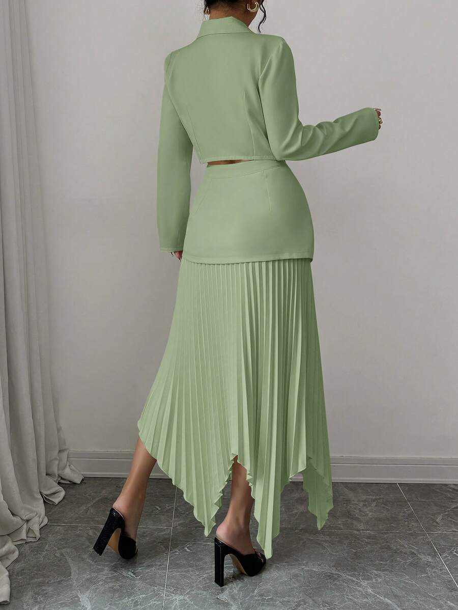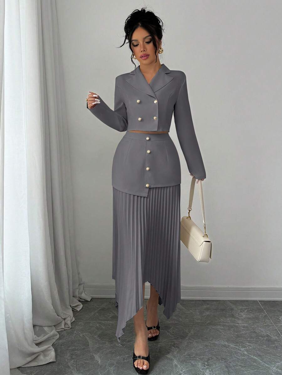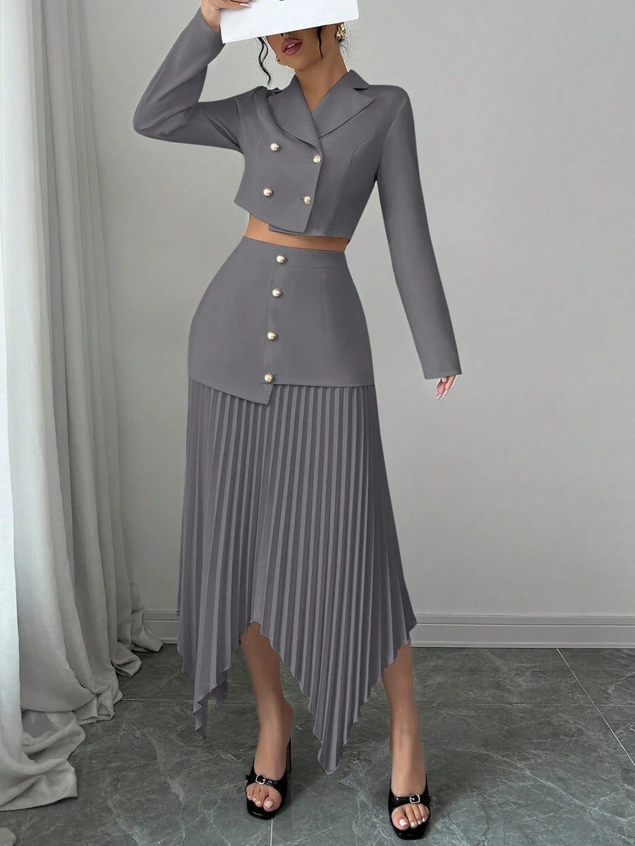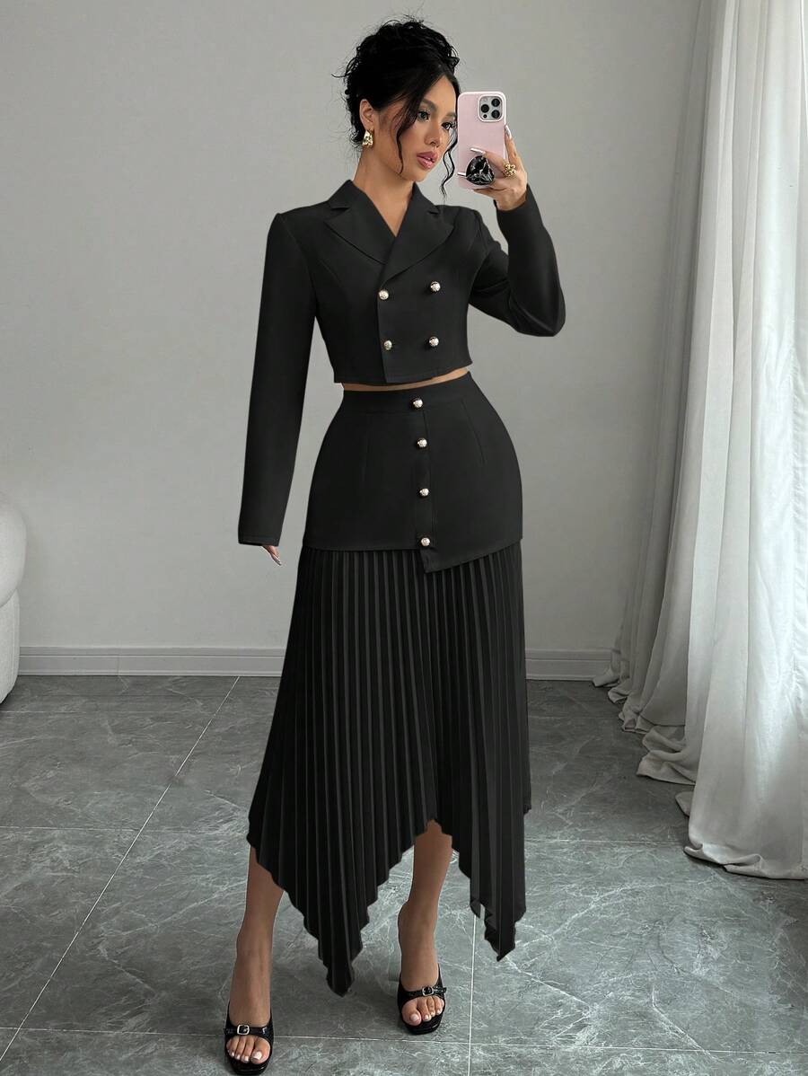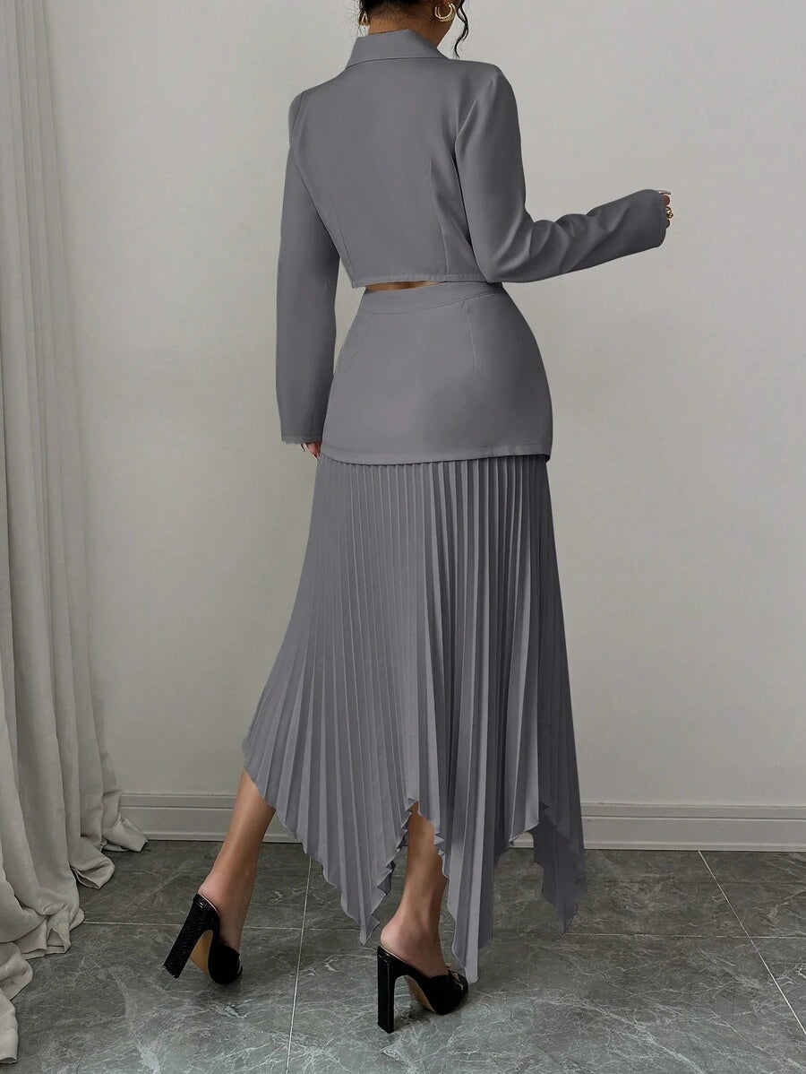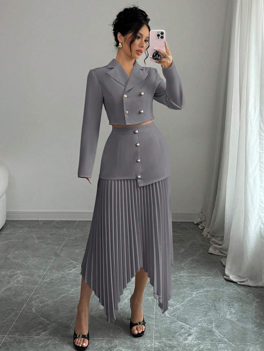 2 piezas conjunto elegante con chaqueta de cuello abotonada, drapeado y pliegues asimetricos para mujer