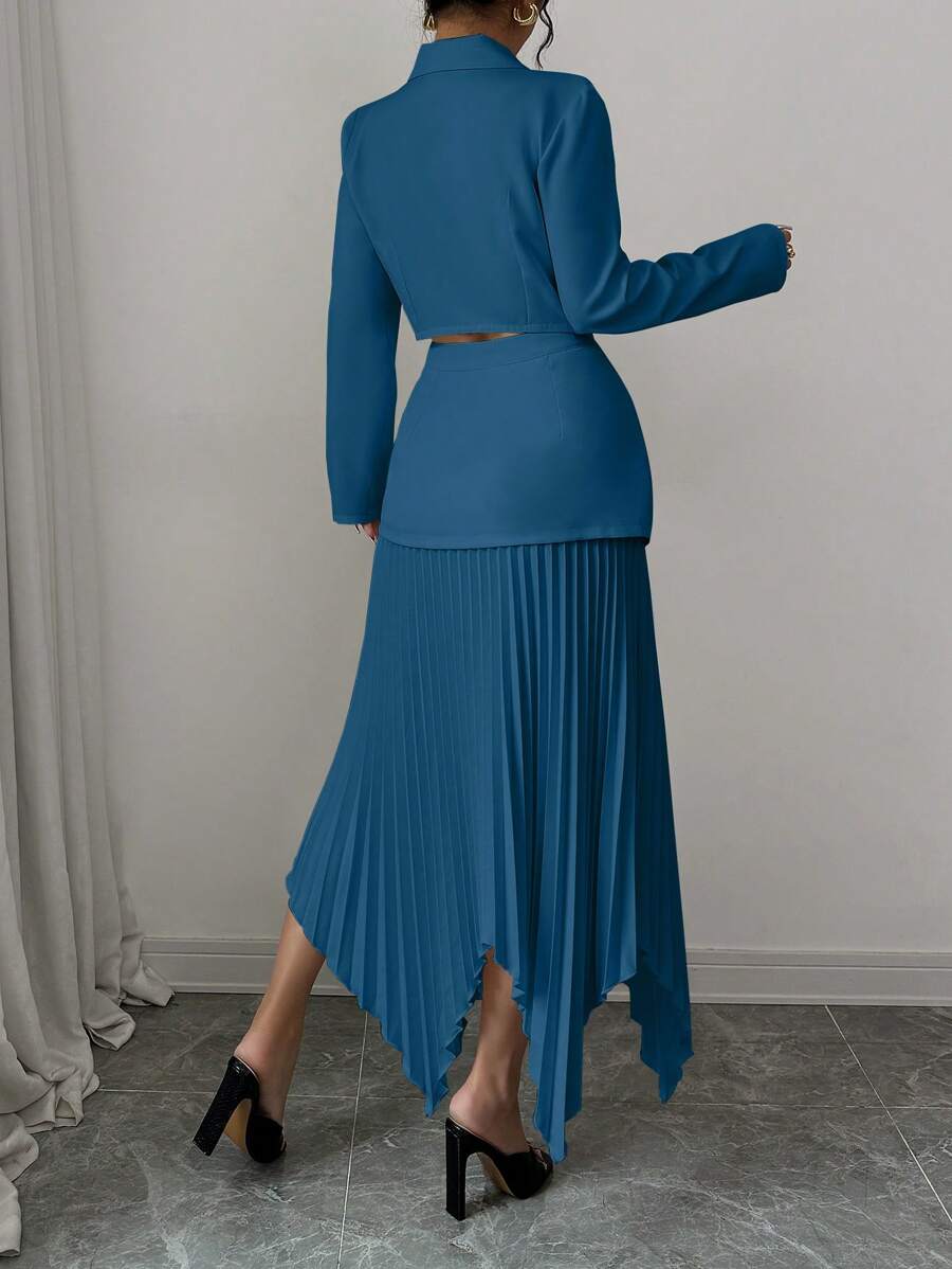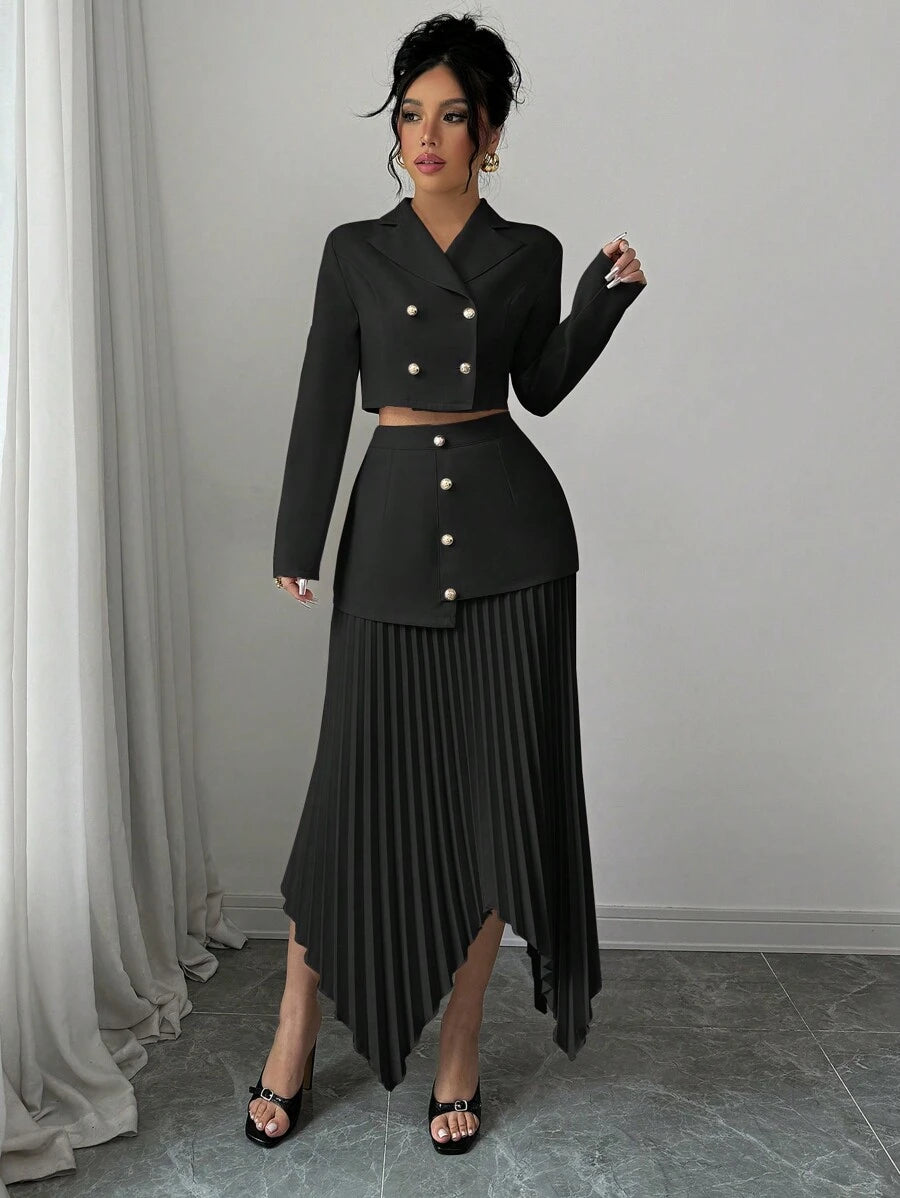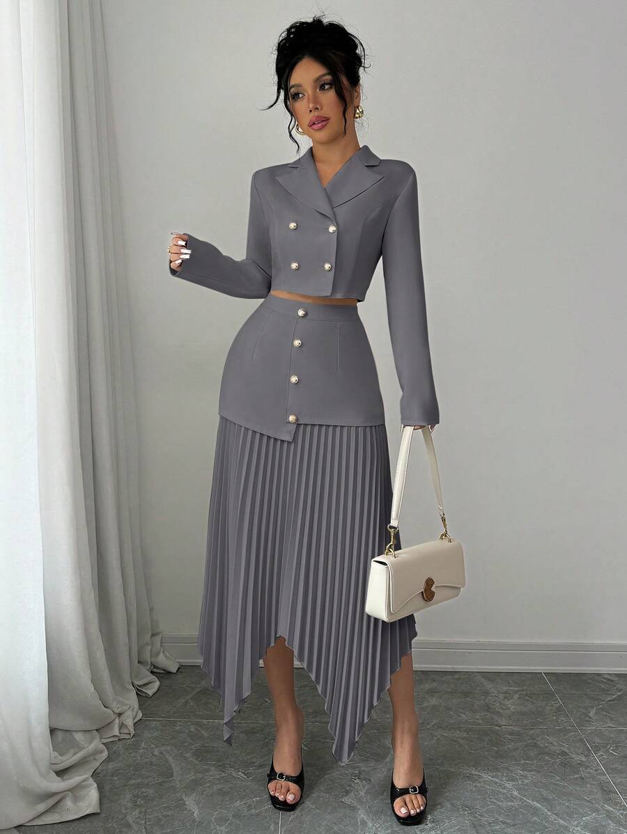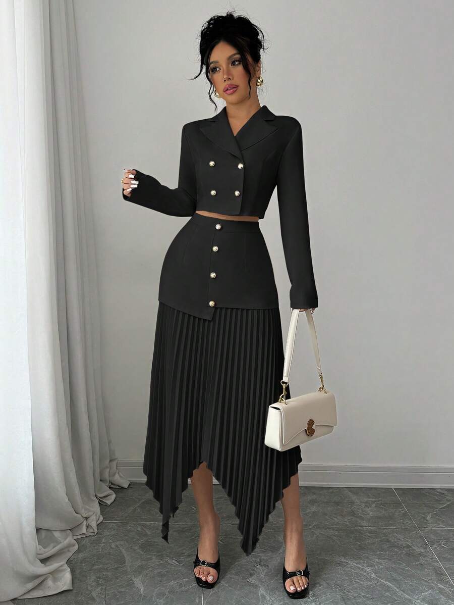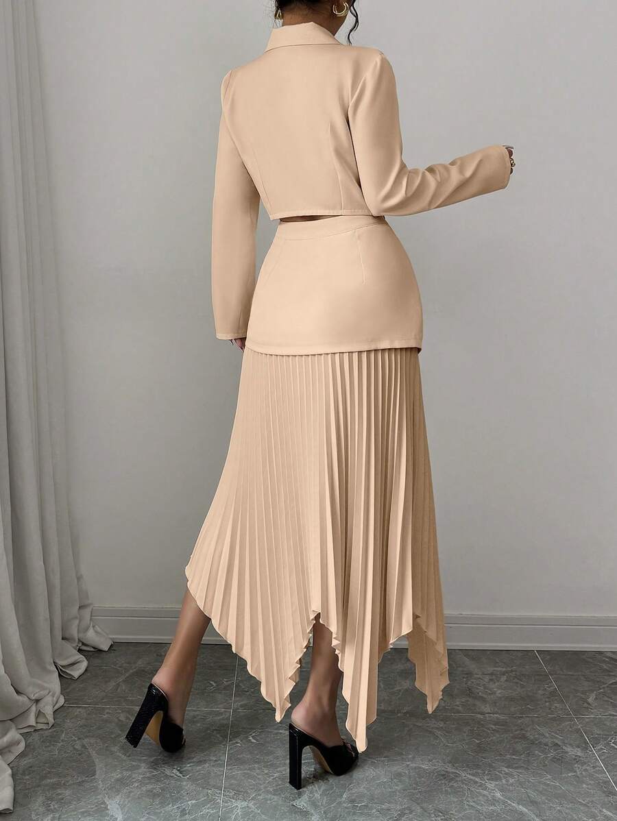 2 piezas conjunto elegante con chaqueta de cuello abotonada, drapeado y pliegues asimetricos para mujer
