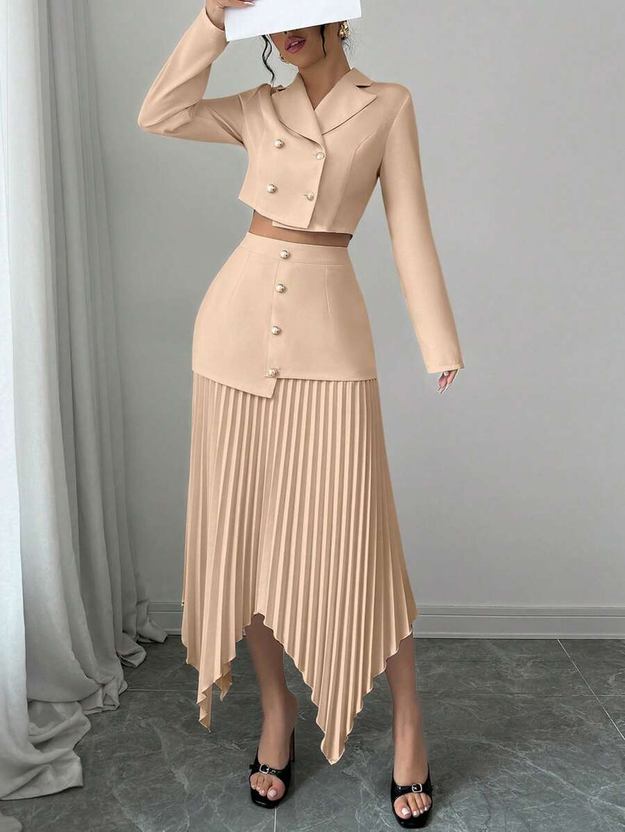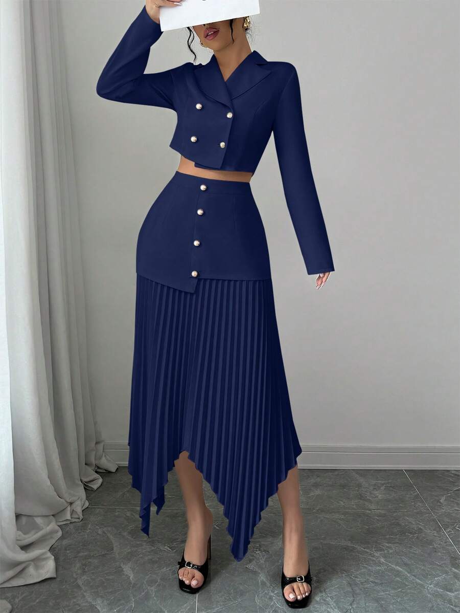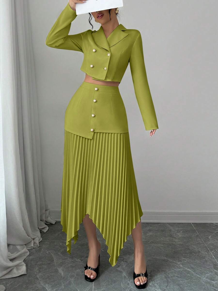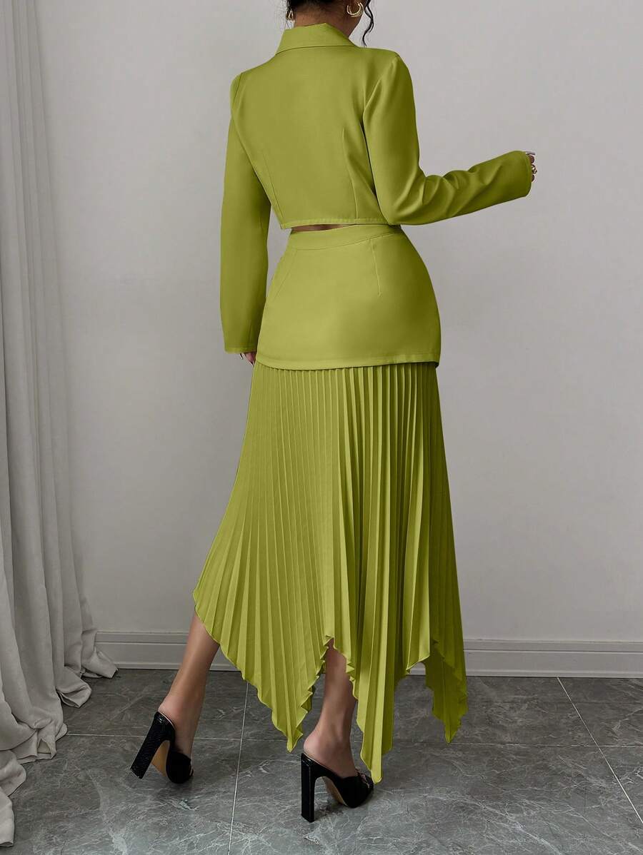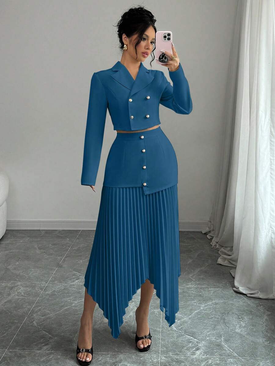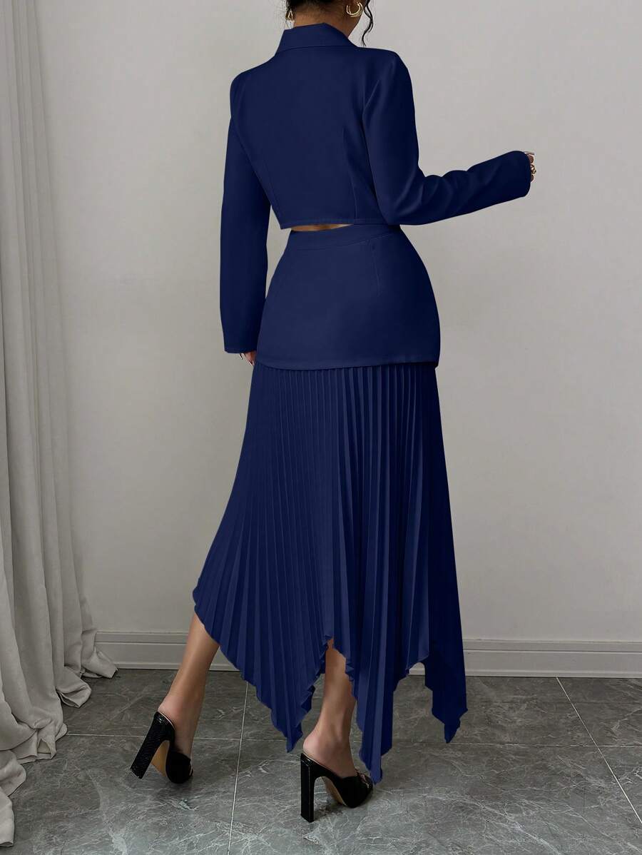 2 piezas conjunto elegante con chaqueta de cuello abotonada, drapeado y pliegues asimetricos para mujer