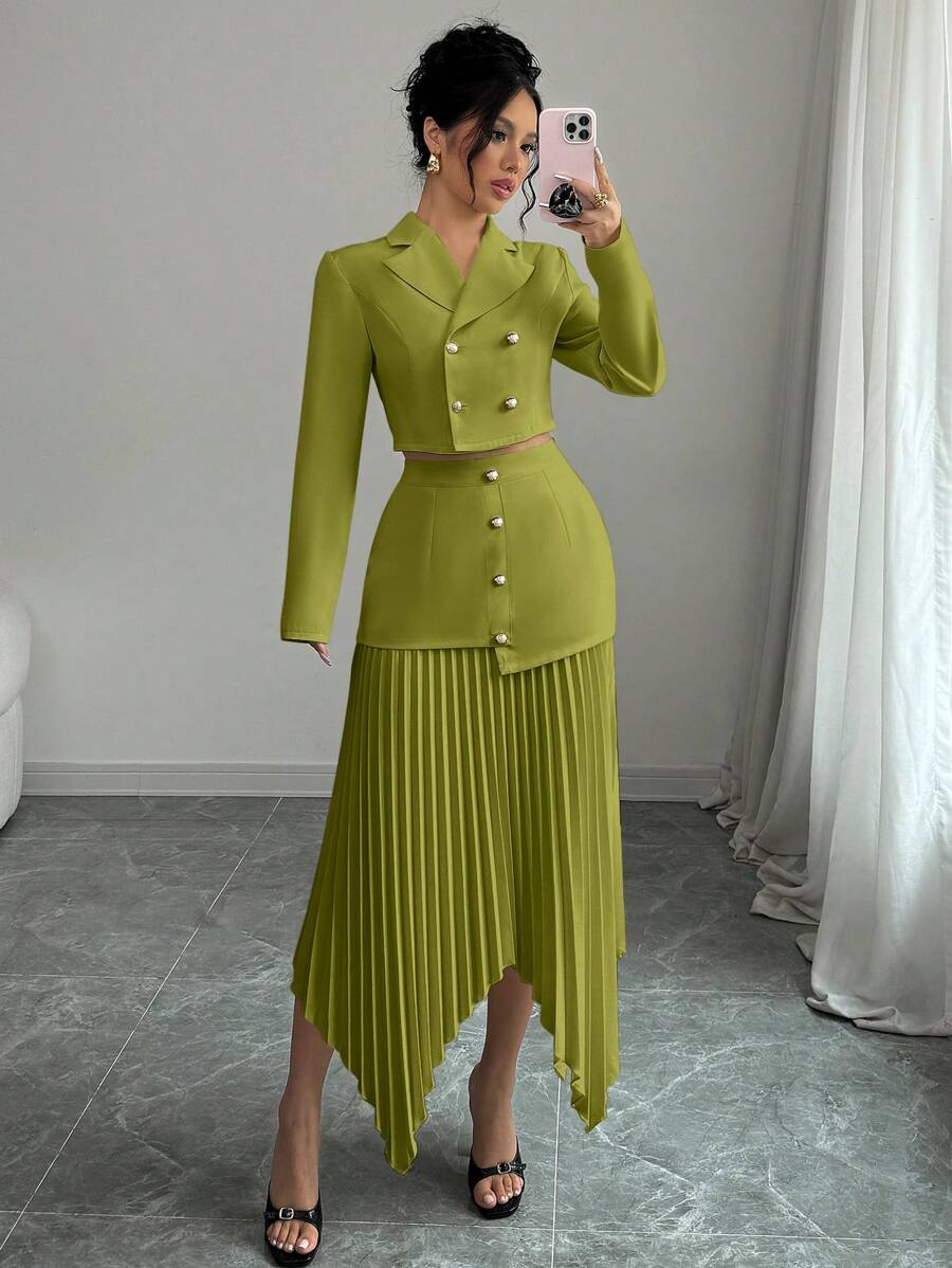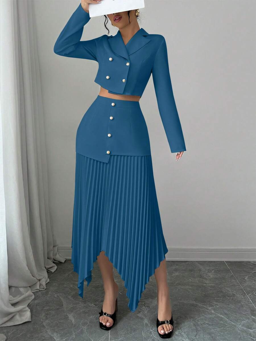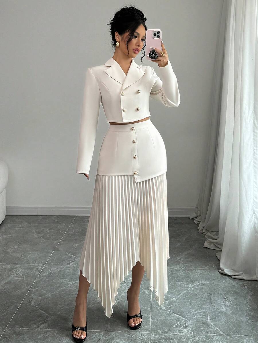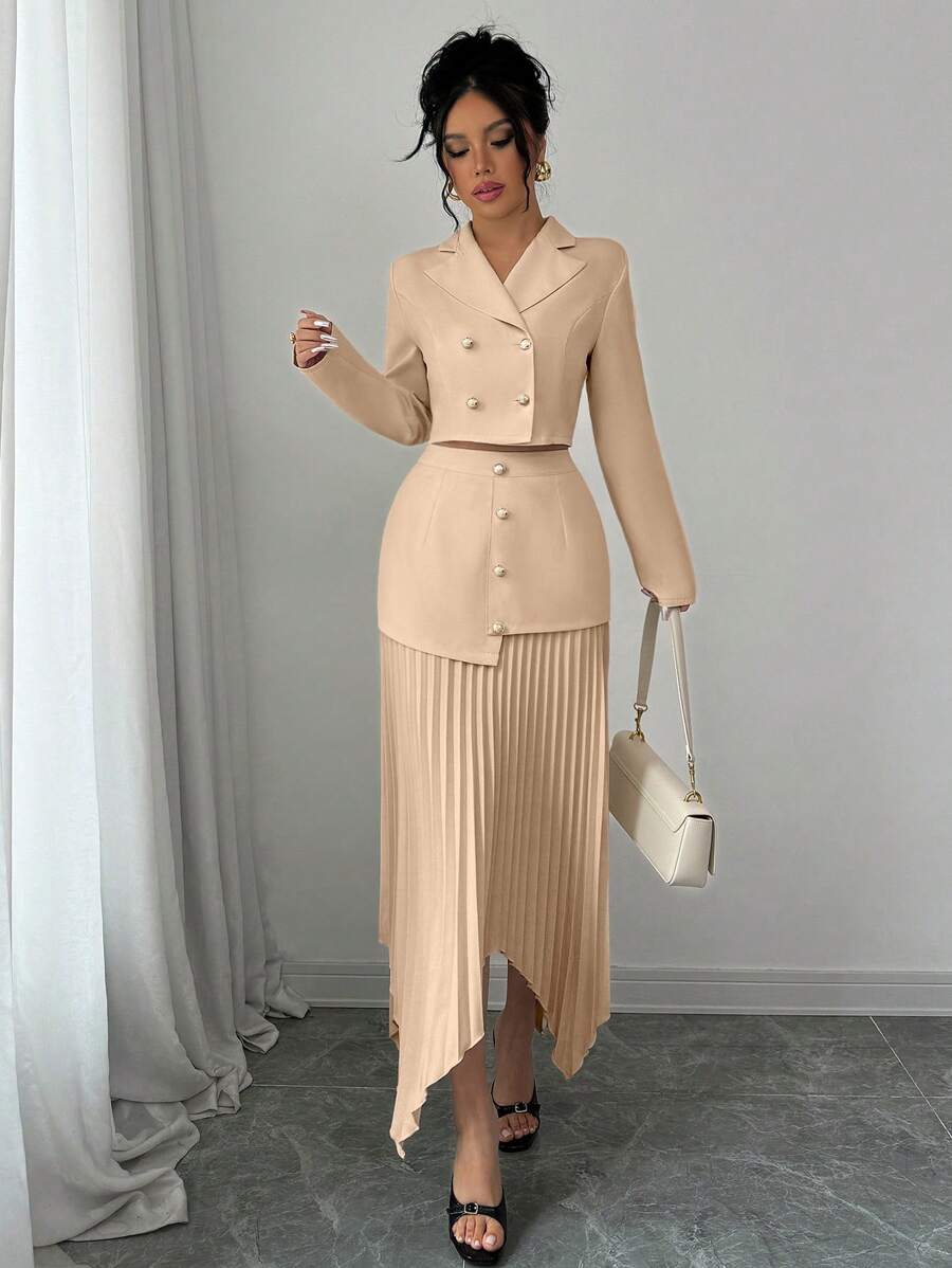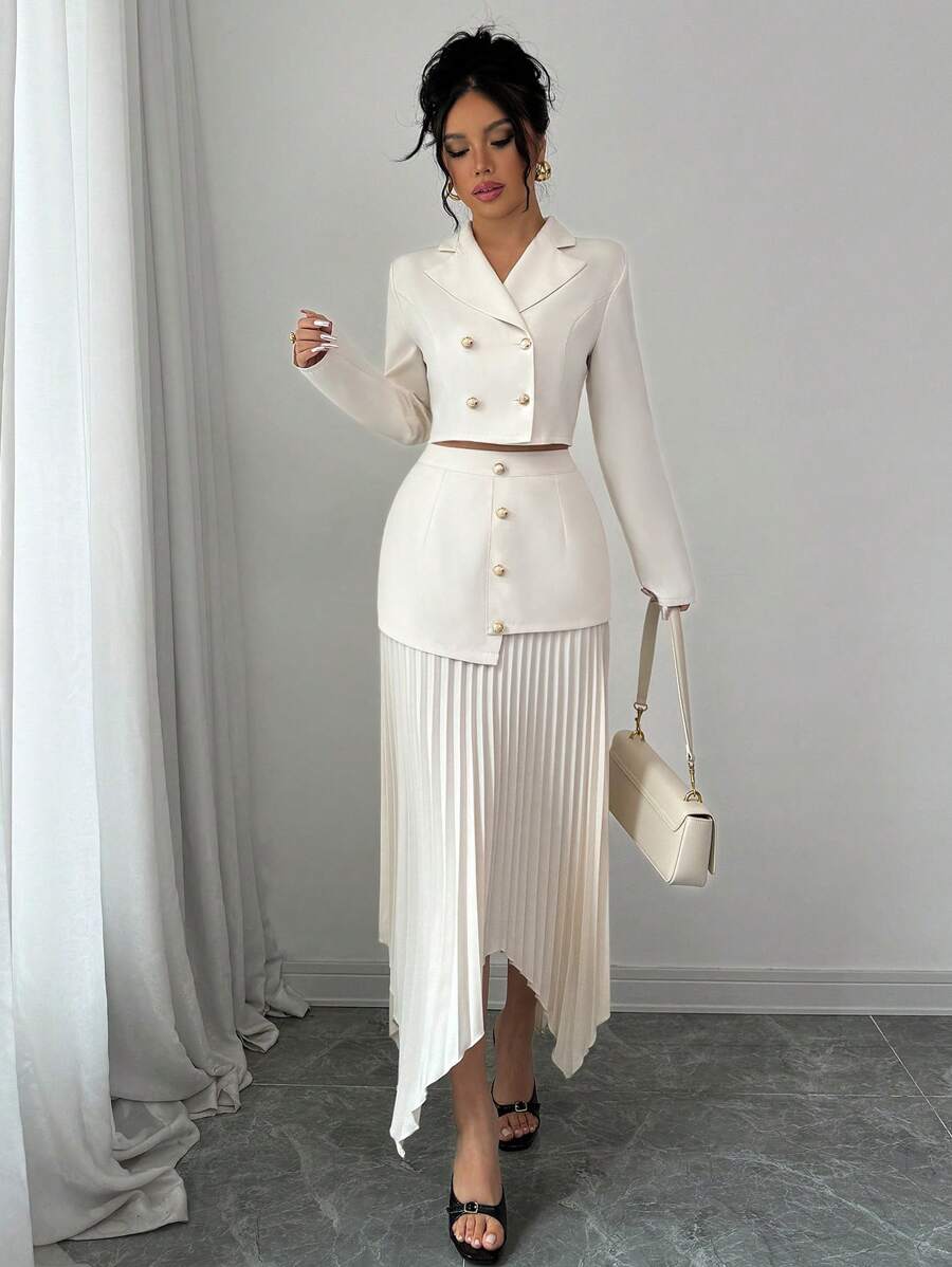 2 piezas conjunto elegante con chaqueta de cuello abotonada, drapeado y pliegues asimetricos para mujer