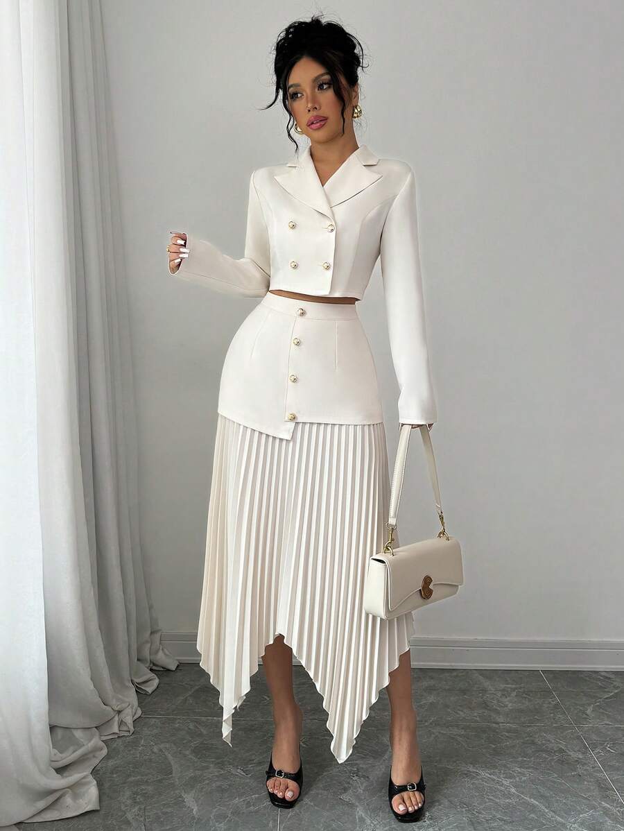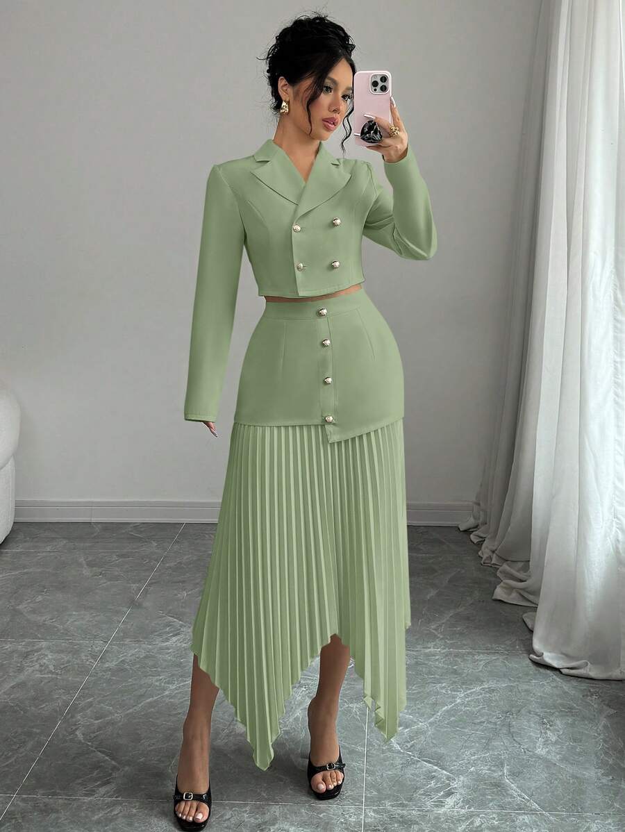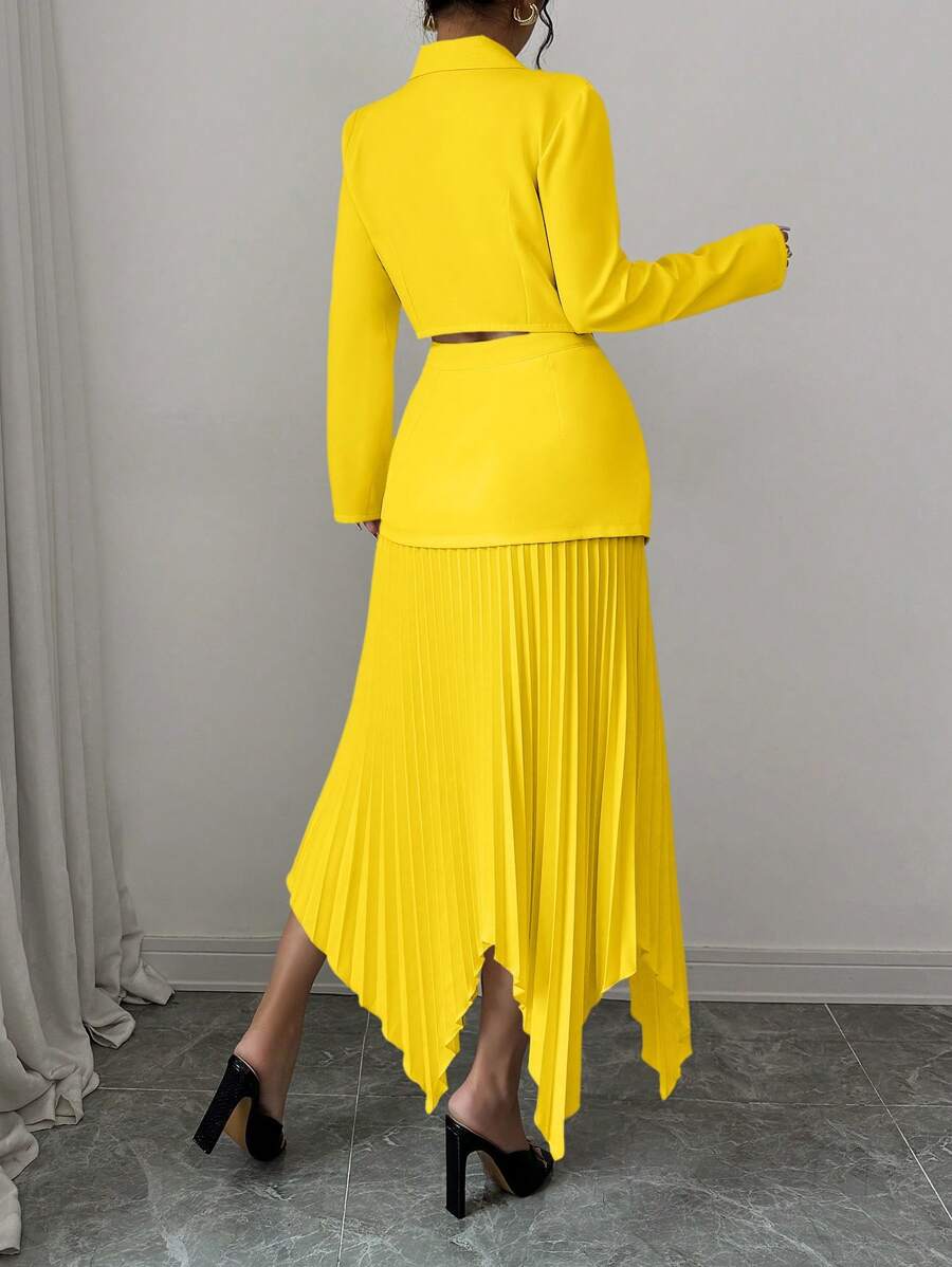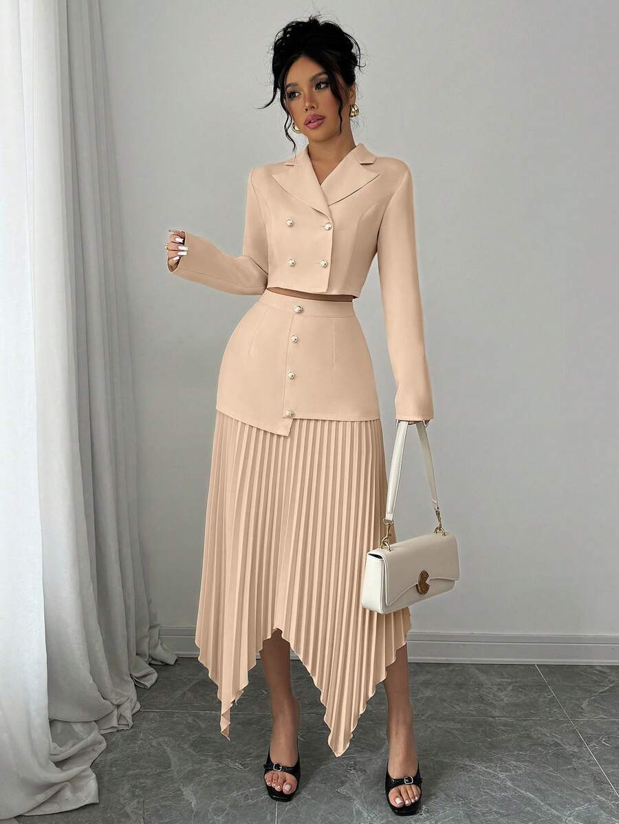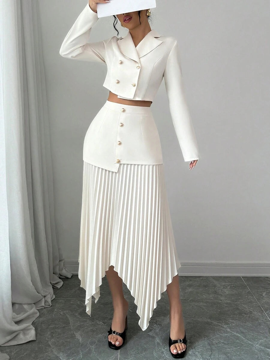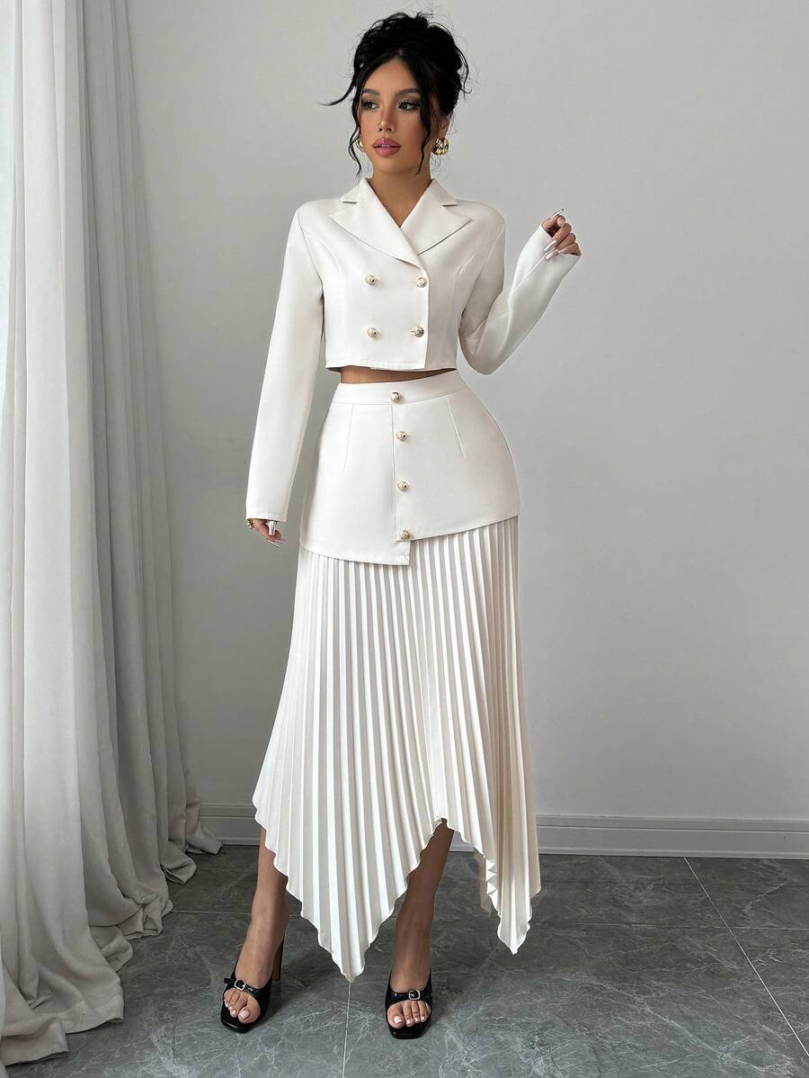 2 piezas conjunto elegante con chaqueta de cuello abotonada, drapeado y pliegues asimetricos para mujer