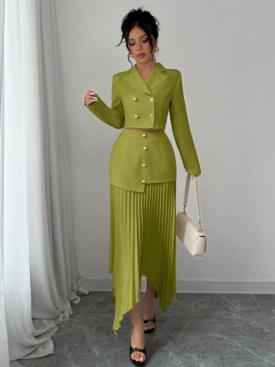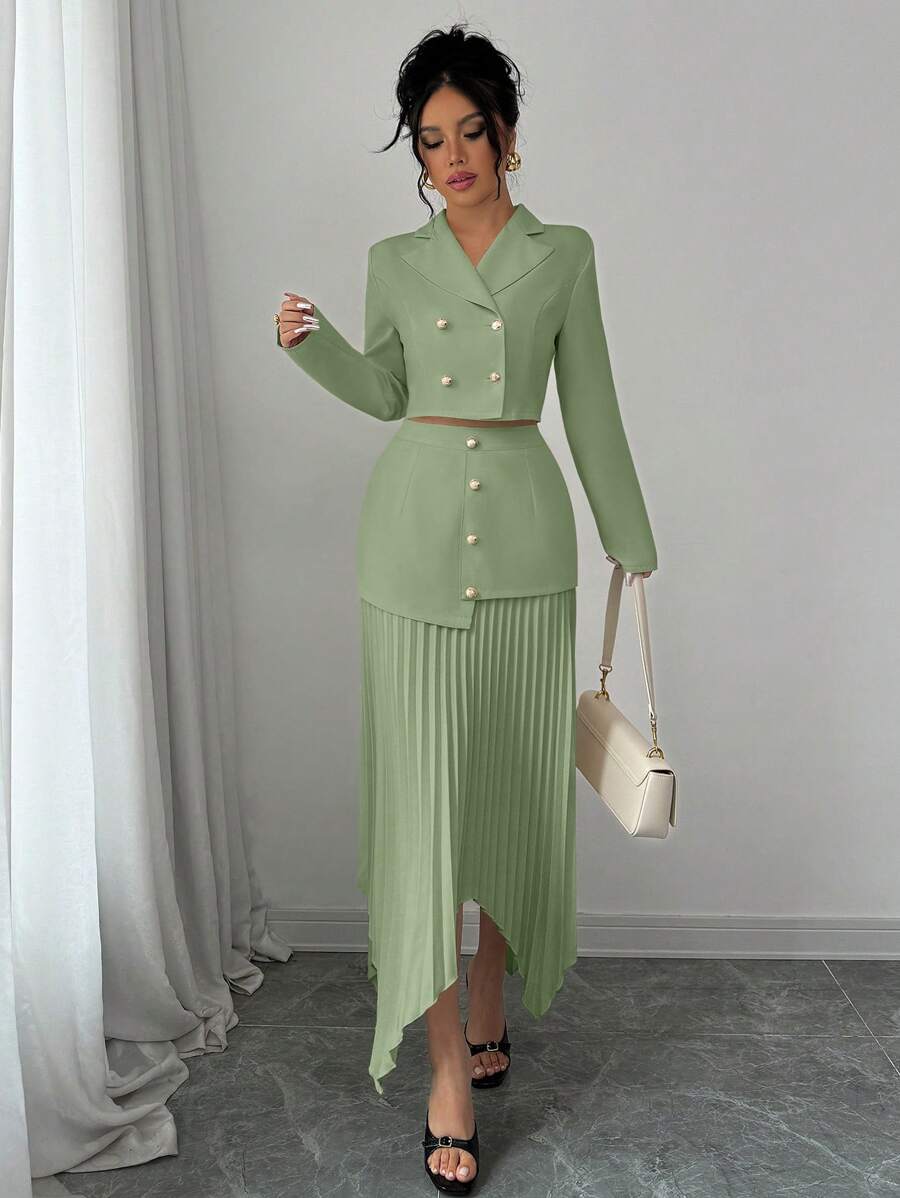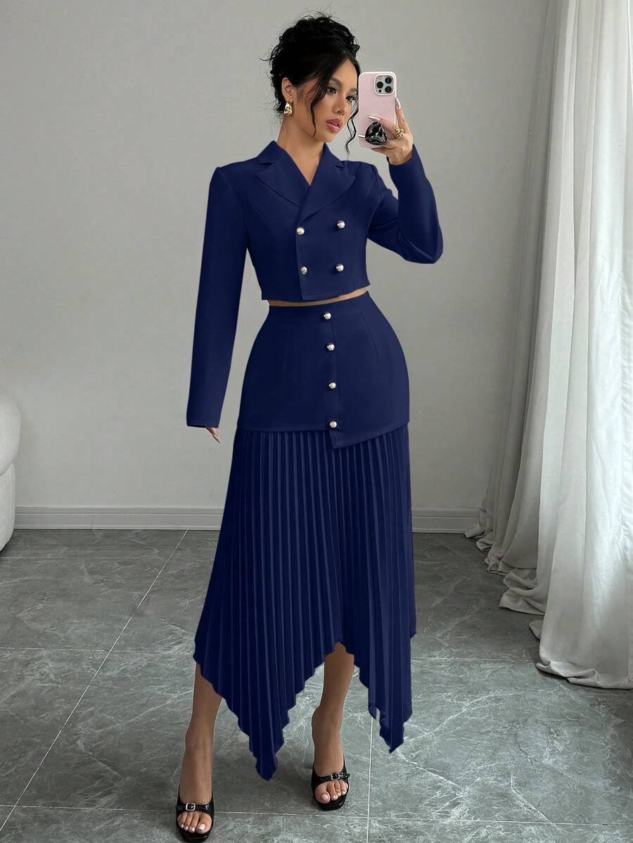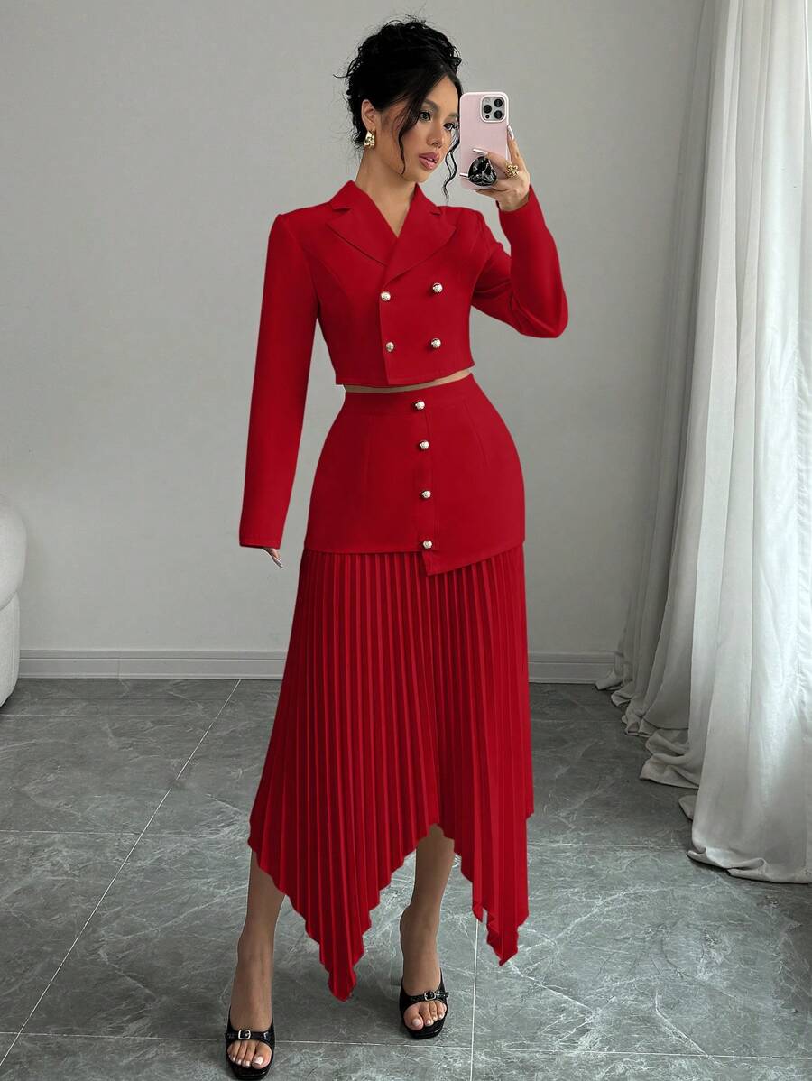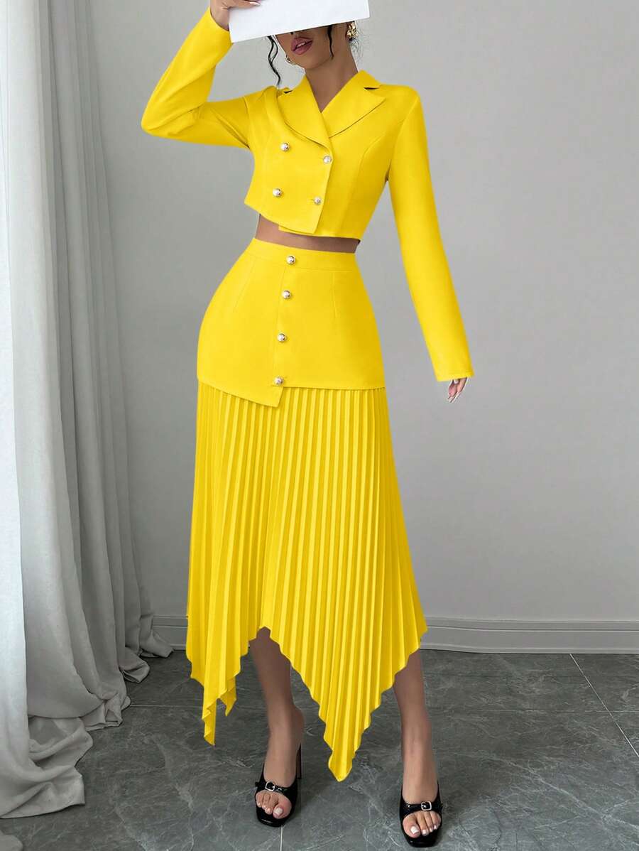 2 piezas conjunto elegante con chaqueta de cuello abotonada, drapeado y pliegues asimetricos para mujer