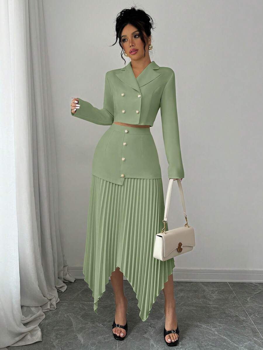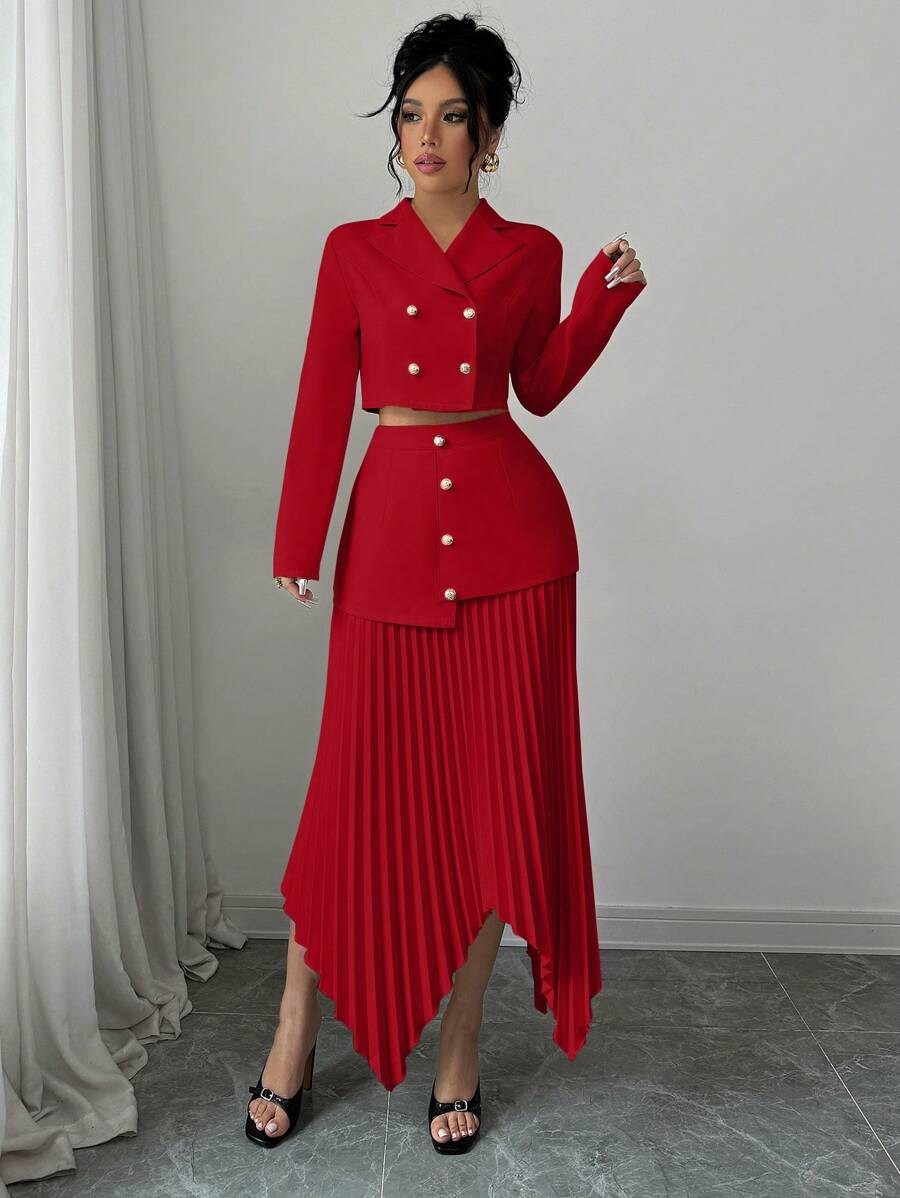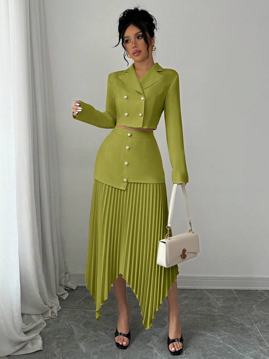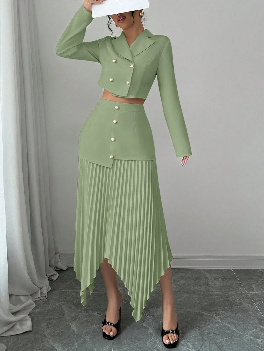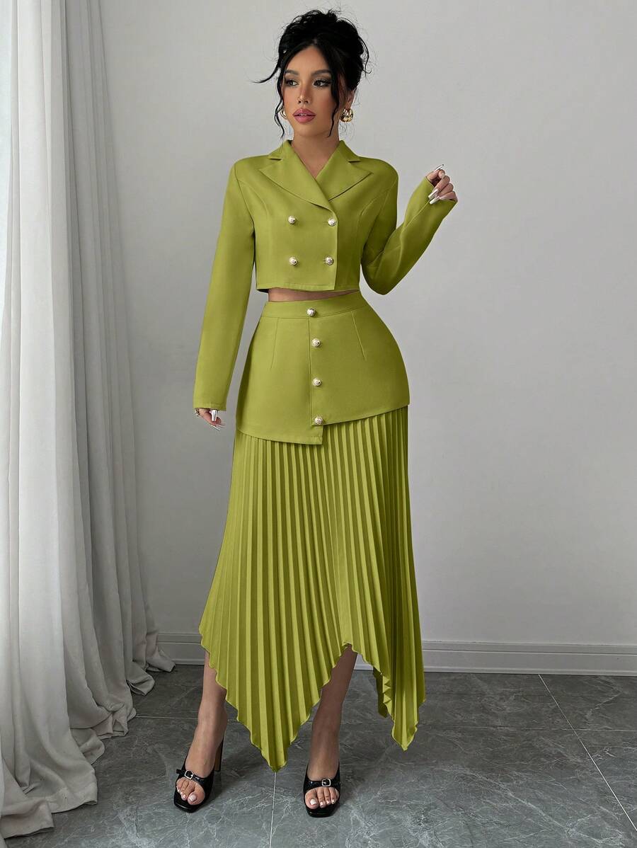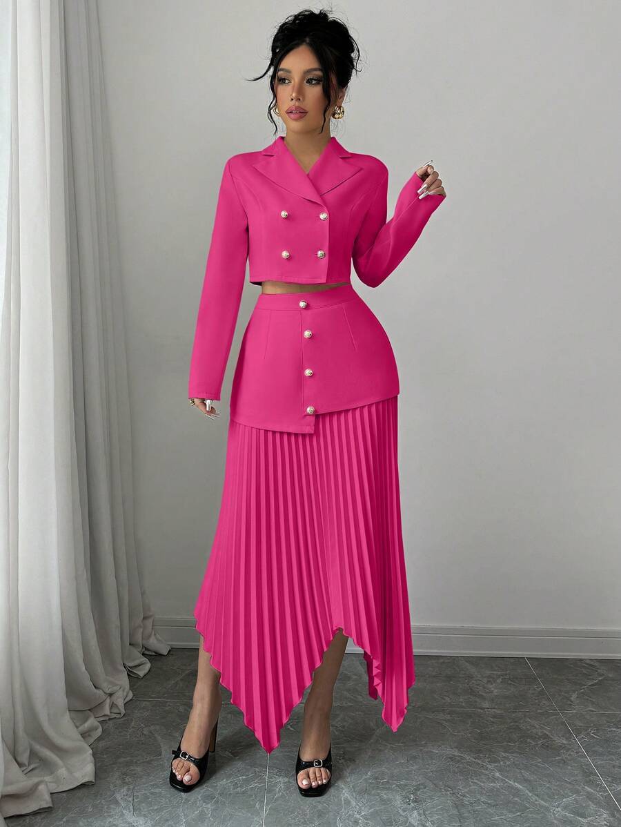 2 piezas conjunto elegante con chaqueta de cuello abotonada, drapeado y pliegues asimetricos para mujer