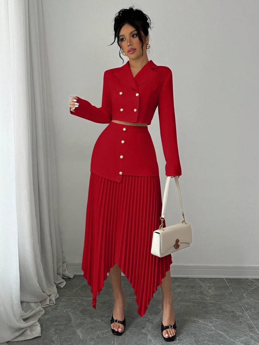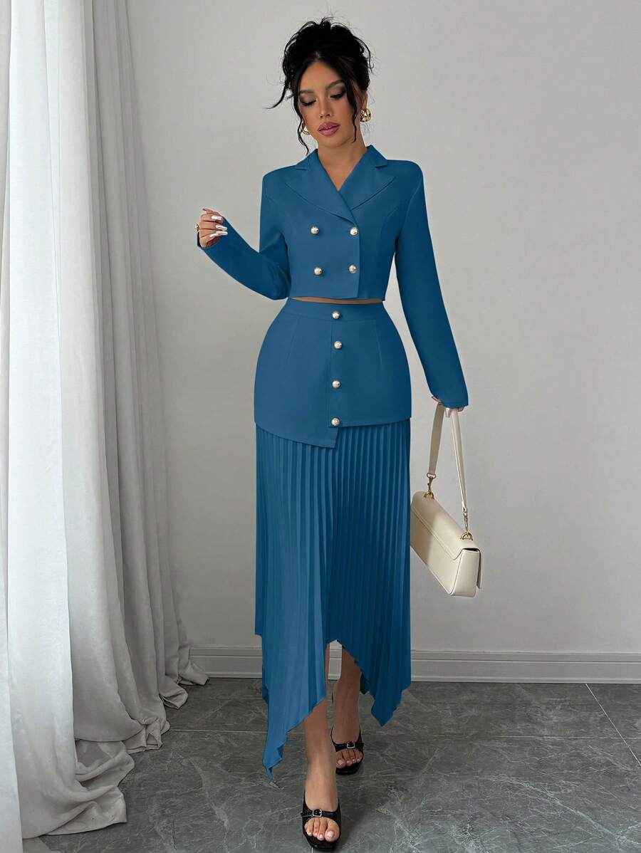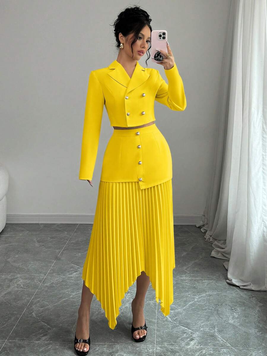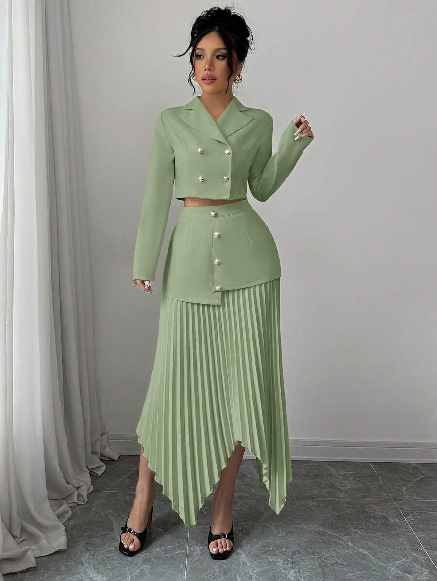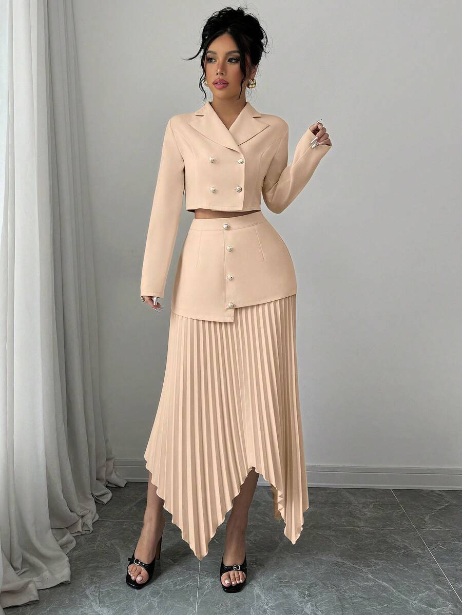 2 piezas conjunto elegante con chaqueta de cuello abotonada, drapeado y pliegues asimetricos para mujer