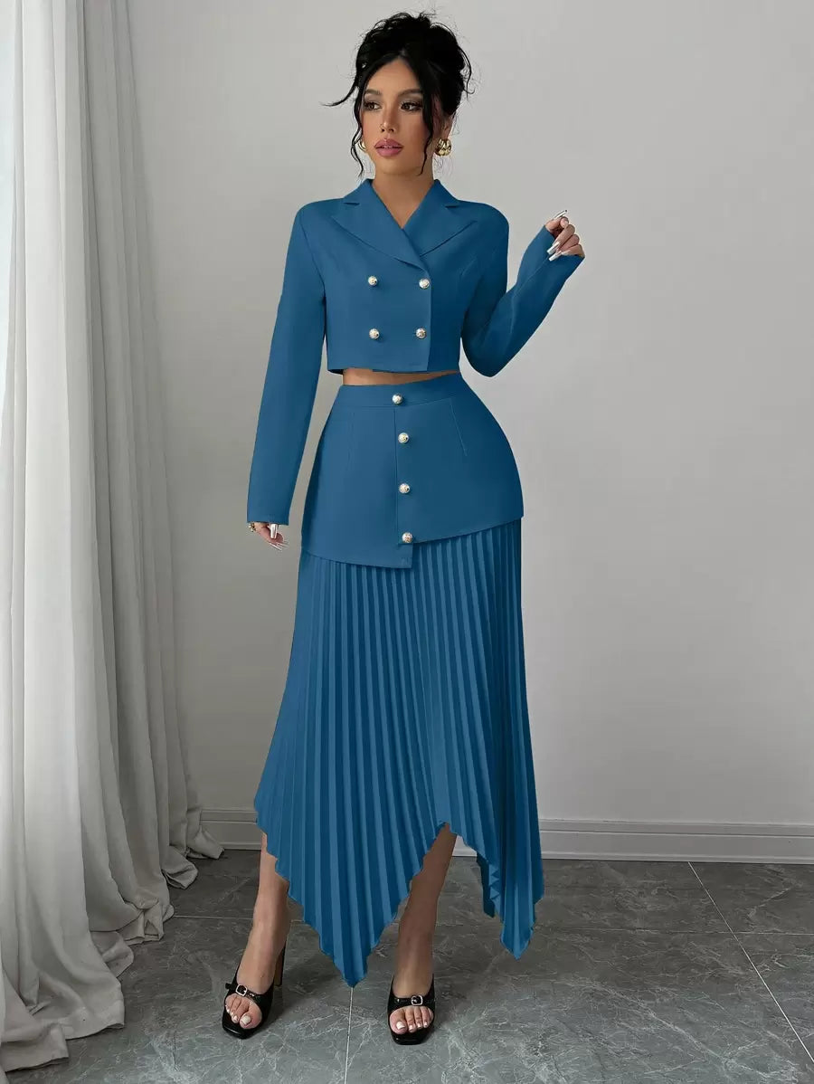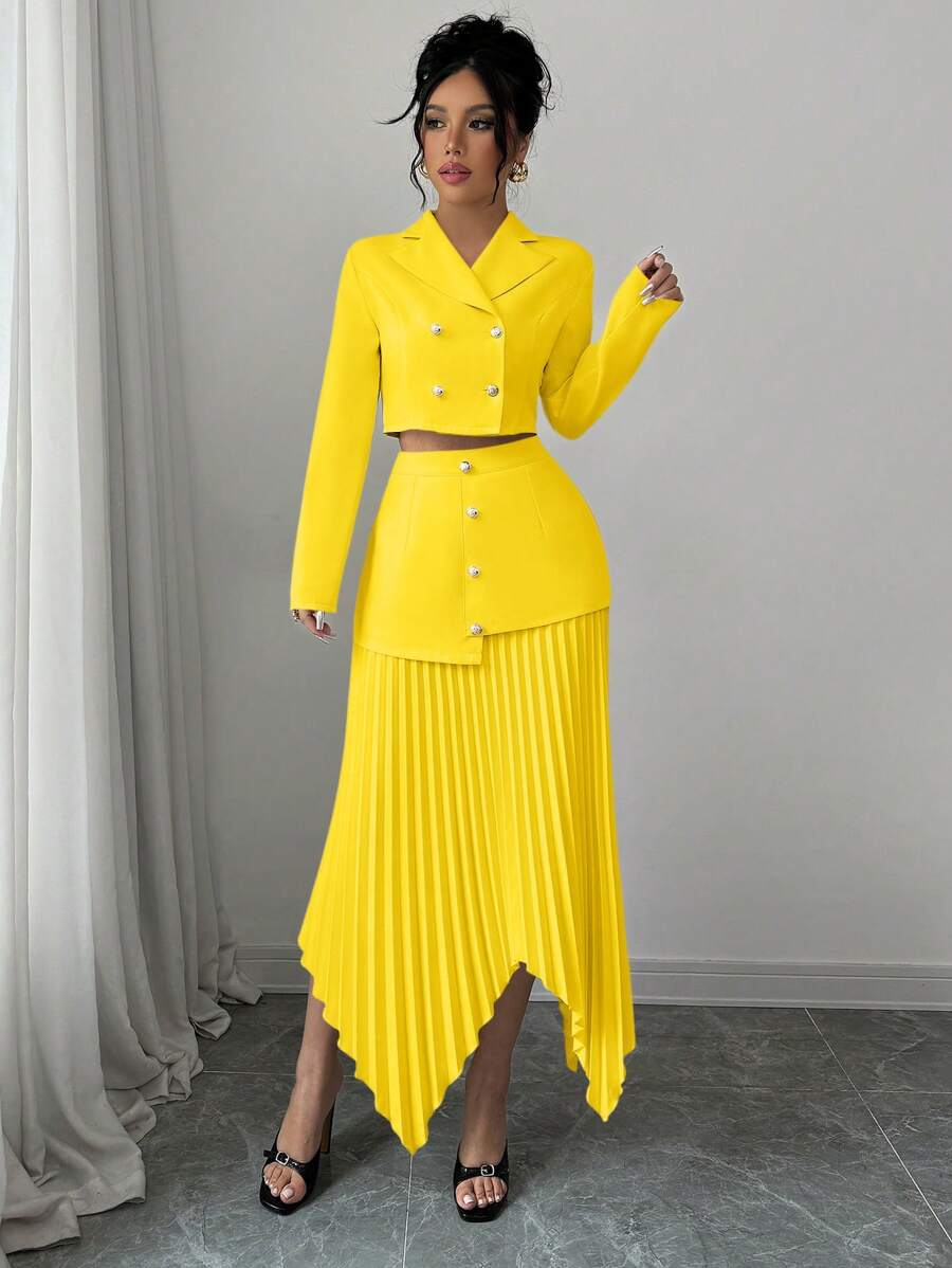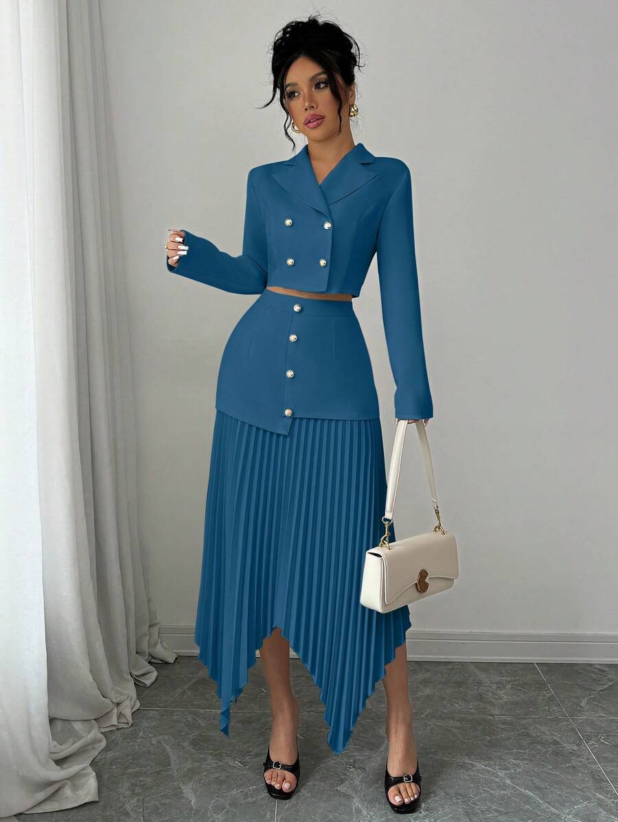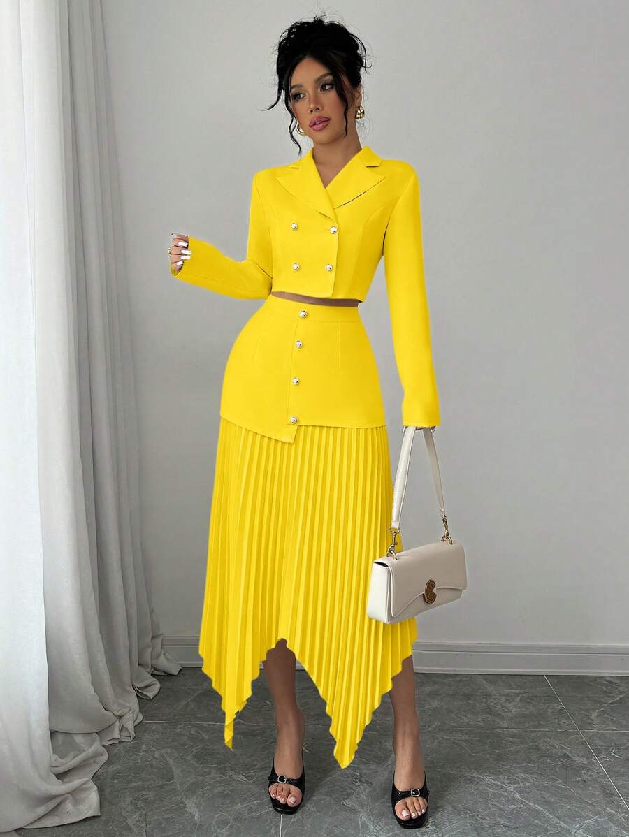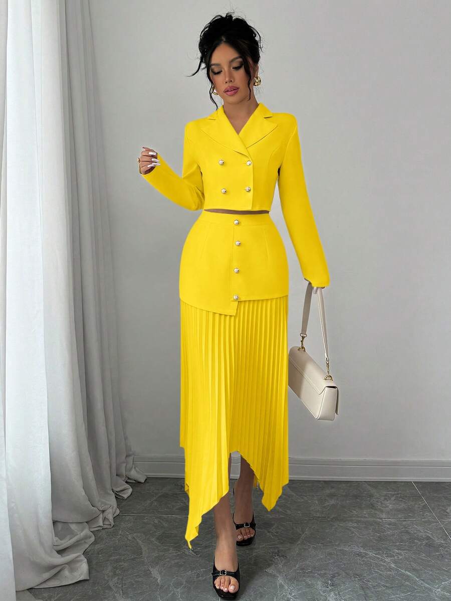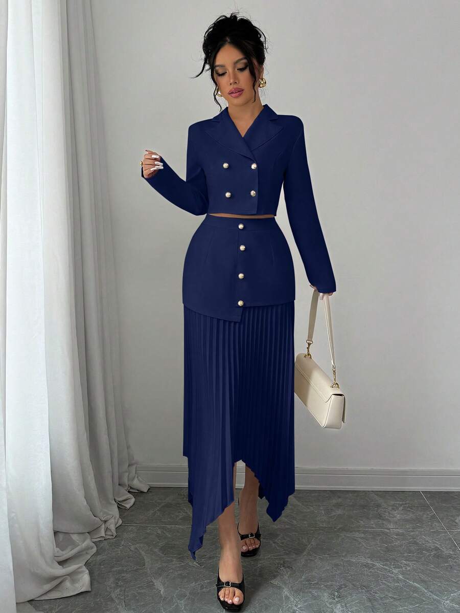 2 piezas conjunto elegante con chaqueta de cuello abotonada, drapeado y pliegues asimetricos para mujer