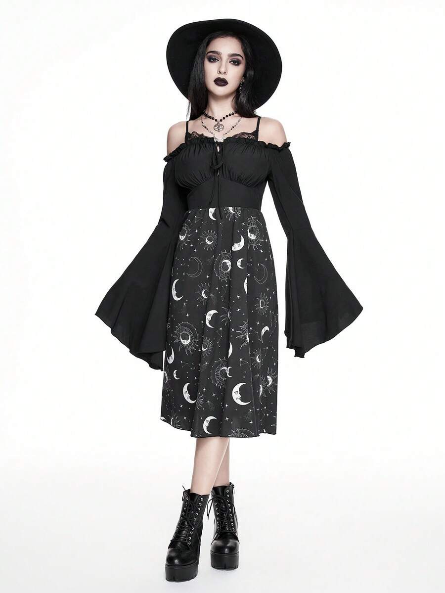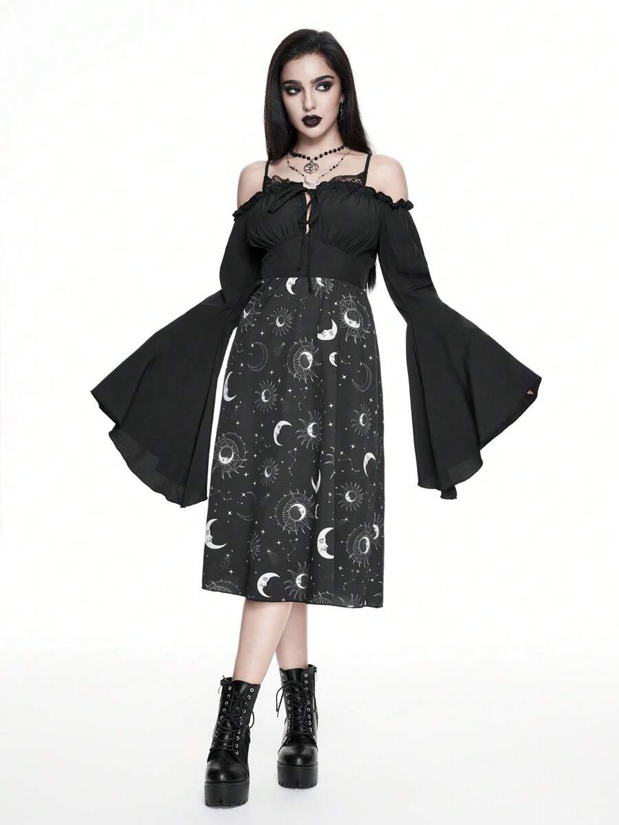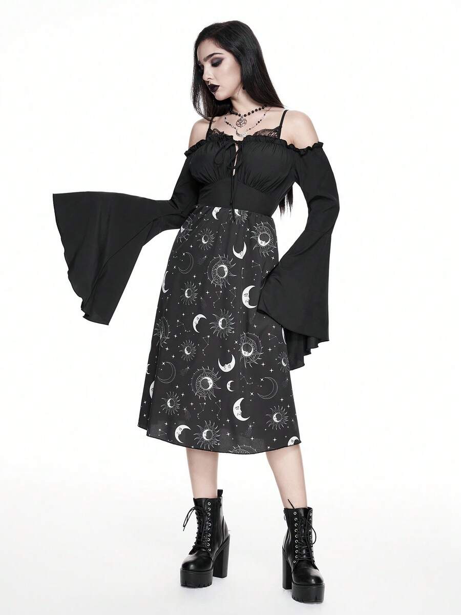 Vestido midi con hombros descubiertos, mangas acampanadas, encaje y lazo para mujer, con estampado gotico de luna, estrellas y bosque