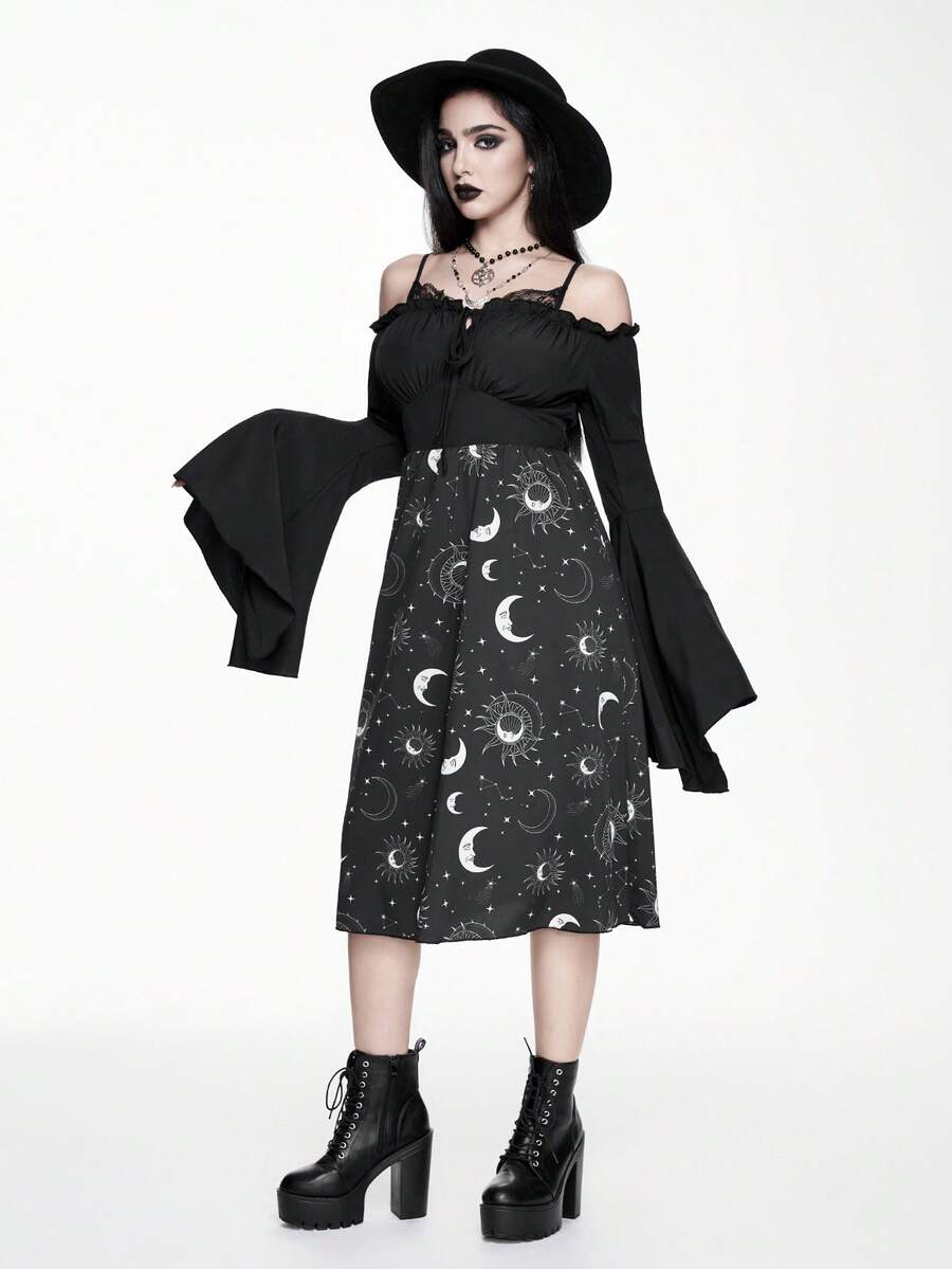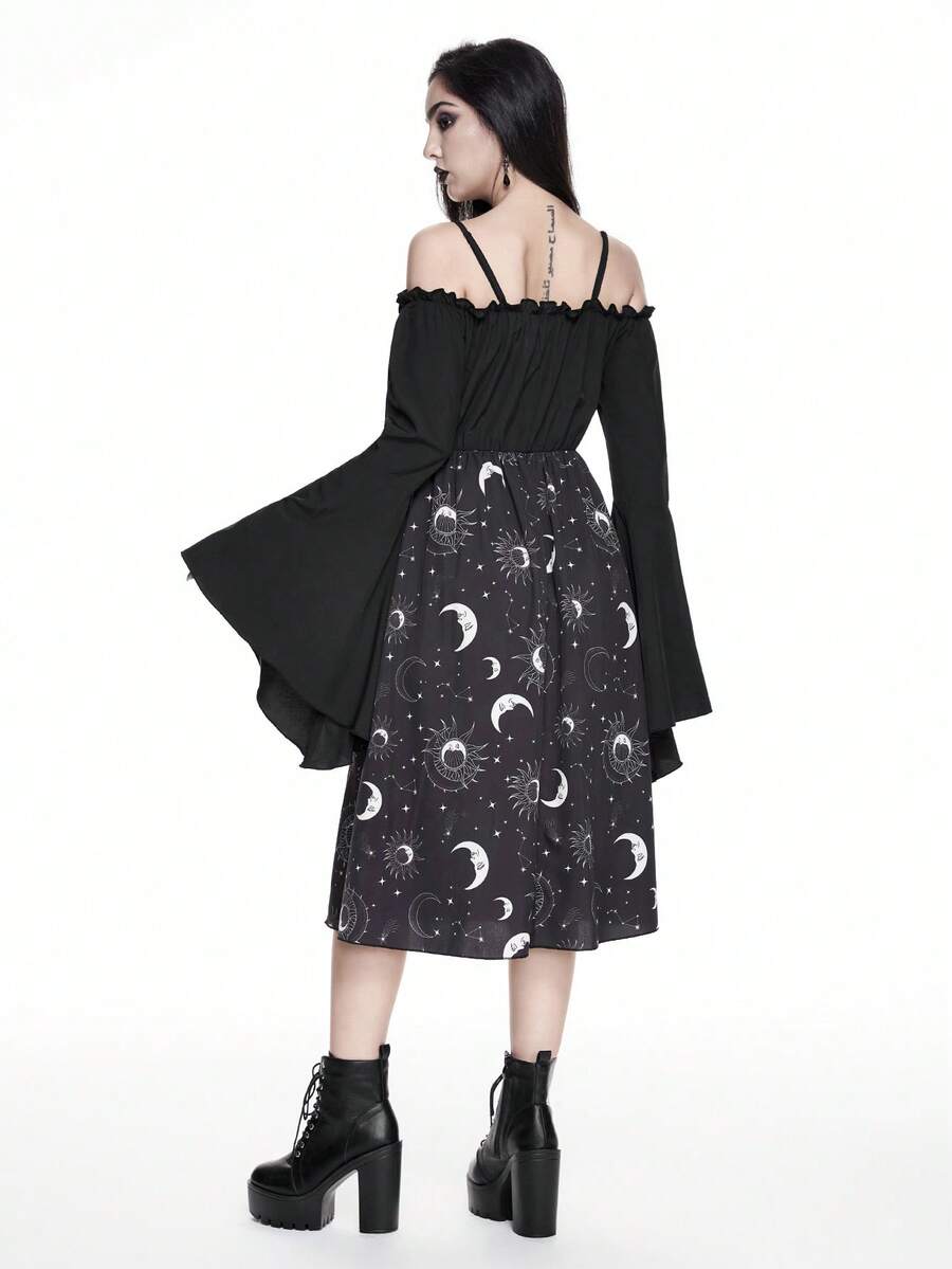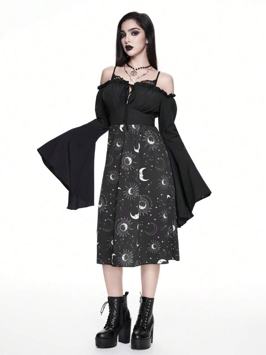 Vestido midi con hombros descubiertos, mangas acampanadas, encaje y lazo para mujer, con estampado gotico de luna, estrellas y bosque