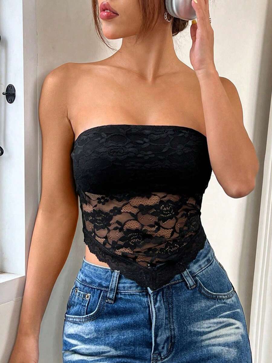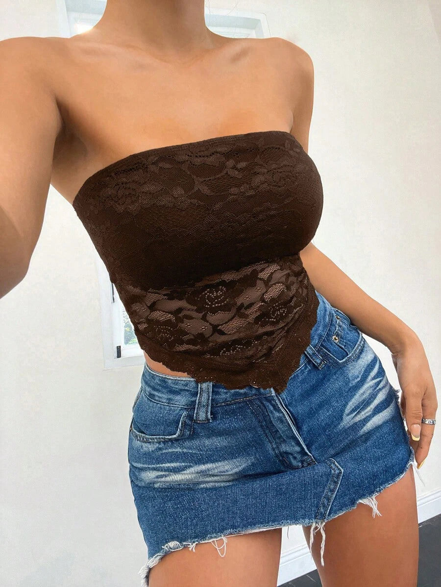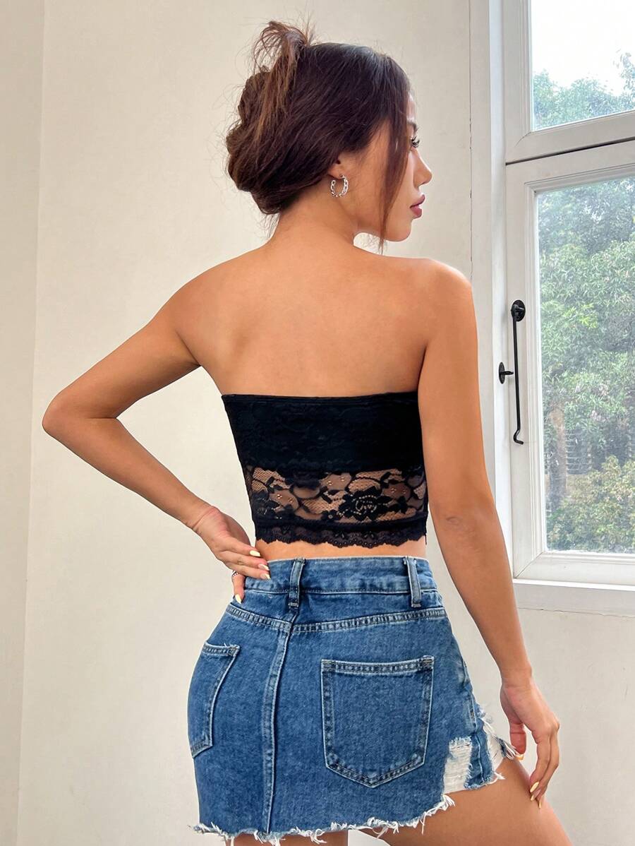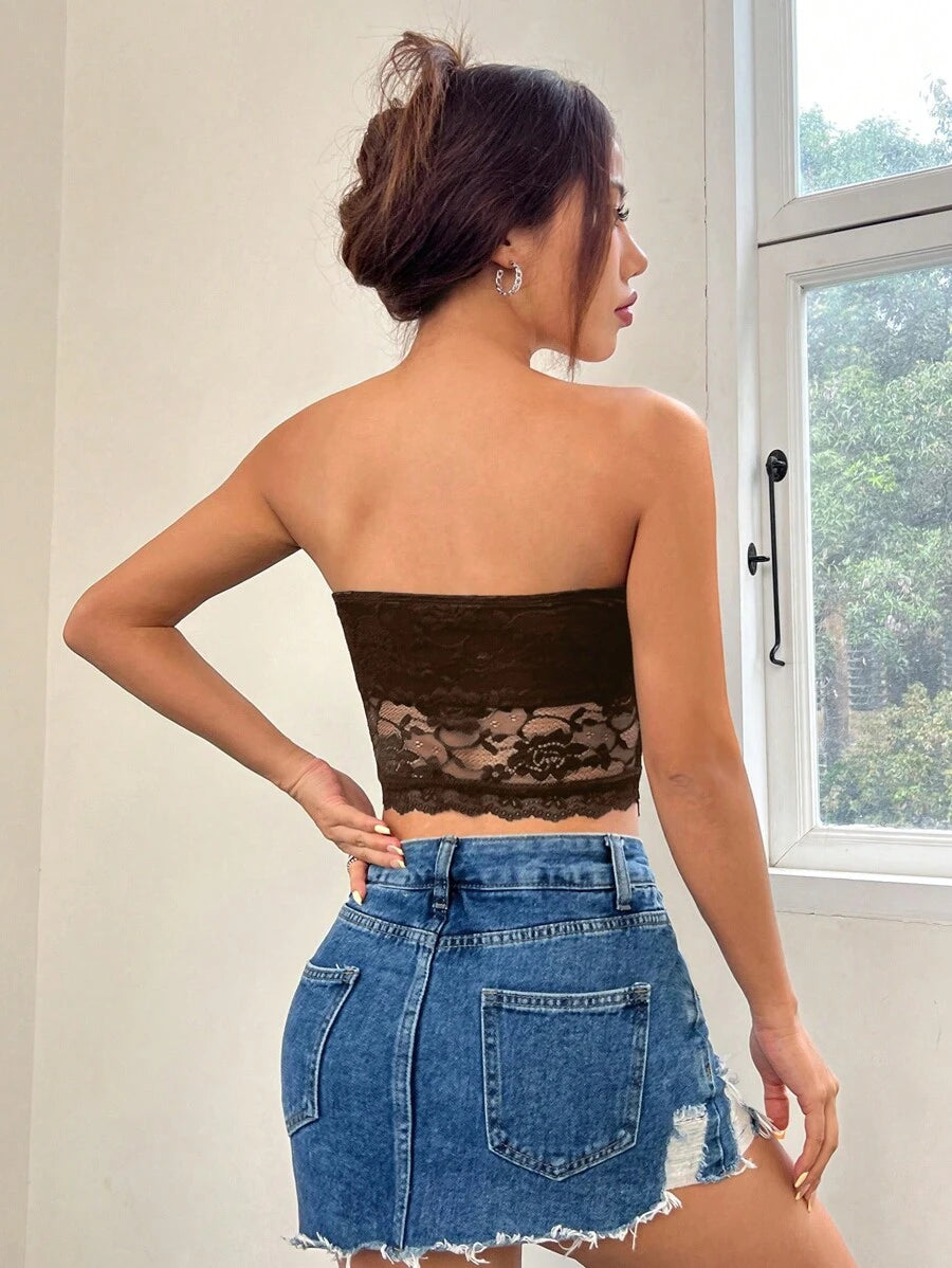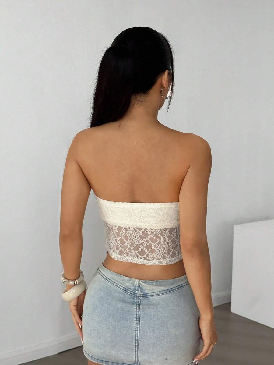 Top de brasier sin tirantes minimalista con borde de encaje, ropa de uso cotidiano casual para damas