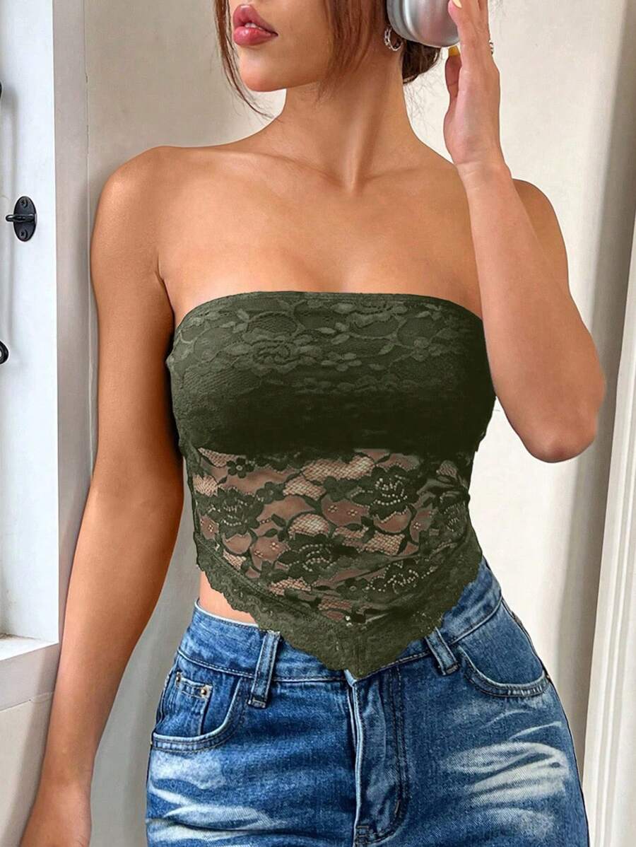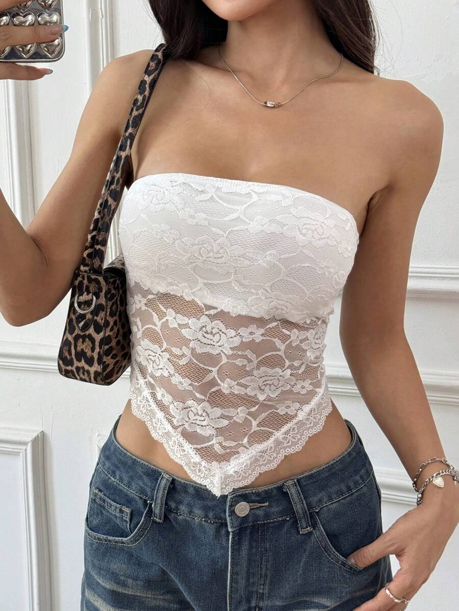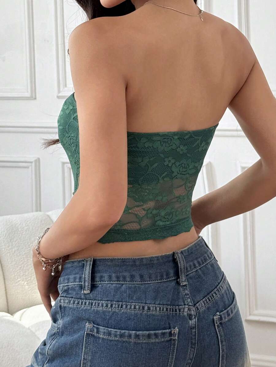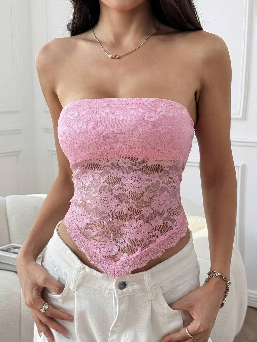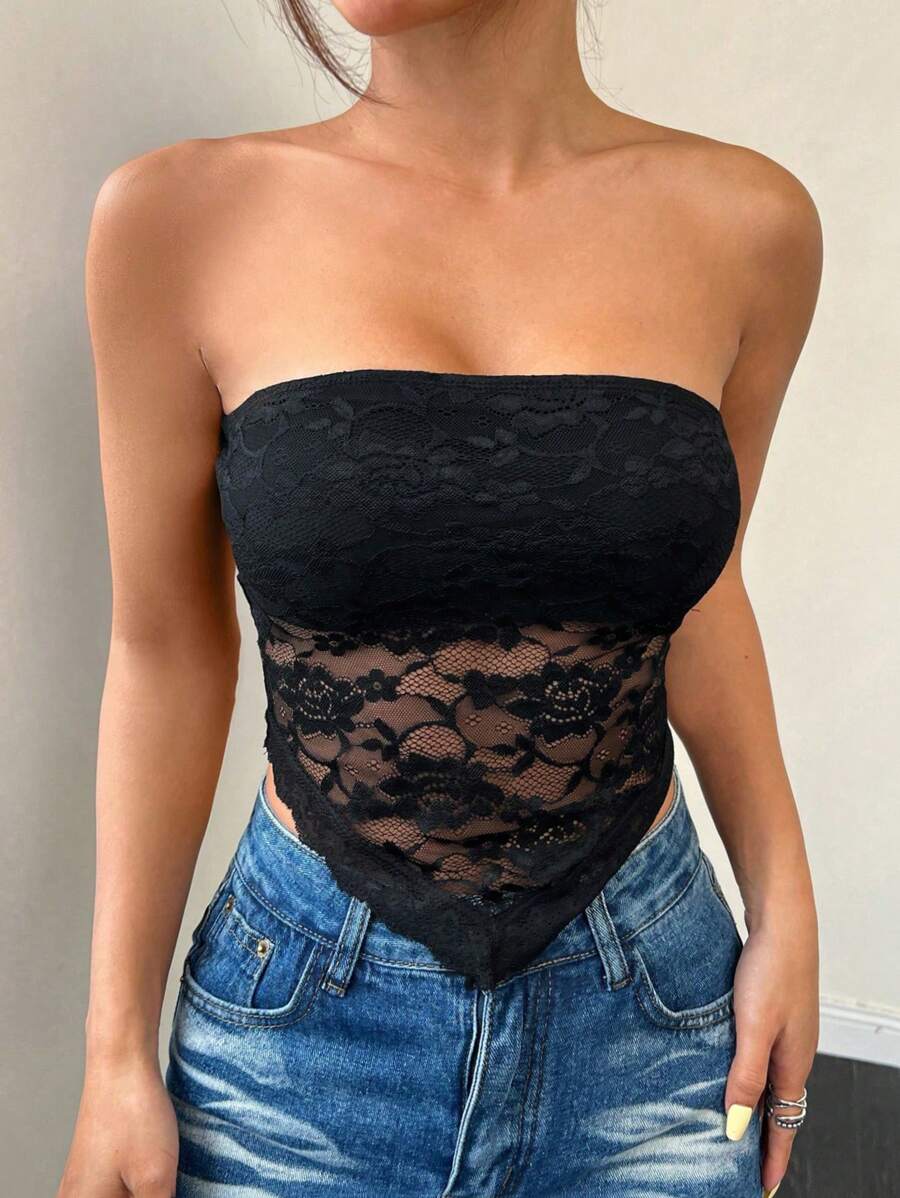 Top de brasier sin tirantes minimalista con borde de encaje, ropa de uso cotidiano casual para damas