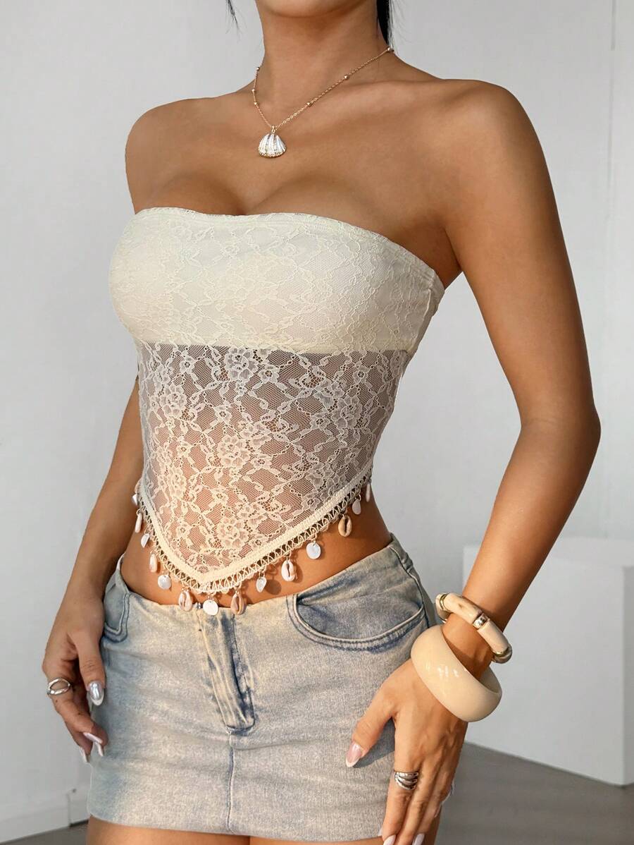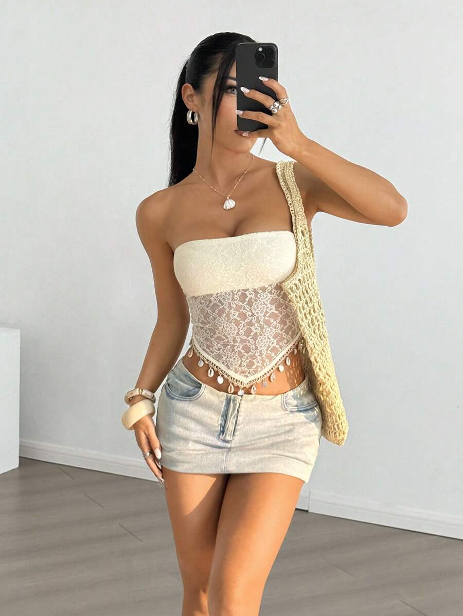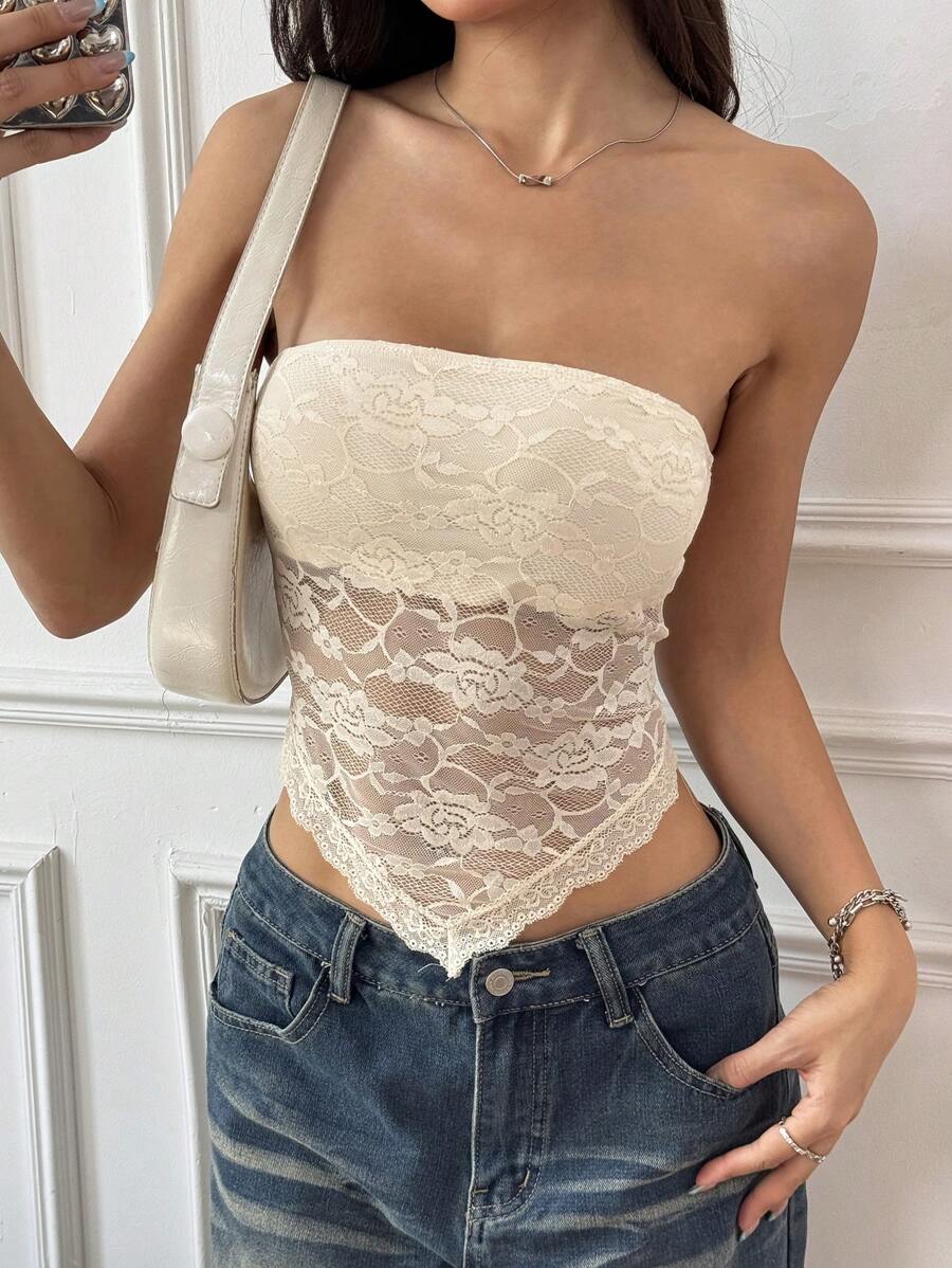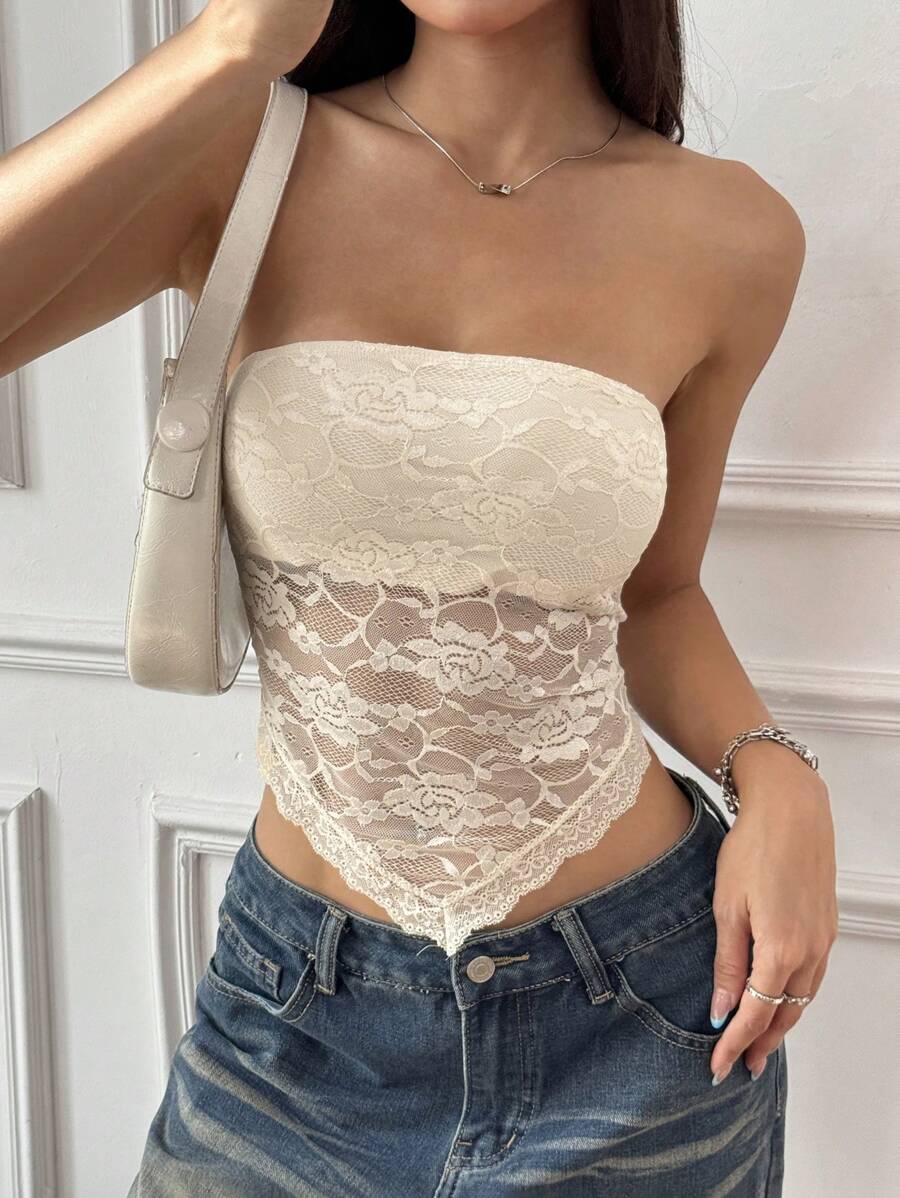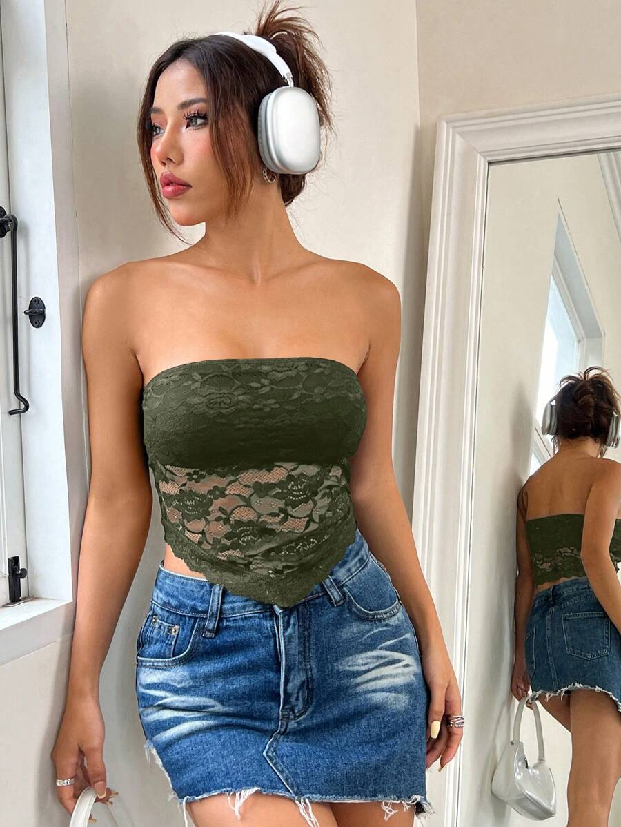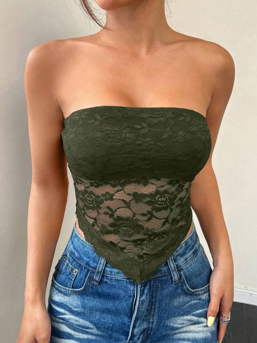 Top de brasier sin tirantes minimalista con borde de encaje, ropa de uso cotidiano casual para damas