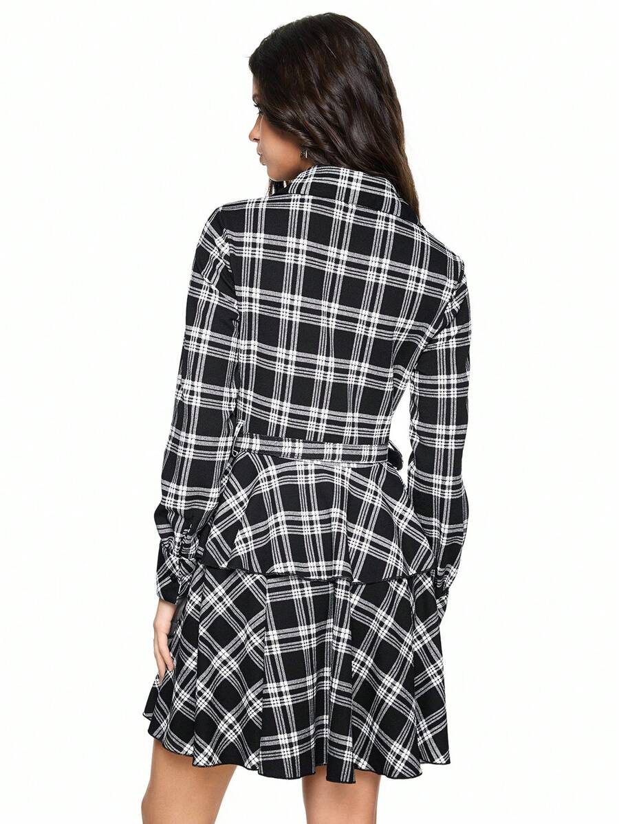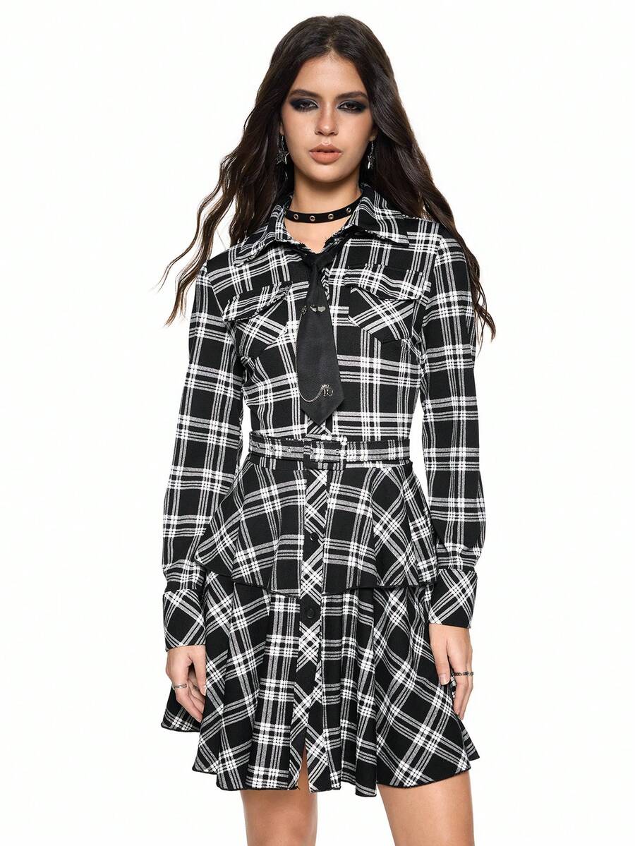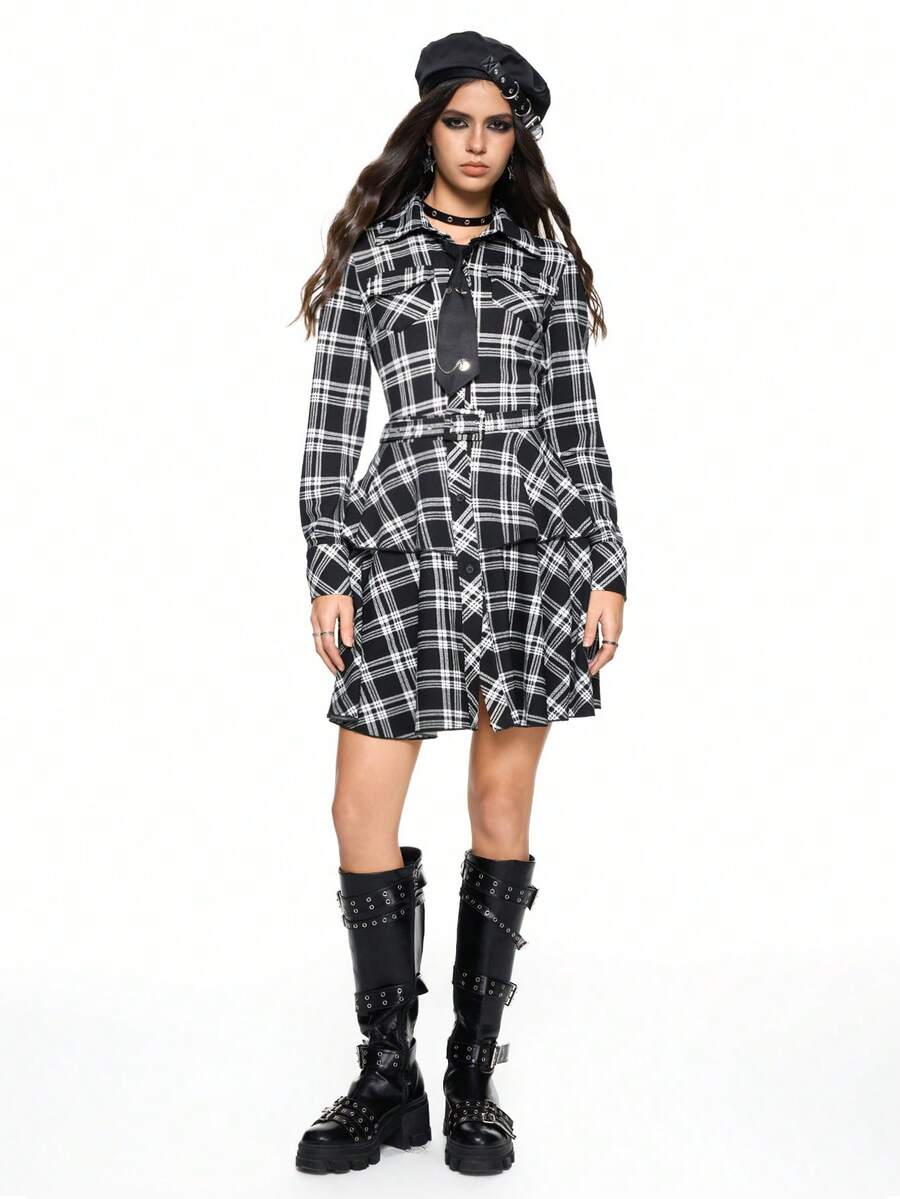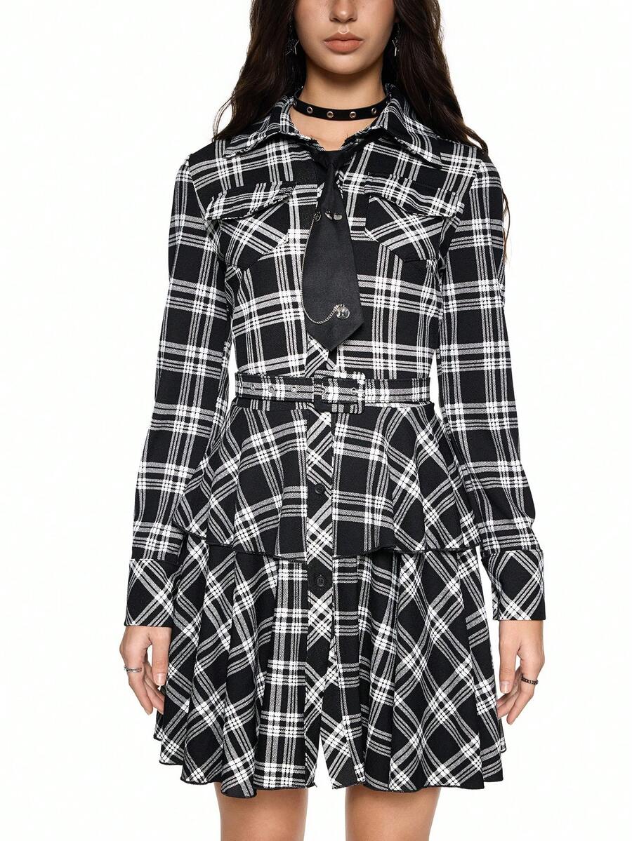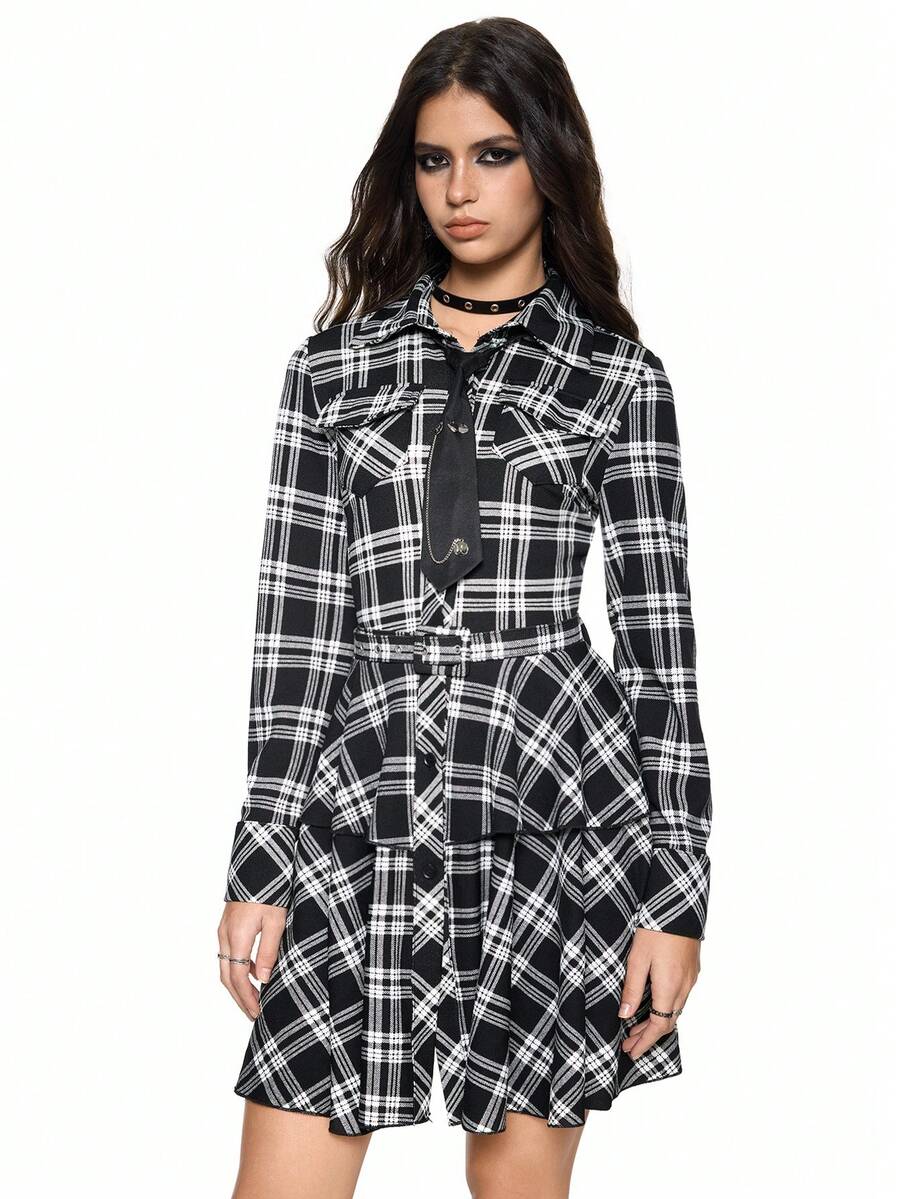 Vestido minifalda ajustado de estilo universitario punk con estampado de cuadros (incluye accesorios de metal tipo corbata)