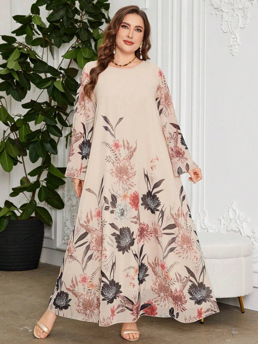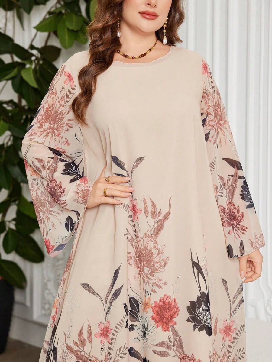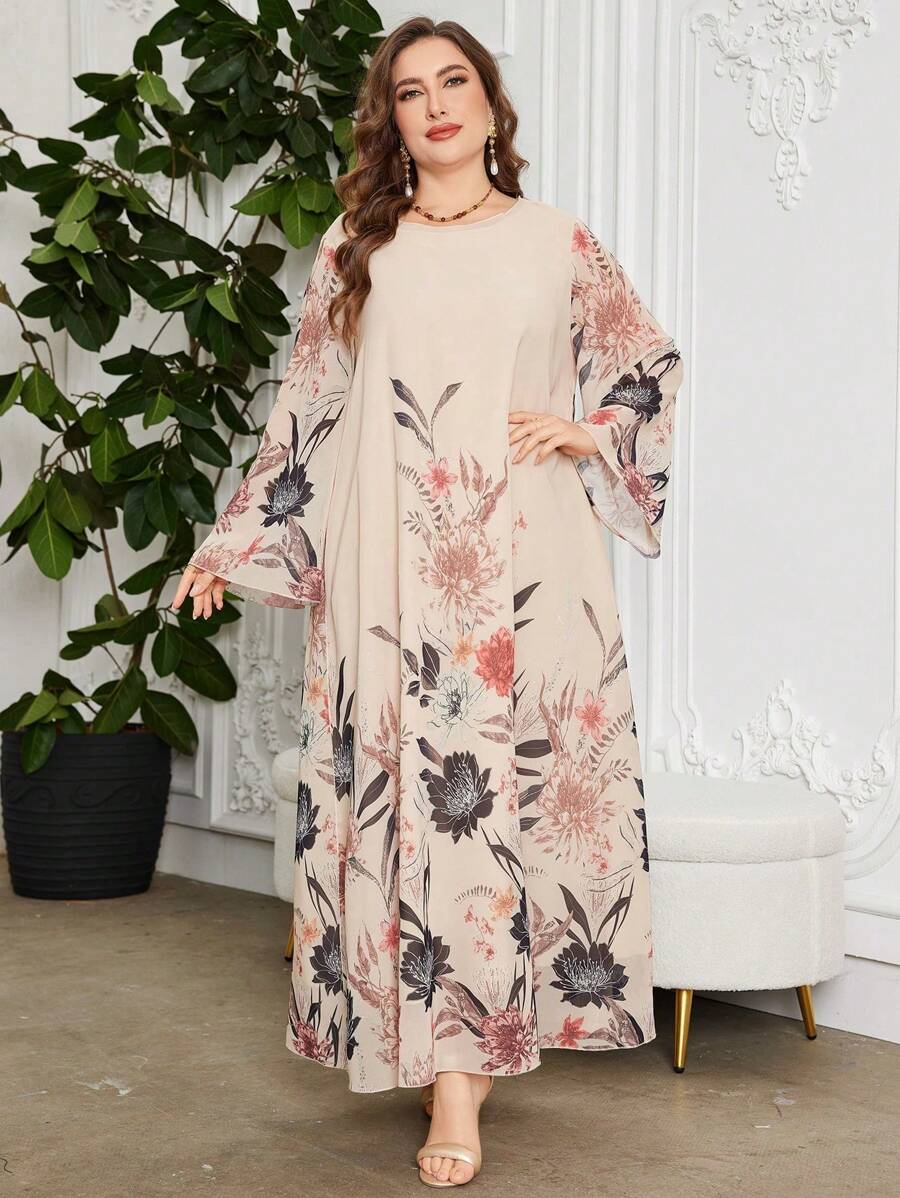 Al najma vestido elegante y romantico de gasa con estampado floral, cuello redondo y manga acampanada para mujer talla grande