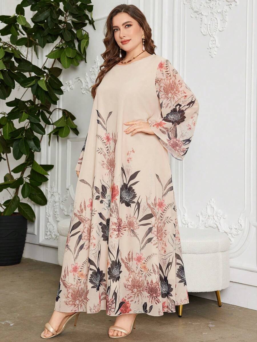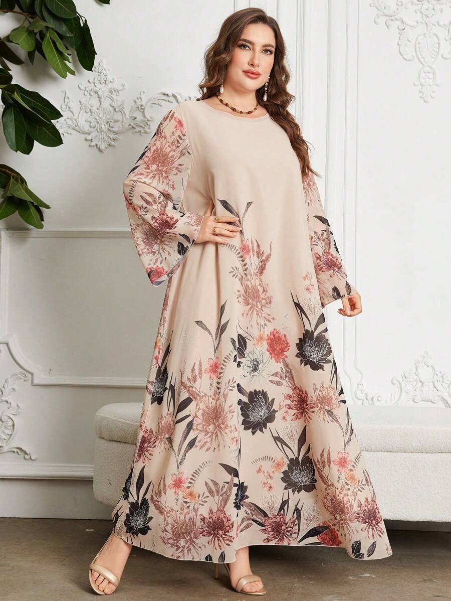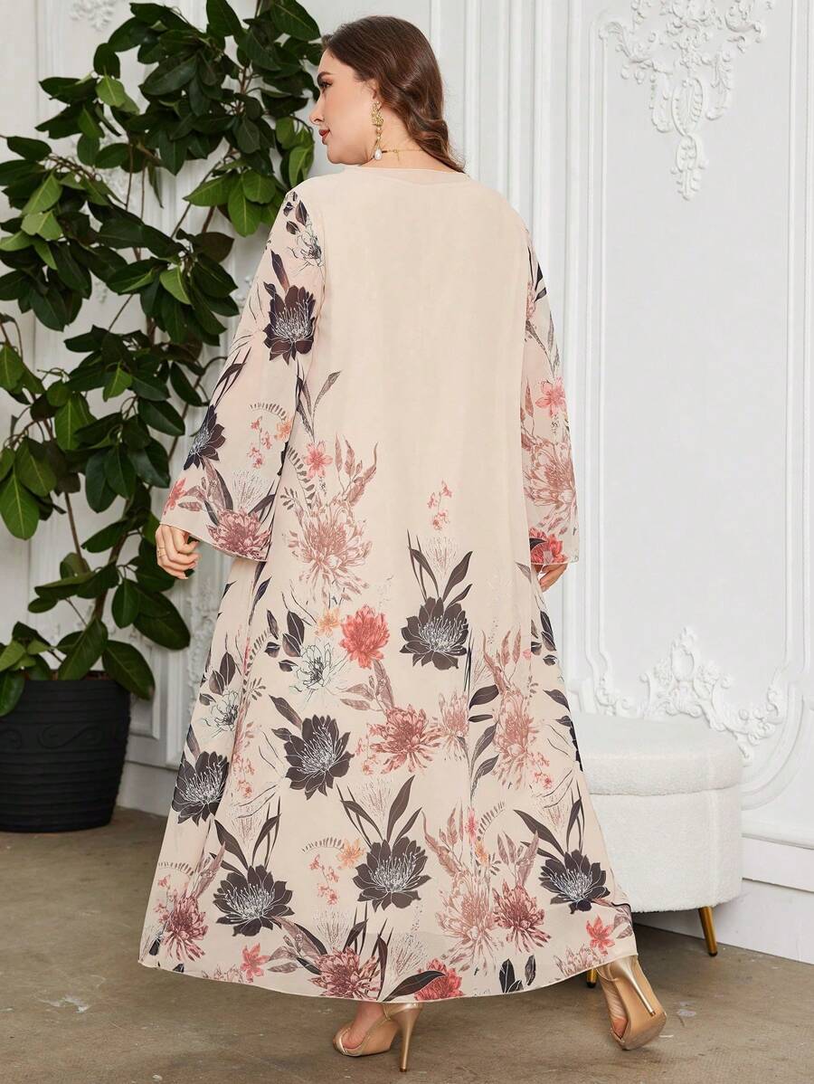 Al najma vestido elegante y romantico de gasa con estampado floral, cuello redondo y manga acampanada para mujer talla grande