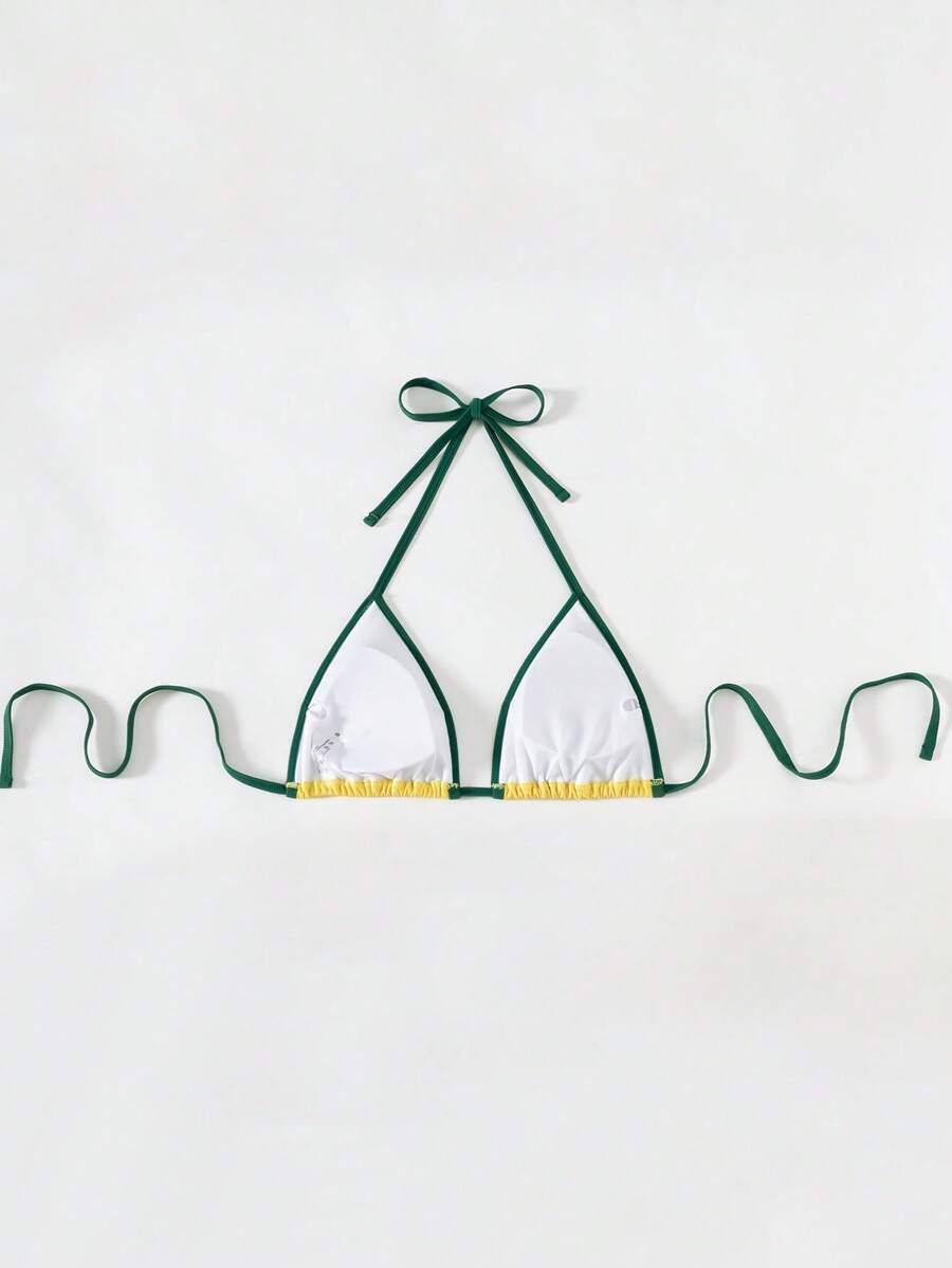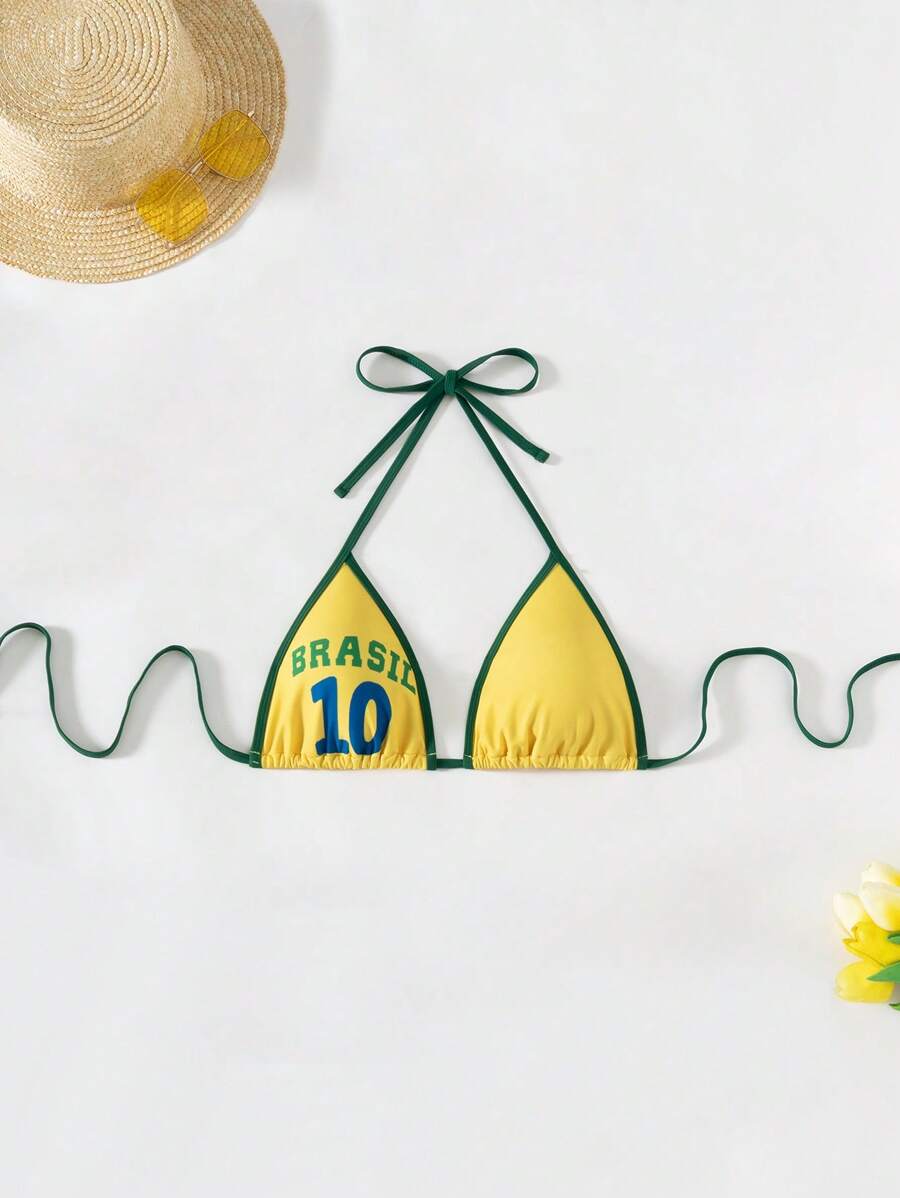 1 pieza parte superior de traje de bano de verano con impresion locacional, diseno halter, espalda descubierta y nudo en la espalda