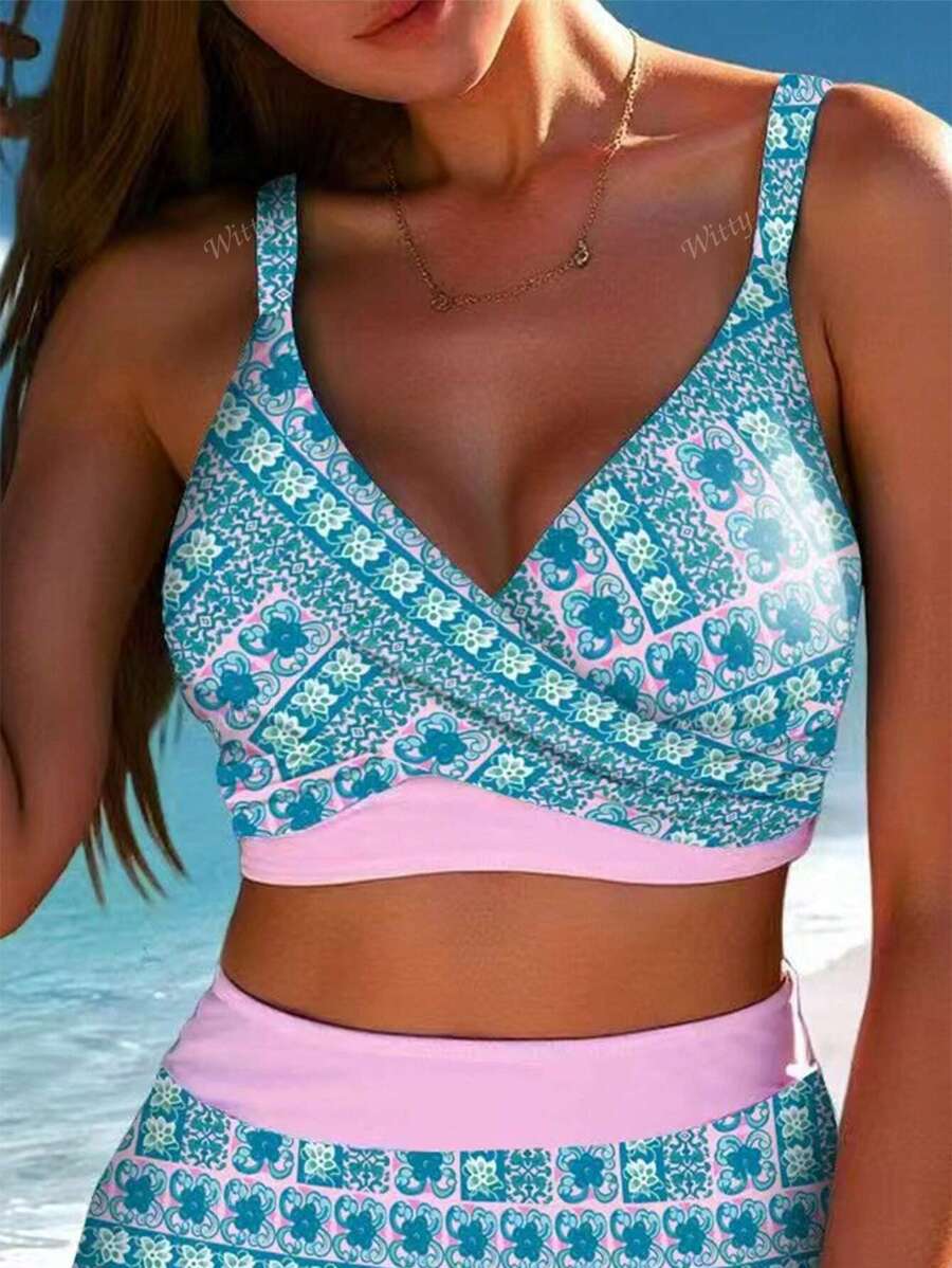 Conjunto de 3 piezas con top de tirantes acolchado con estampado aleatorio, shorts de talle alto y tangas de bikini triangulares, para primavera/verano