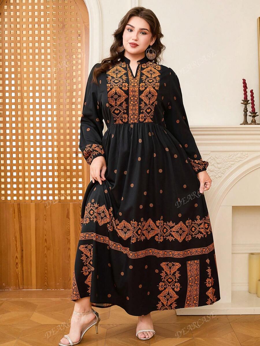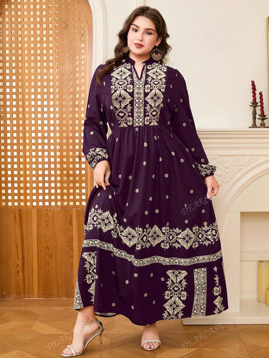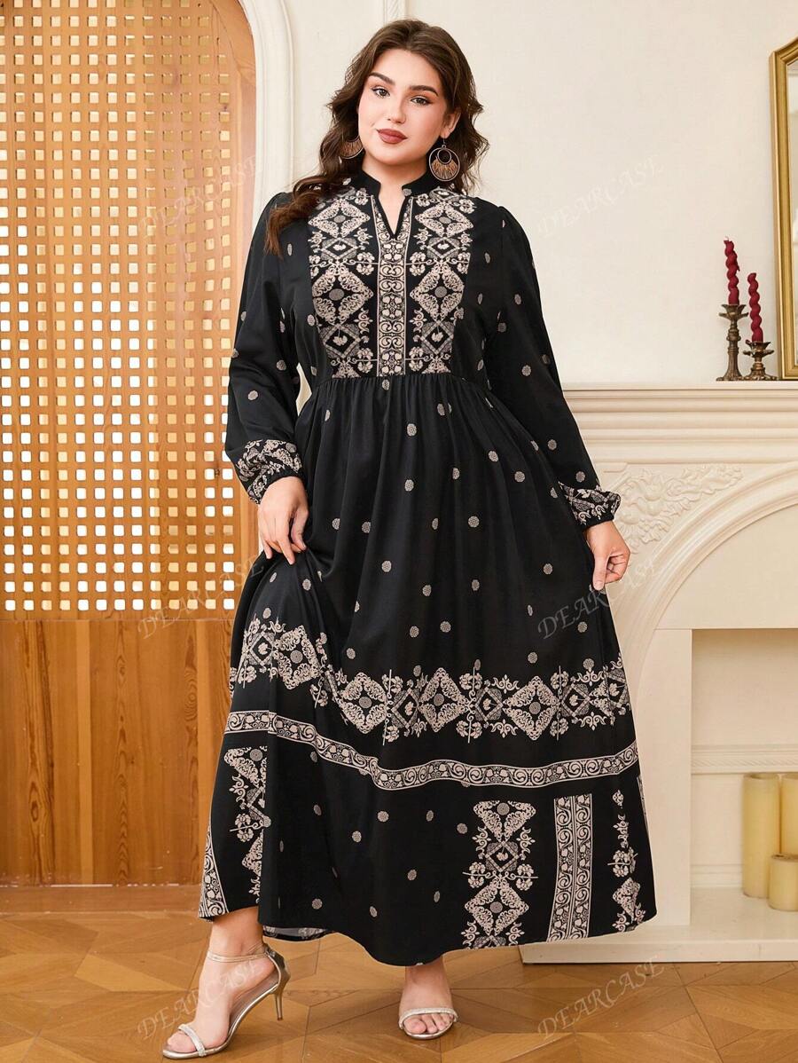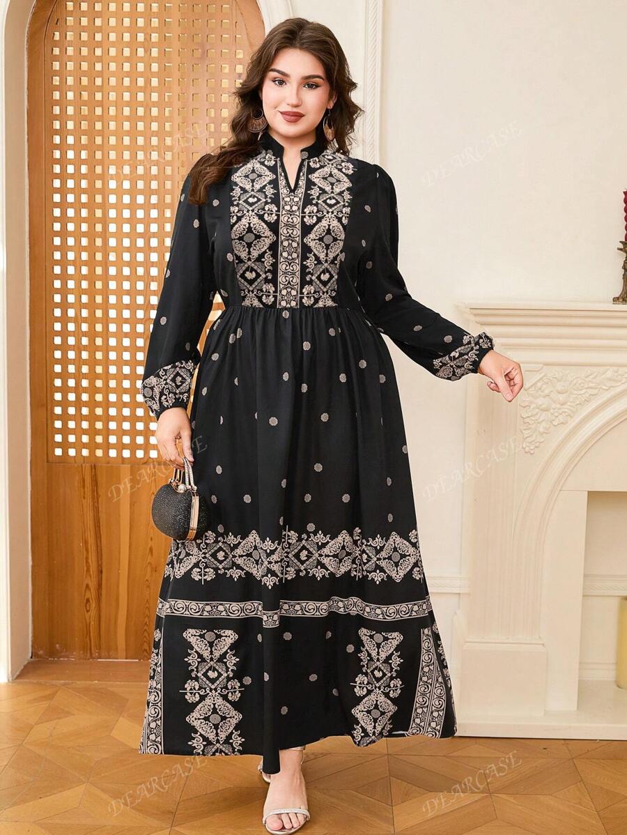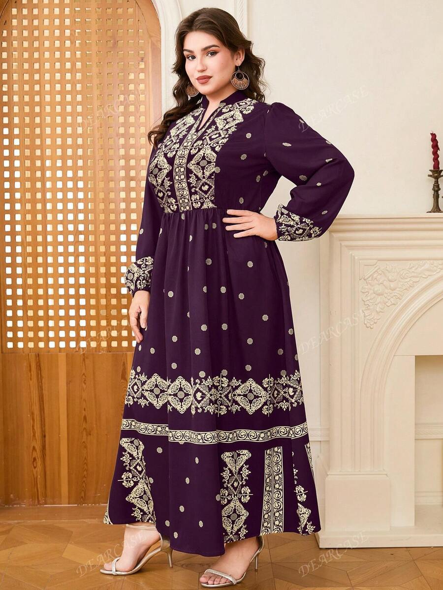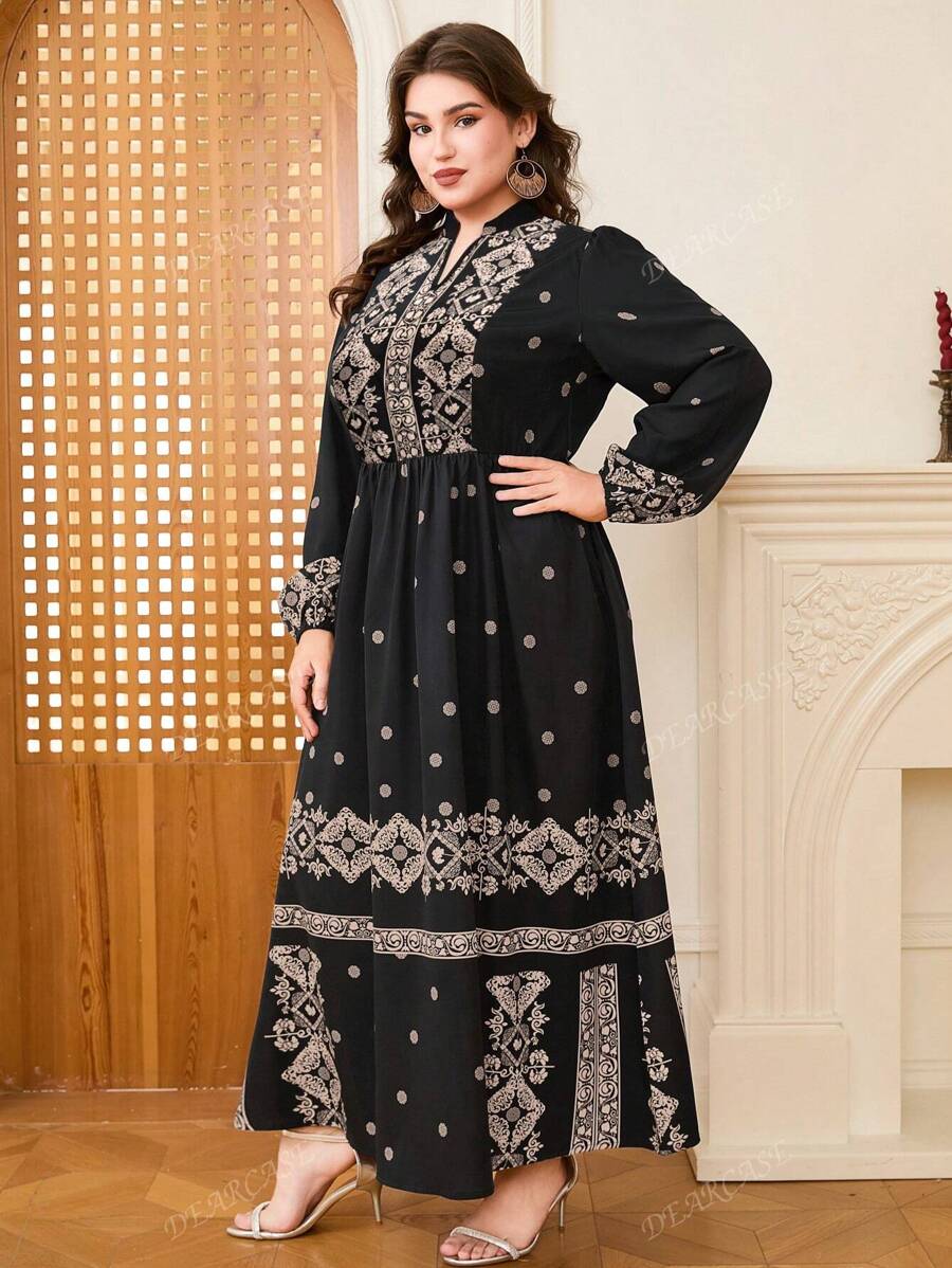 Vestido midi minimalista de manga larga con cuello en v y estampado para tallas grandes