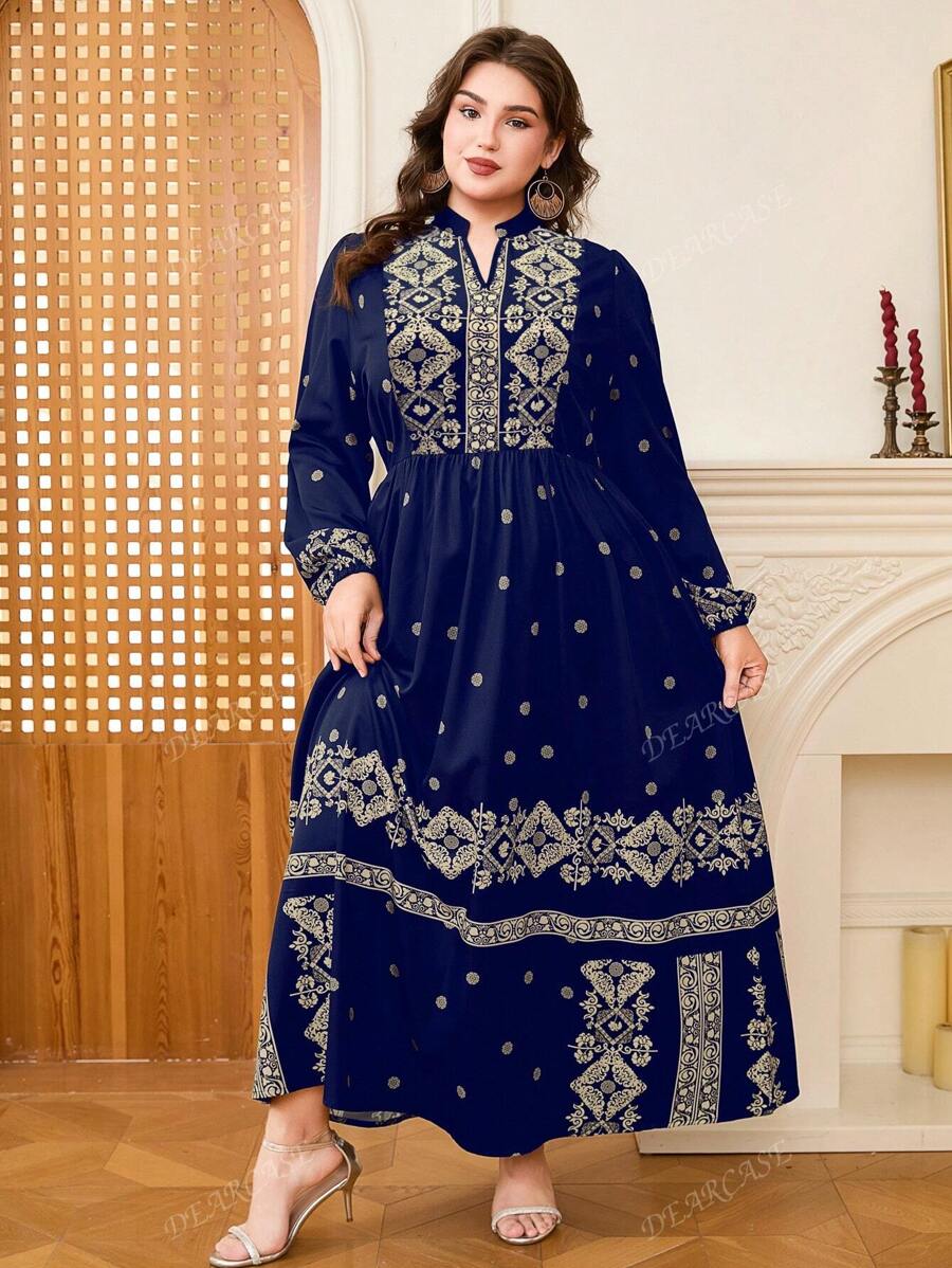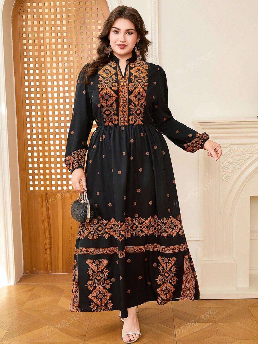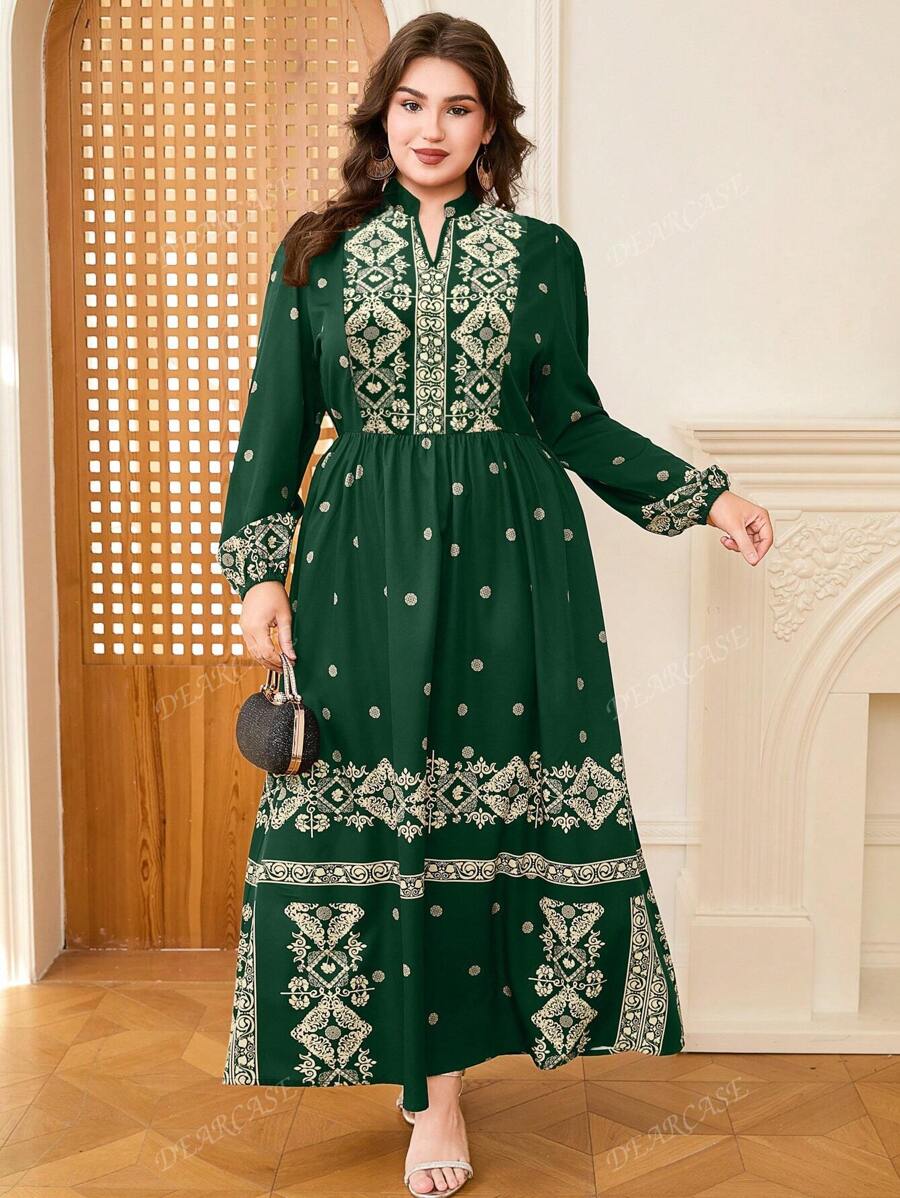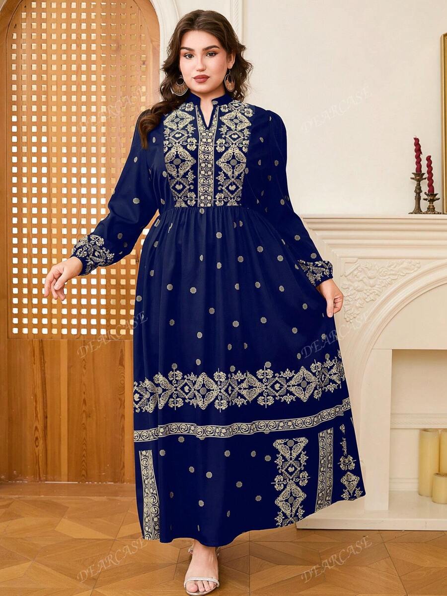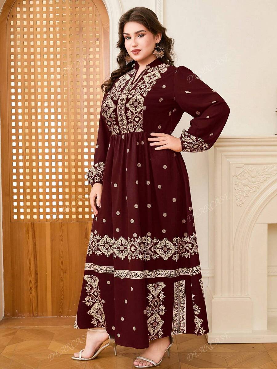 Vestido midi minimalista de manga larga con cuello en v y estampado para tallas grandes