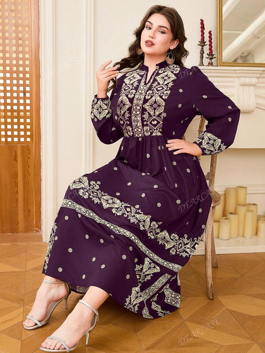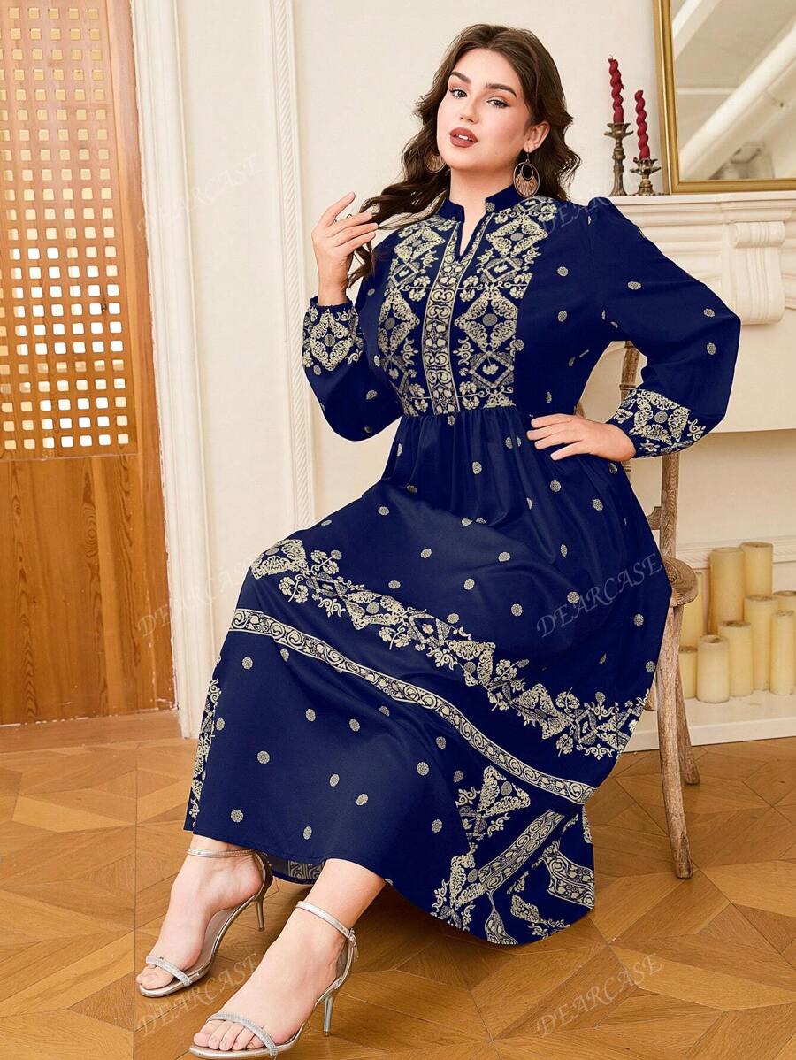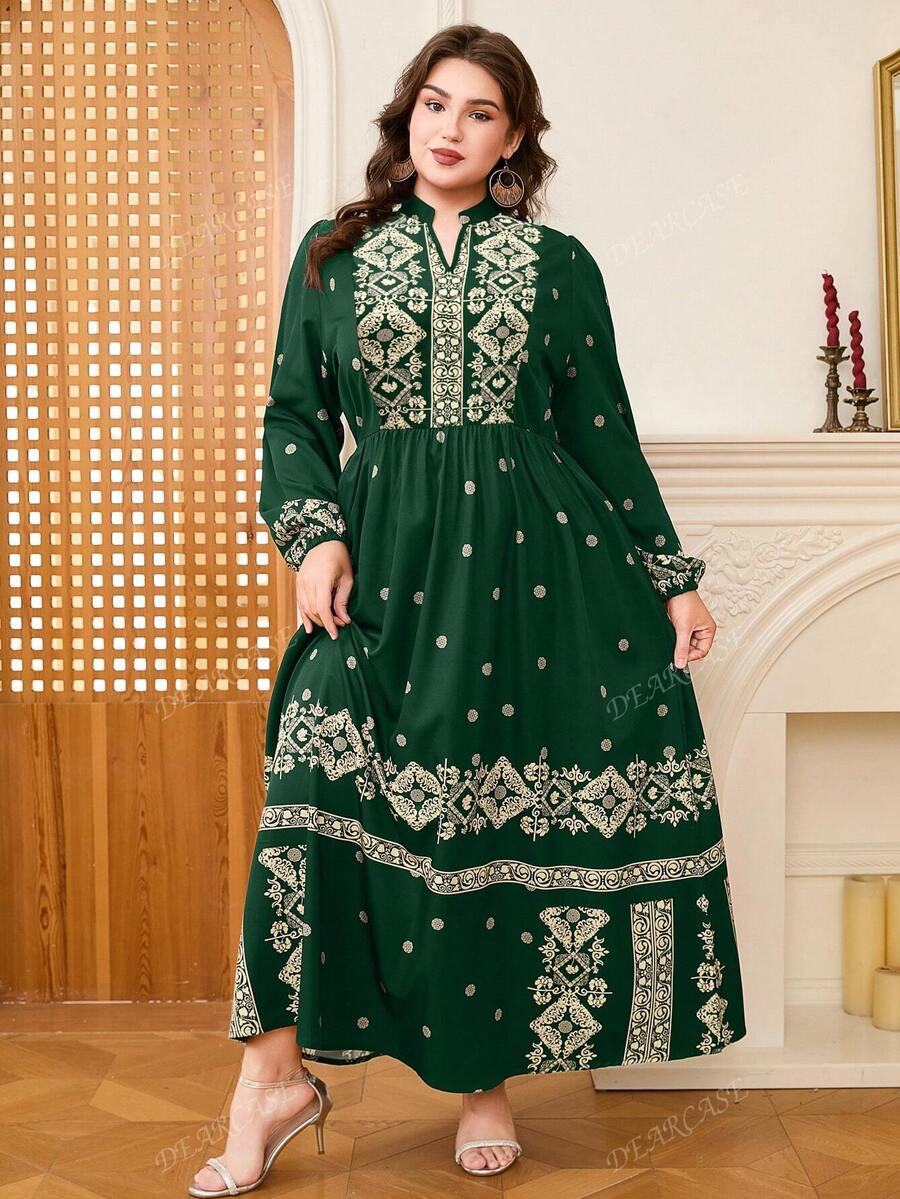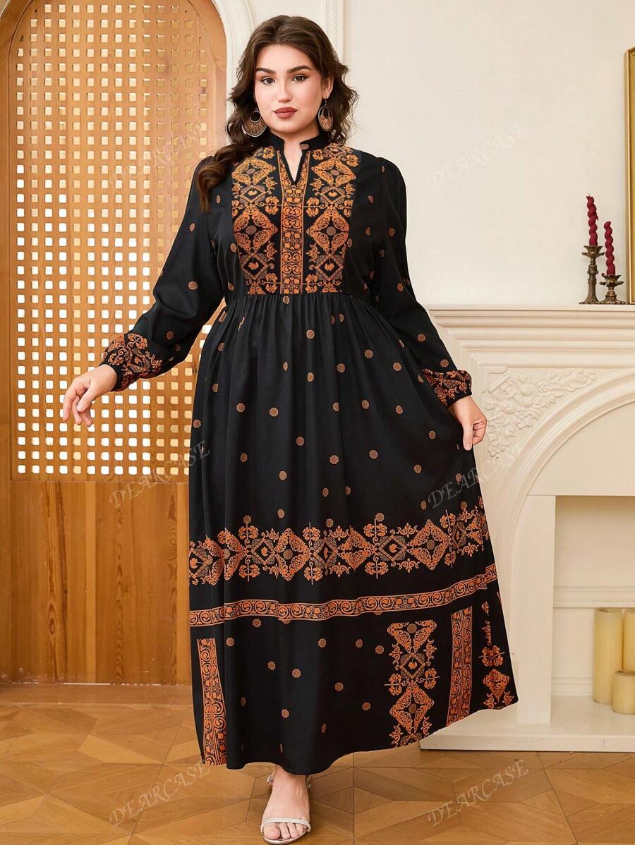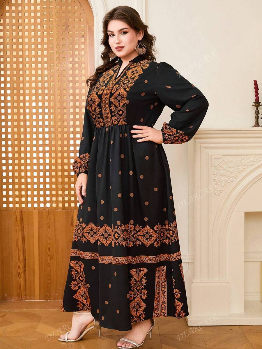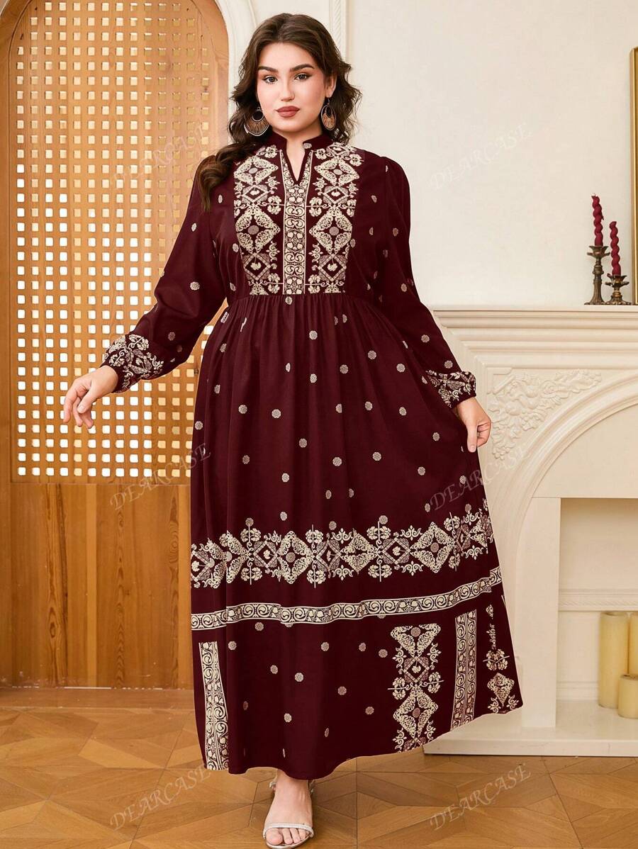 Vestido midi minimalista de manga larga con cuello en v y estampado para tallas grandes