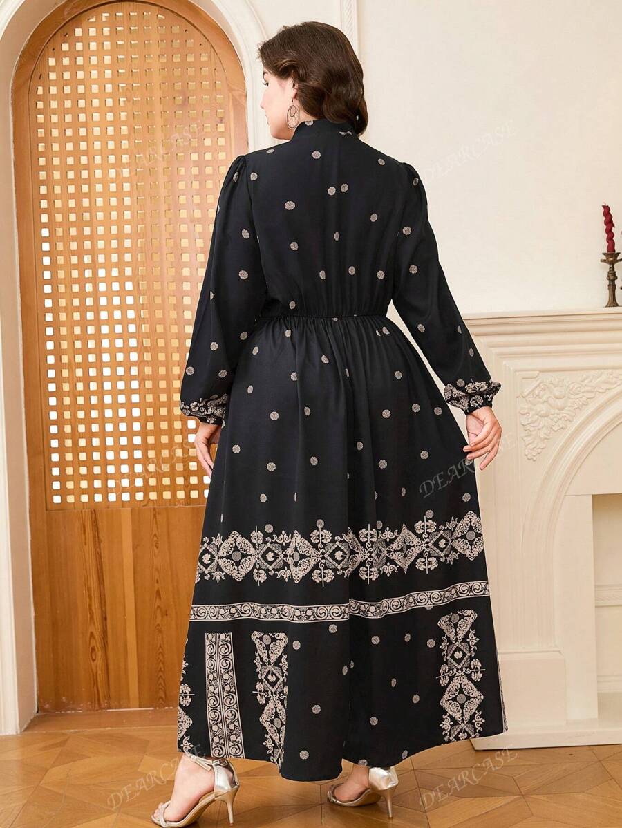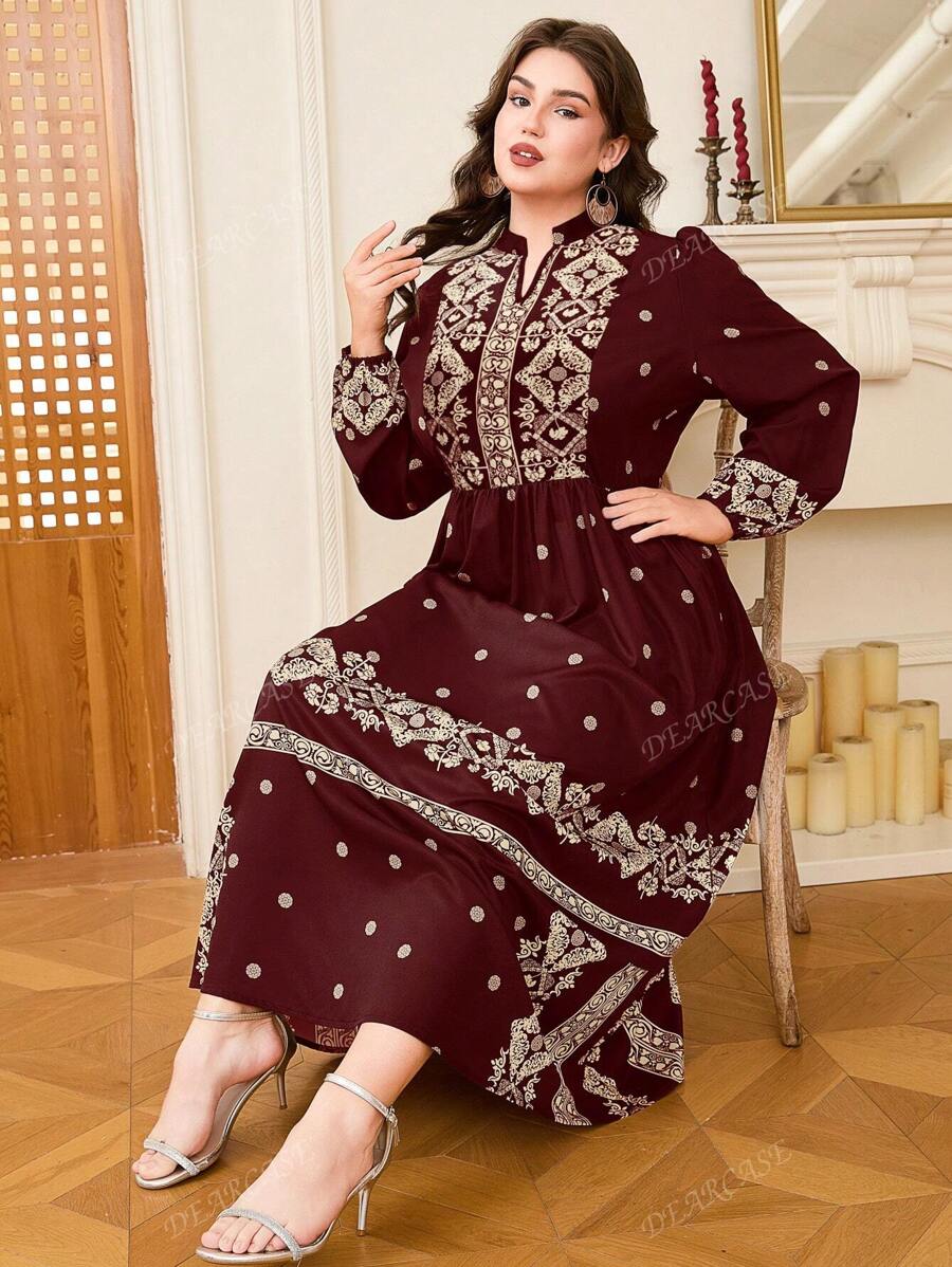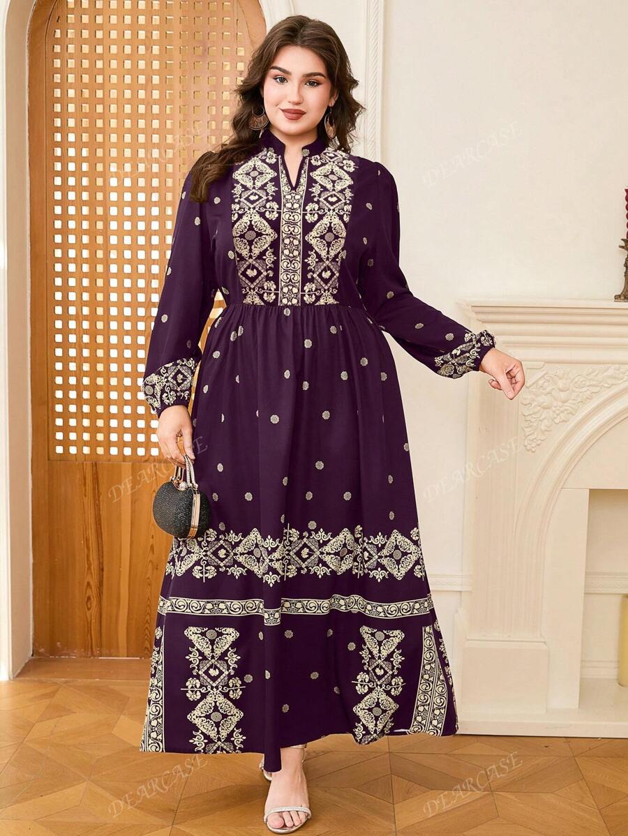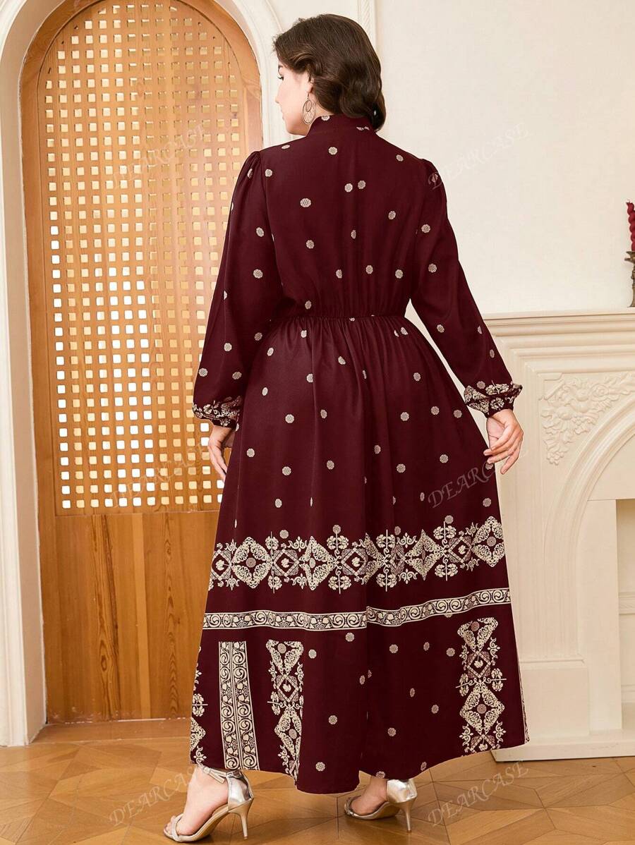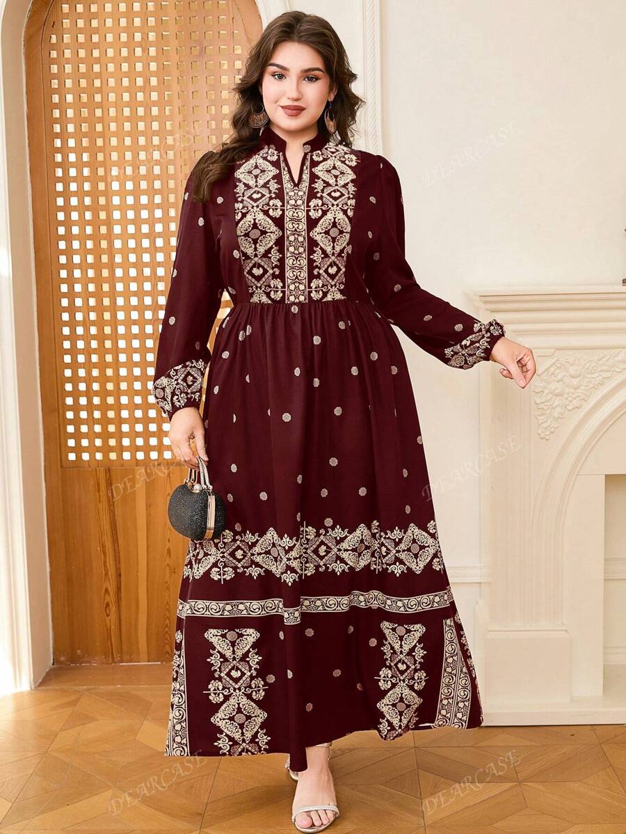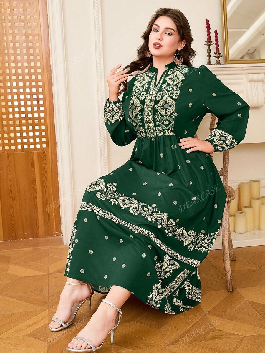 Vestido midi minimalista de manga larga con cuello en v y estampado para tallas grandes