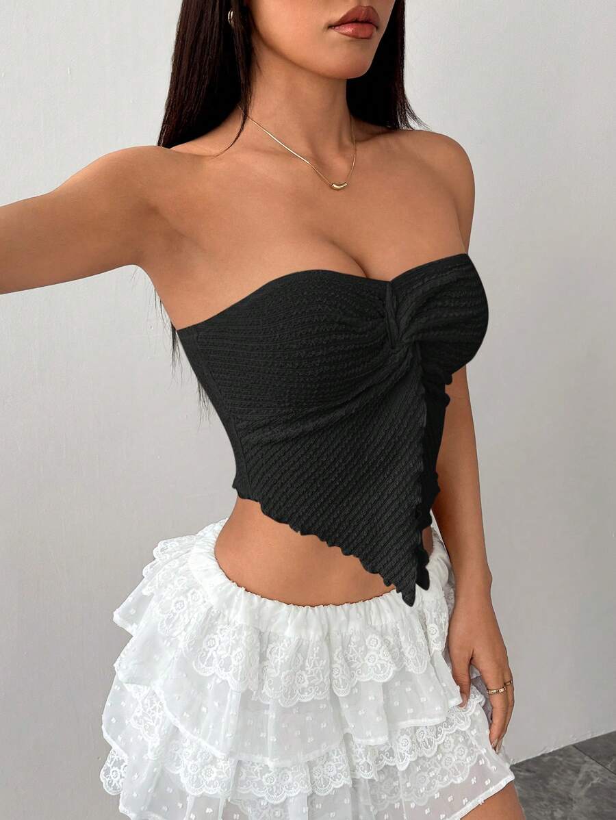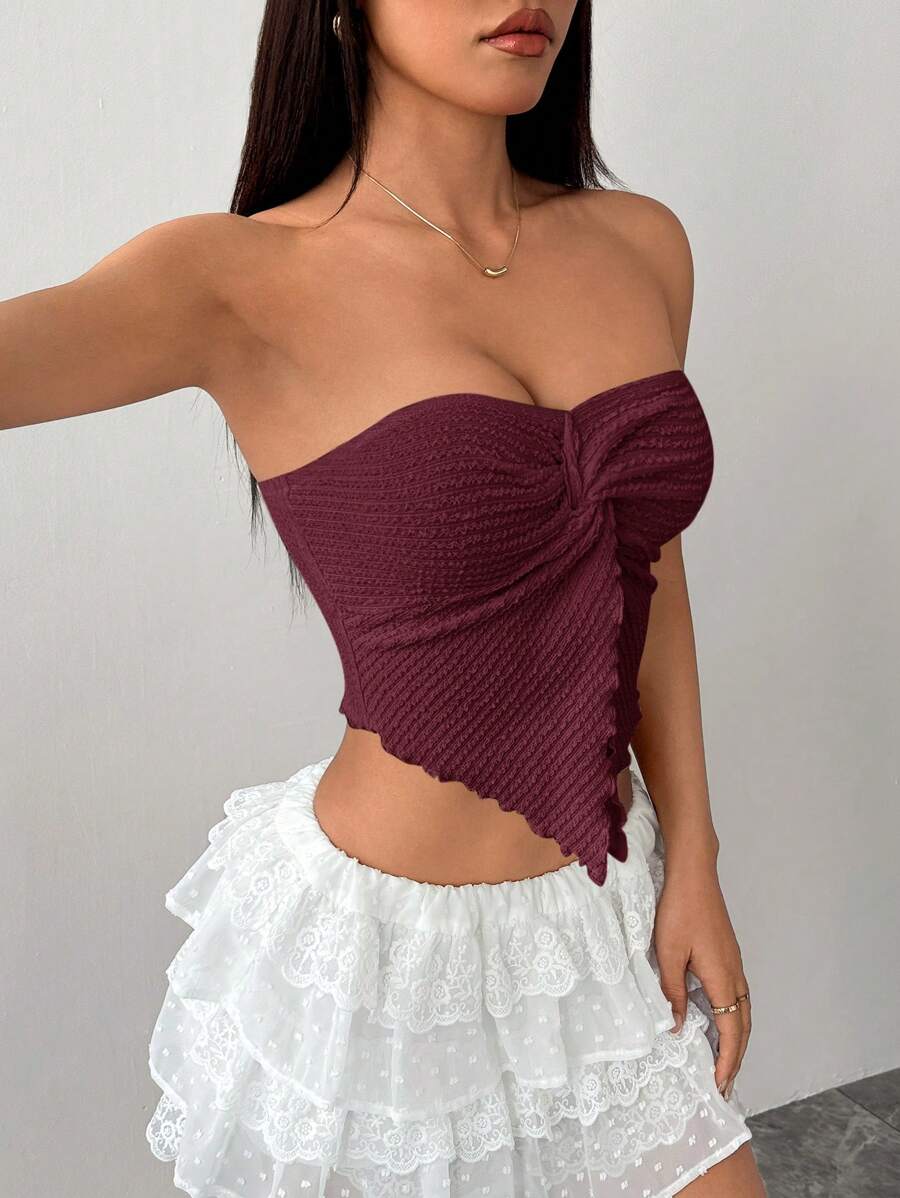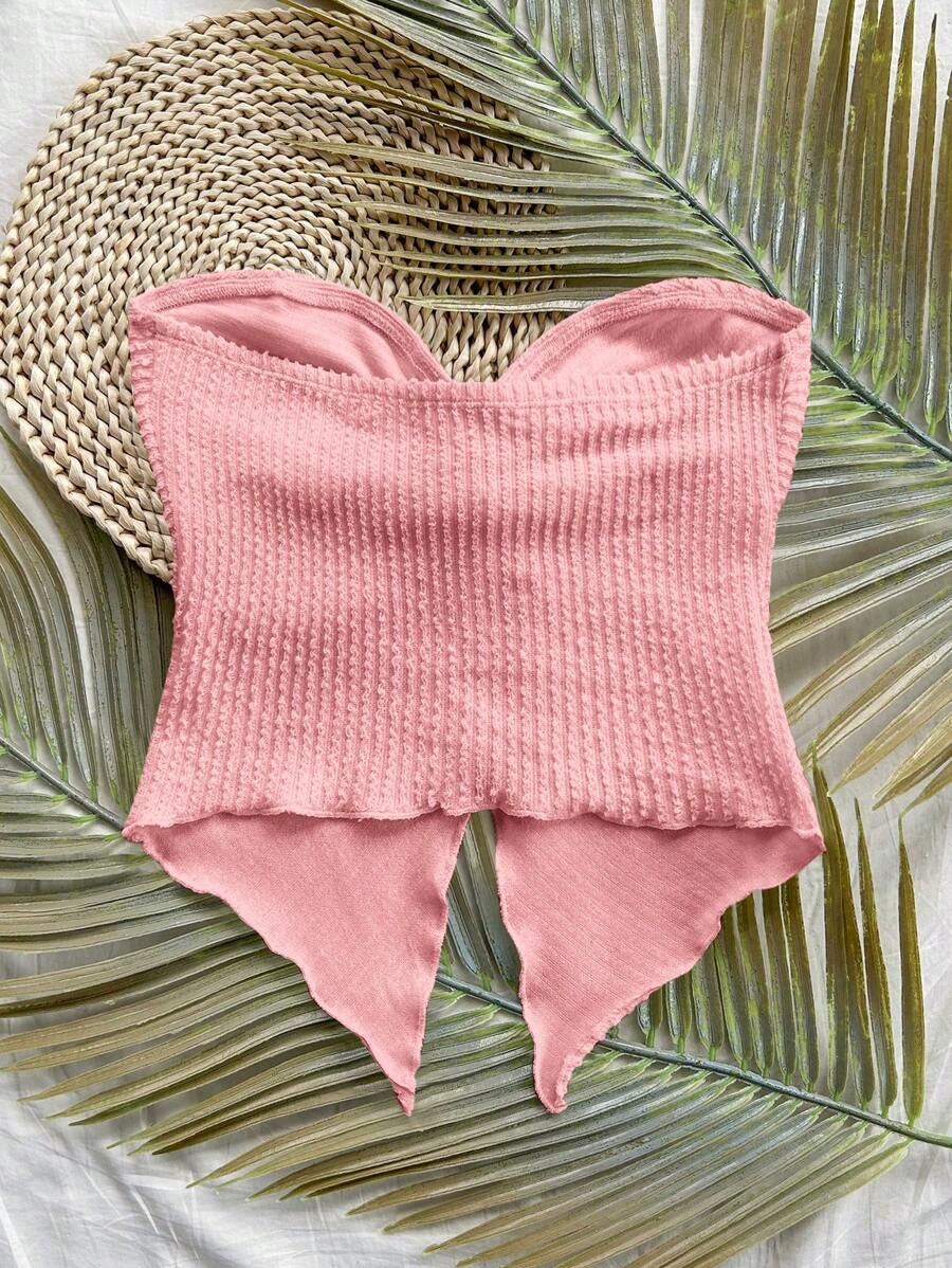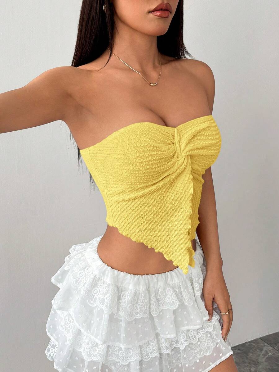 Top tubo texturizado de punto color albaricoque con borde asimetrico retorcido, chaleco para vacaciones de mujer