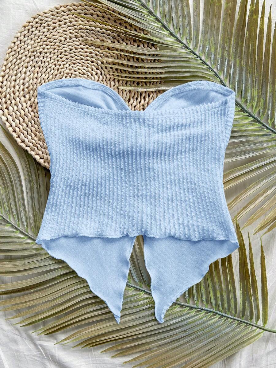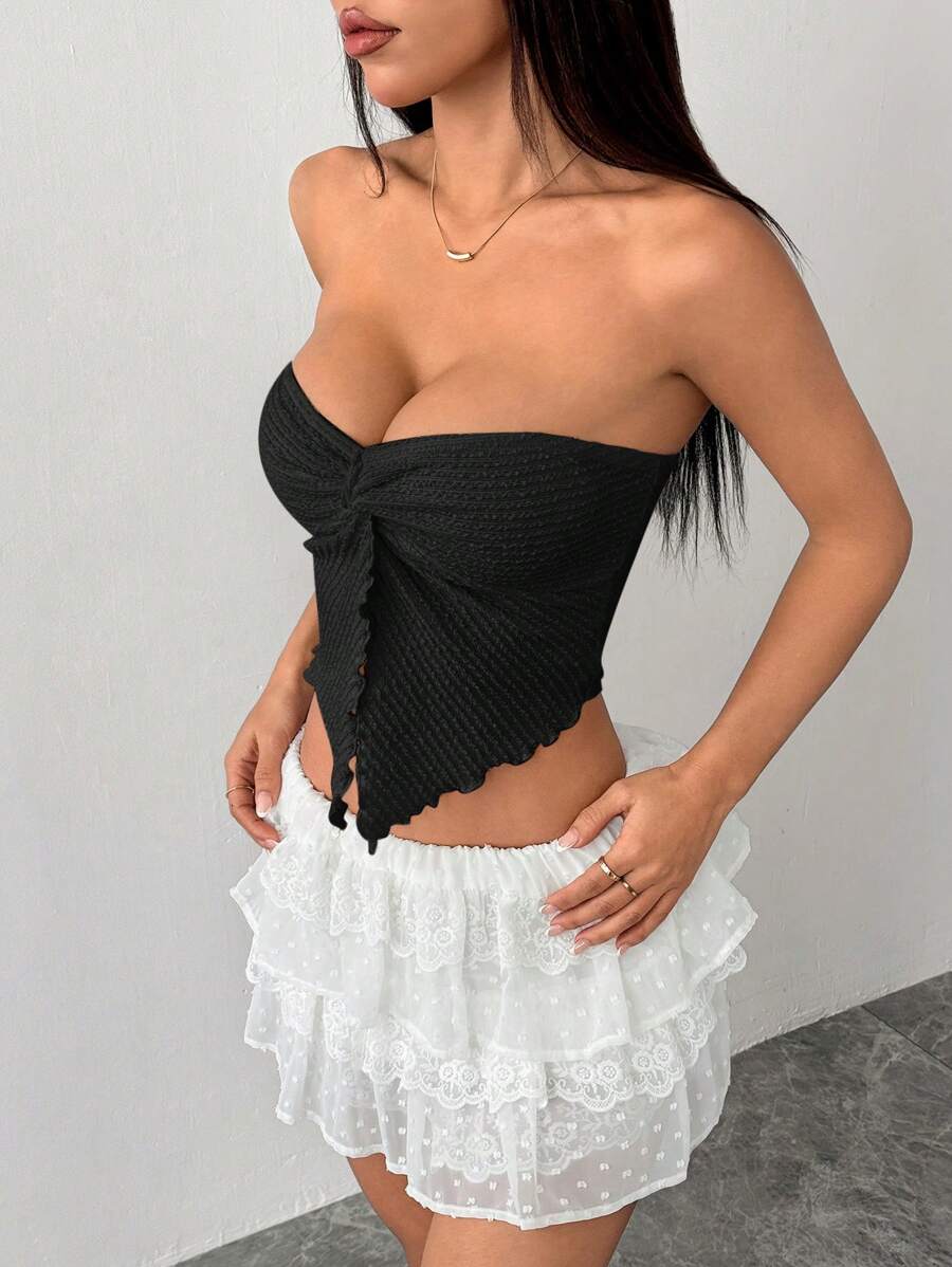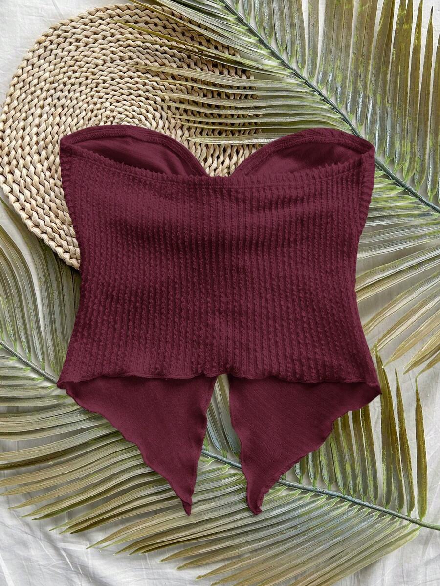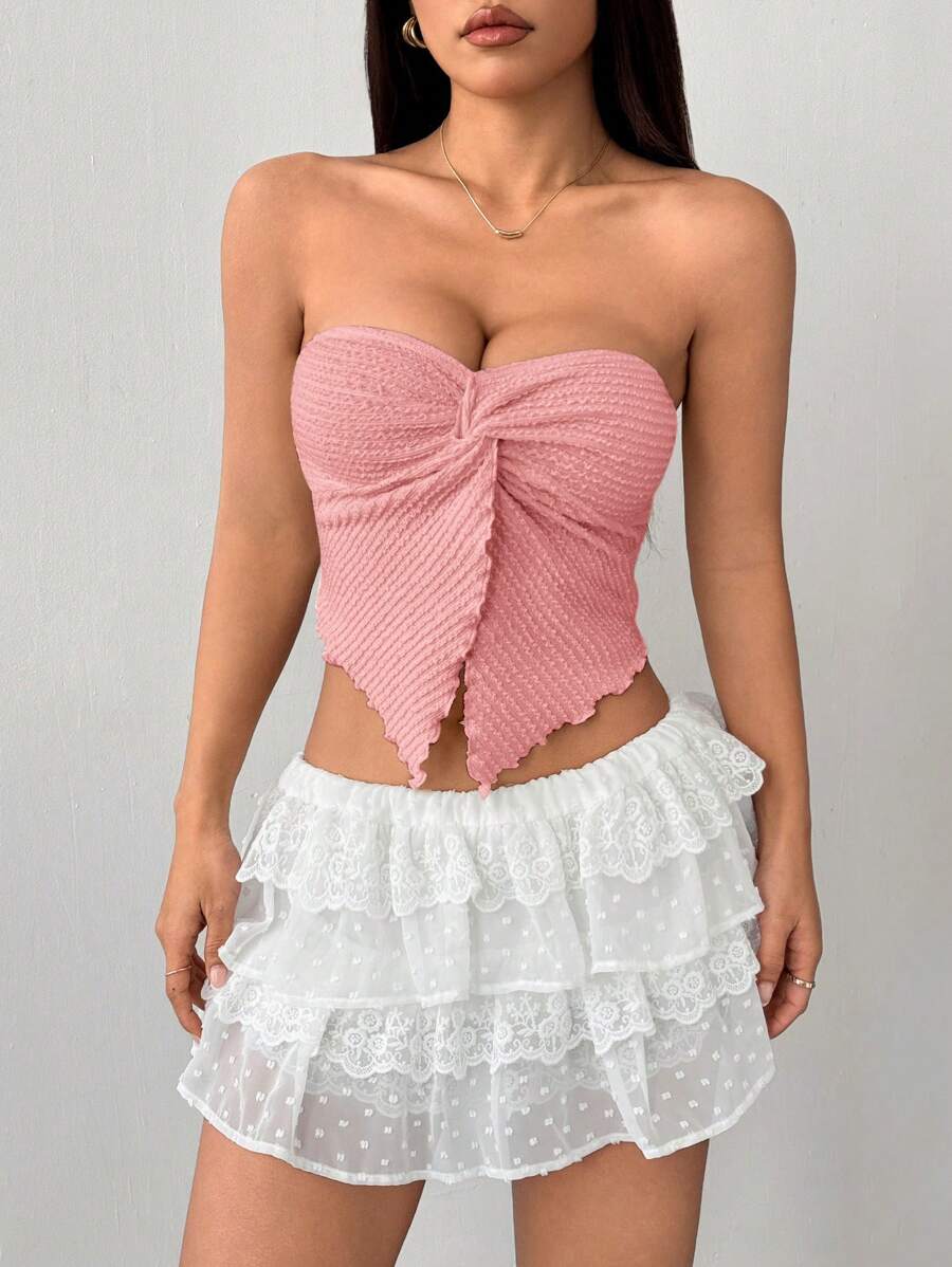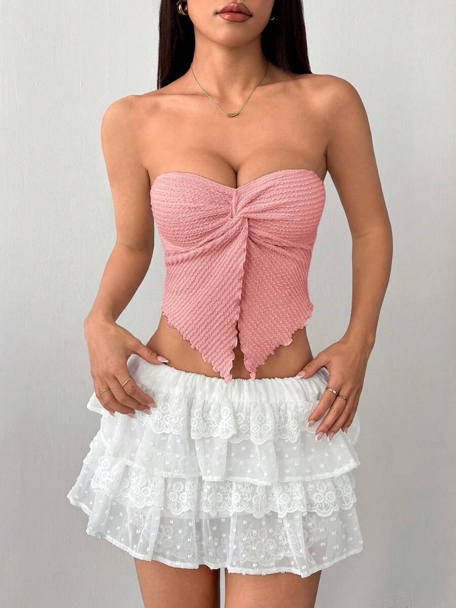 Top tubo texturizado de punto color albaricoque con borde asimetrico retorcido, chaleco para vacaciones de mujer