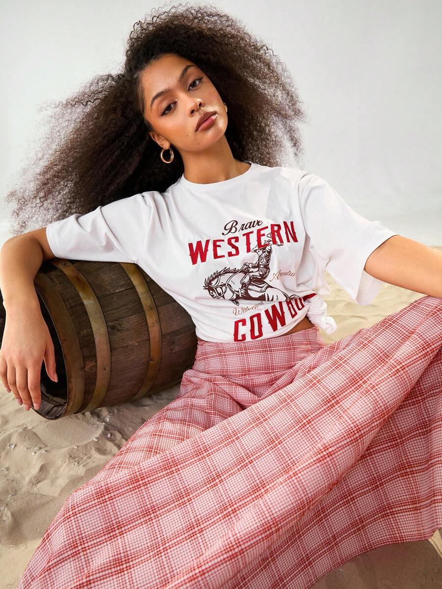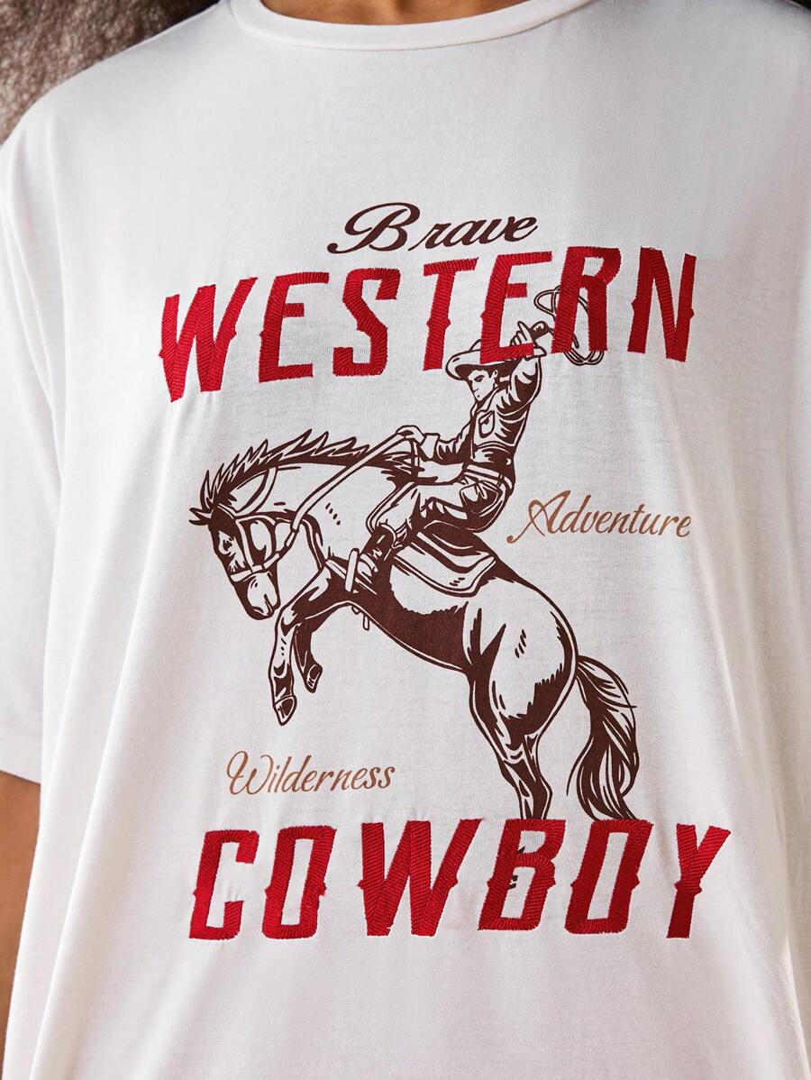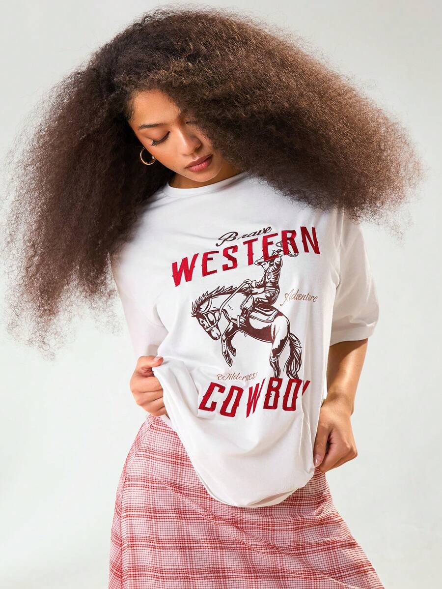 Athiral camiseta de manga corta casual de mujer con bordado de letra y estampado de vaquero, ropa del oeste para mujer