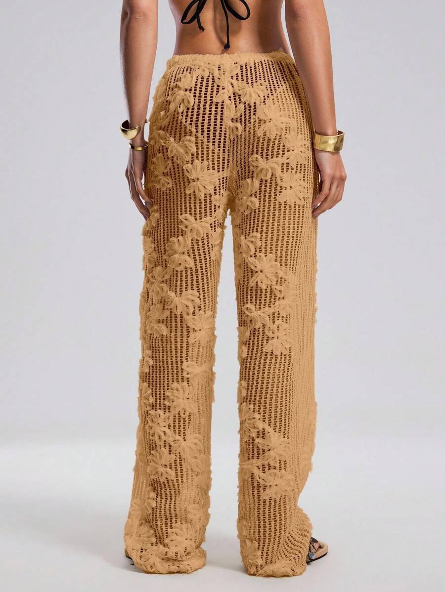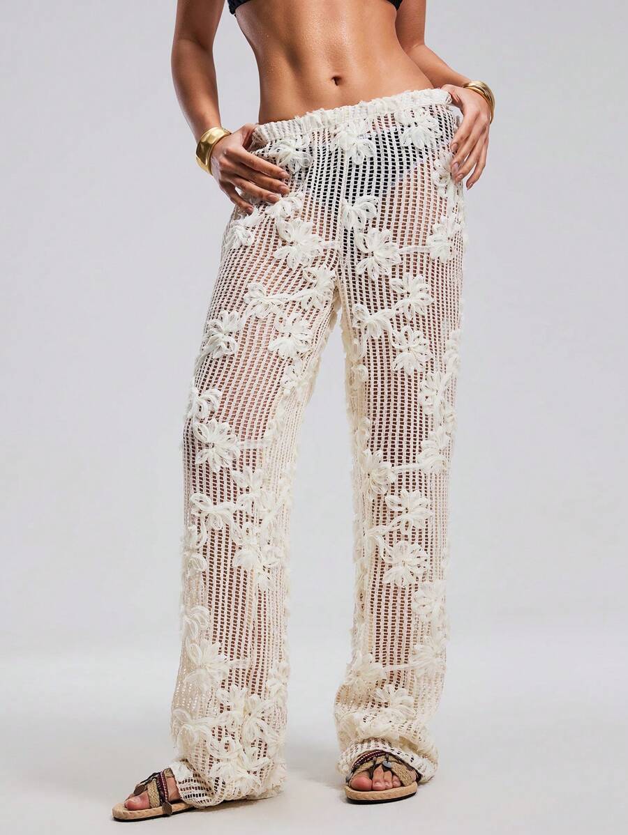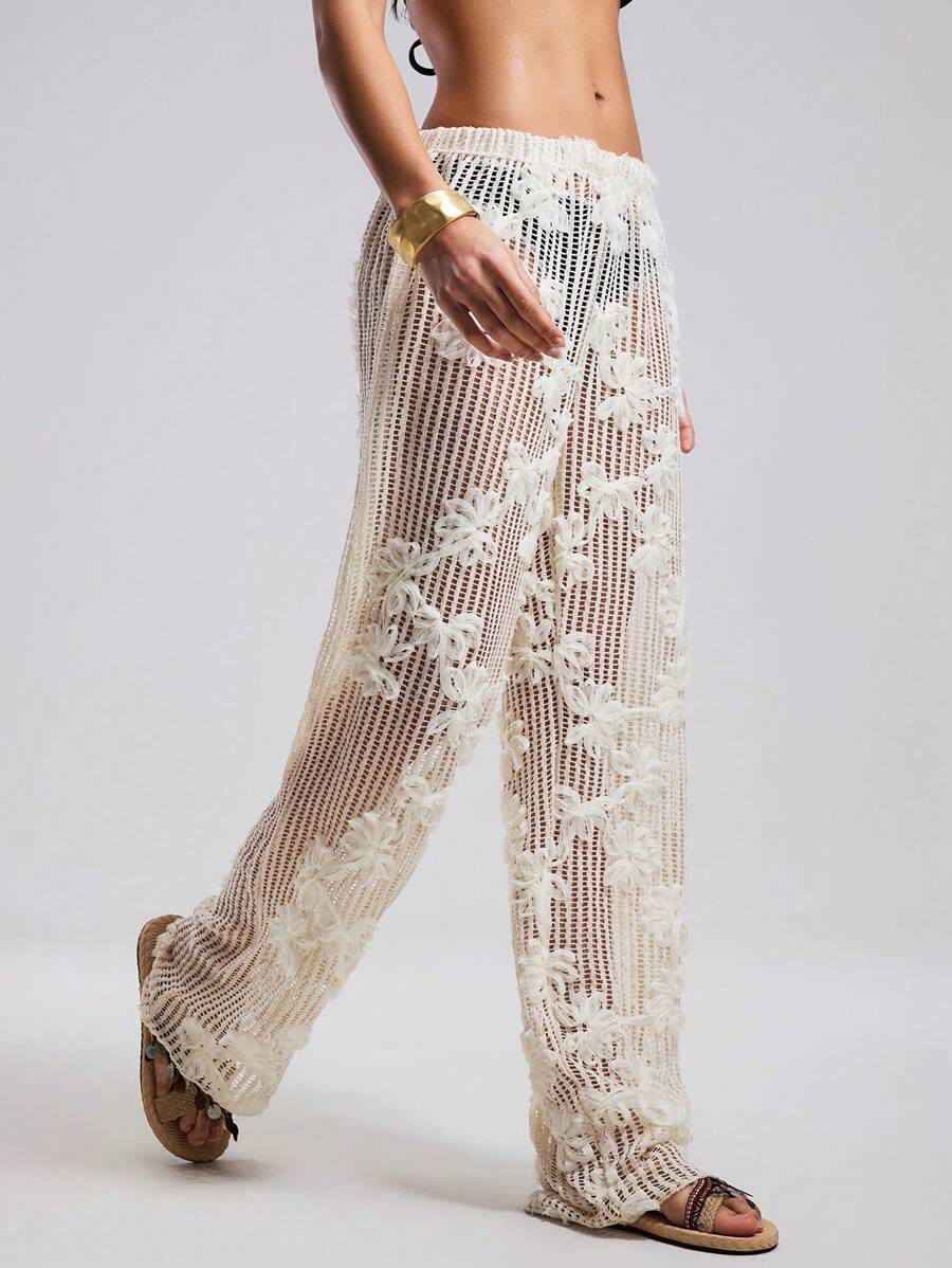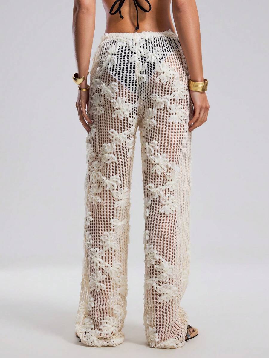 Atuendo de verano para mujeres, pantalones anchos y sueltos, tipo pareo para la playa, con diseno de malla calada y bordado floral