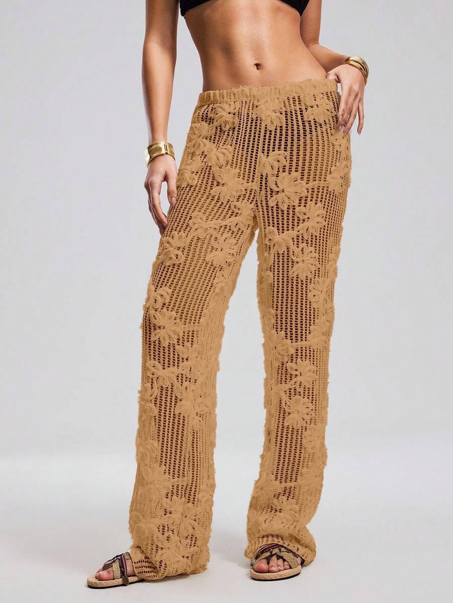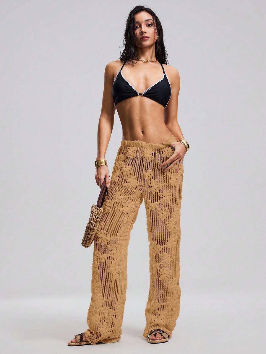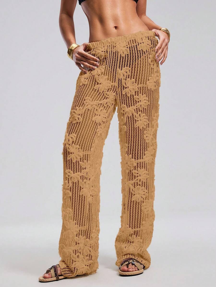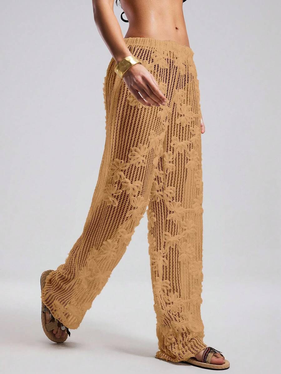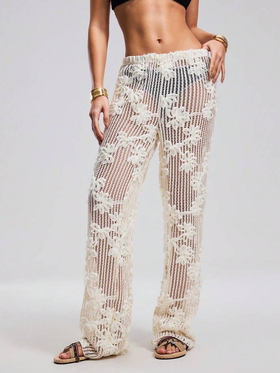 Atuendo de verano para mujeres, pantalones anchos y sueltos, tipo pareo para la playa, con diseno de malla calada y bordado floral