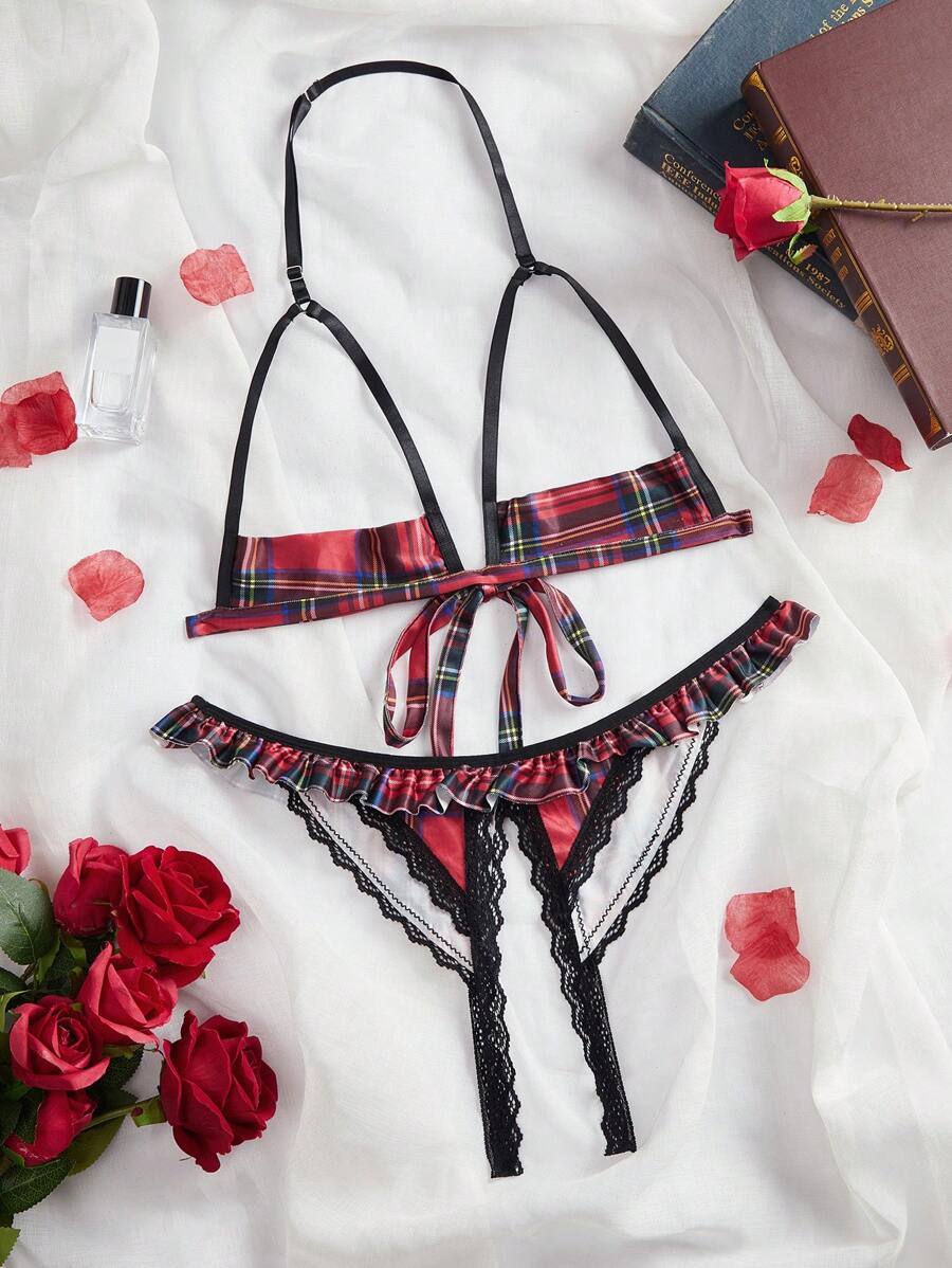 Conjunto de lenceria de 2 piezas con falda de volantes, brasier y panty calados a cuadros de talla grande, estilo estudiantil lindo