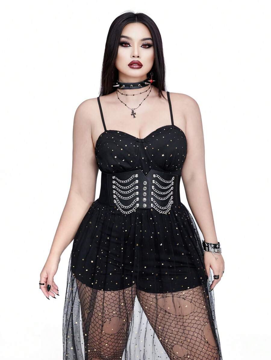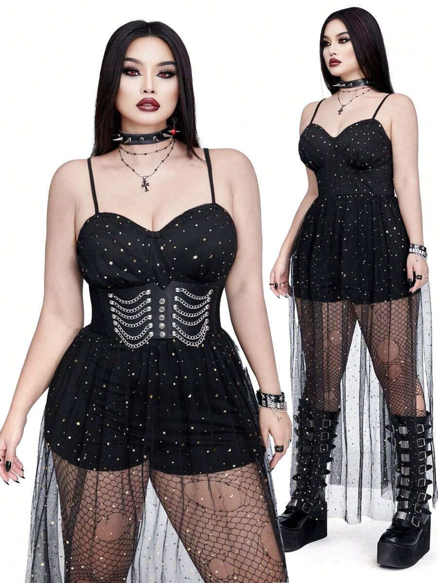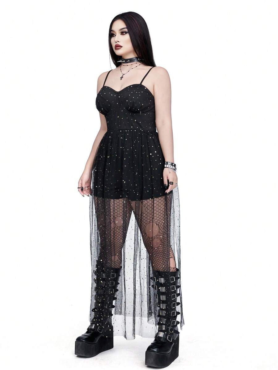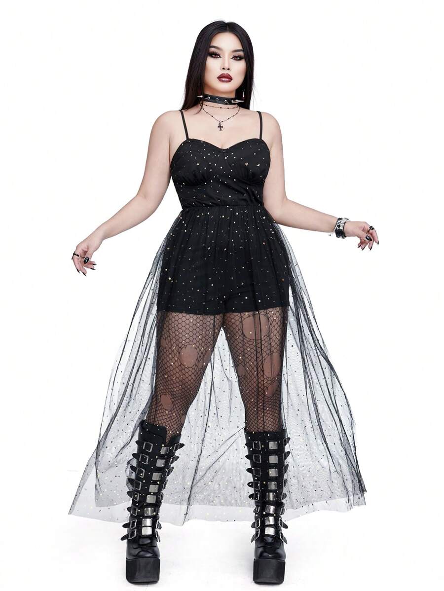 Whyspr pantalon de una pieza con estampado de estrella de malla, tirantes finos y abertura lateral, talla grande y sexy