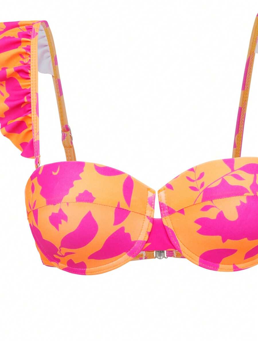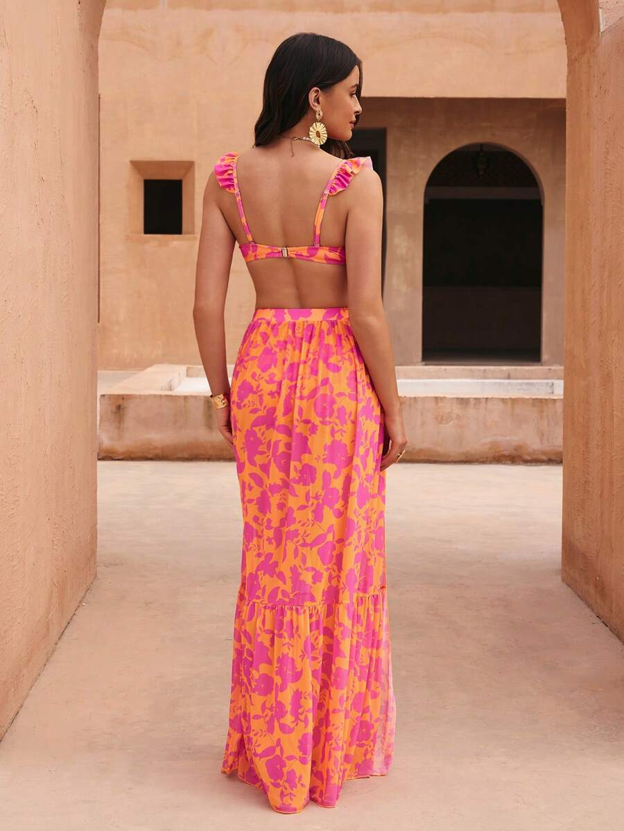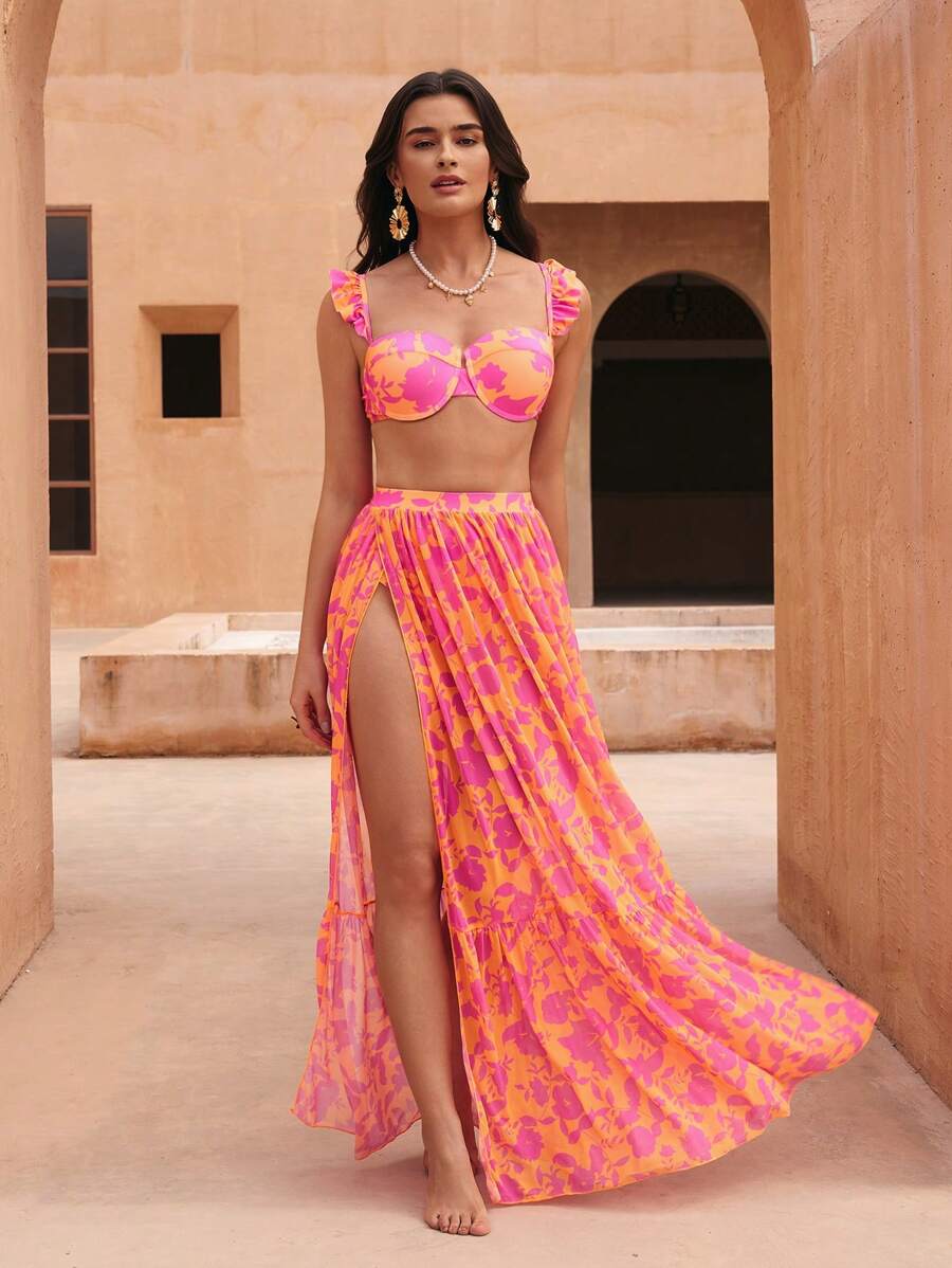 Oasis conjunto de 3 piezas de traje de bano de verano y vacaciones para mujer, con parte superior con volantes y brasier push up de estampado floral sexy, tapa de cintura alta y vestido de gasa con doble volante como cobertor maxi