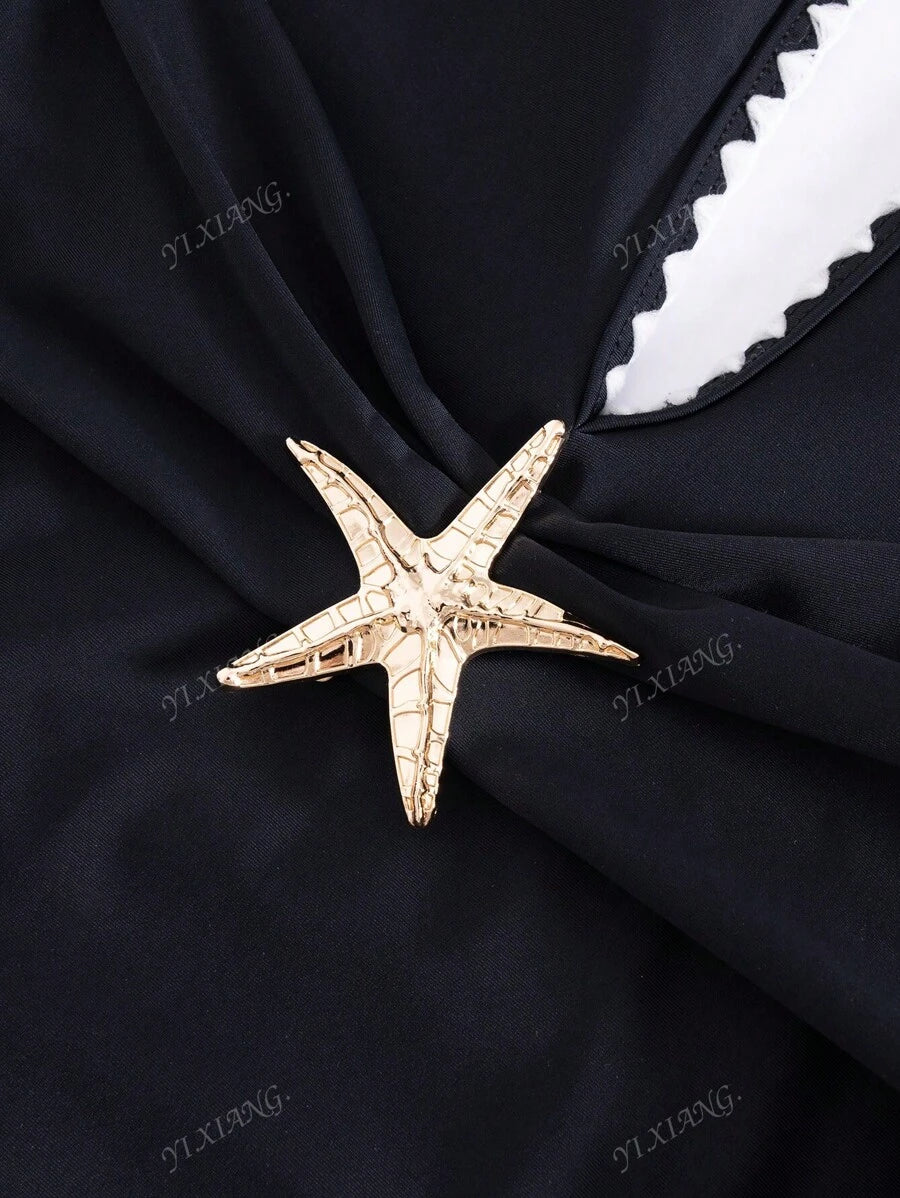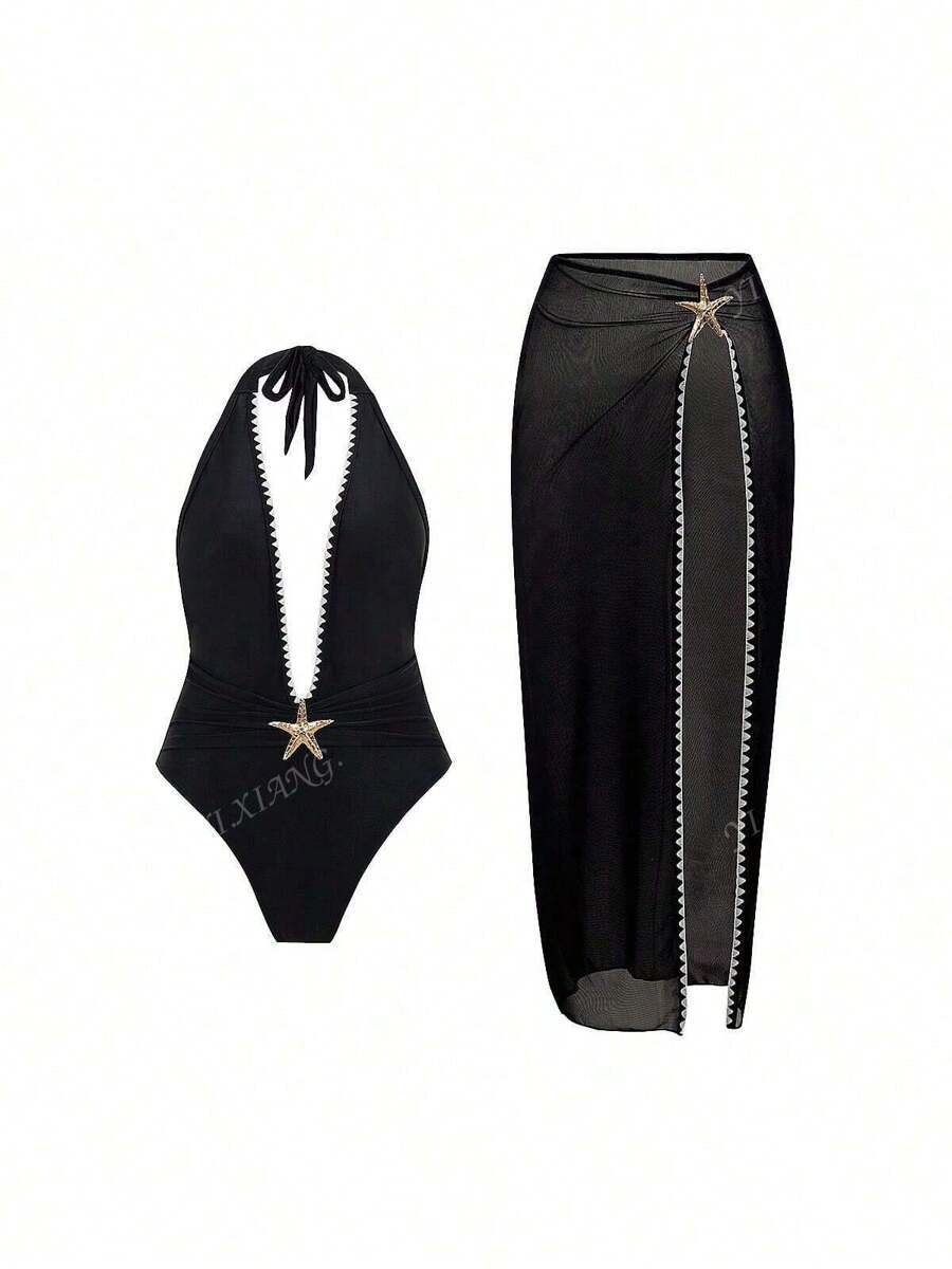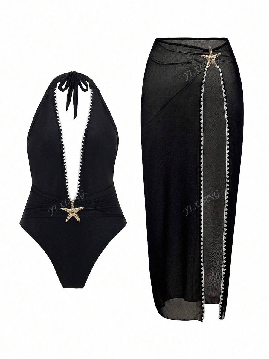 2 piezas conjunto de playa para mujer 2025, traje de bano con escote en v hueco y adorno de flores y estrellas de mar, emparejado con una falda maxi transparente y sexy de estilo casual