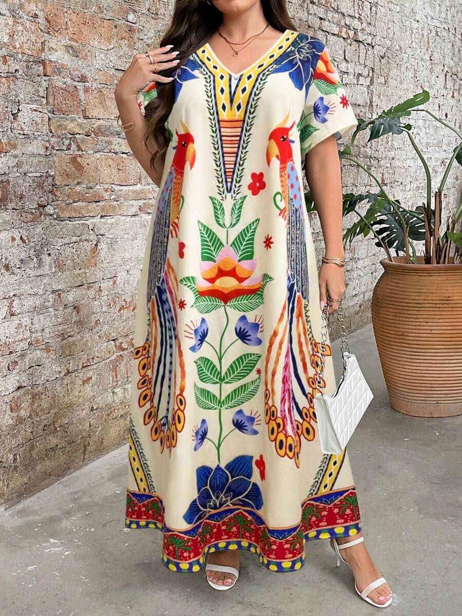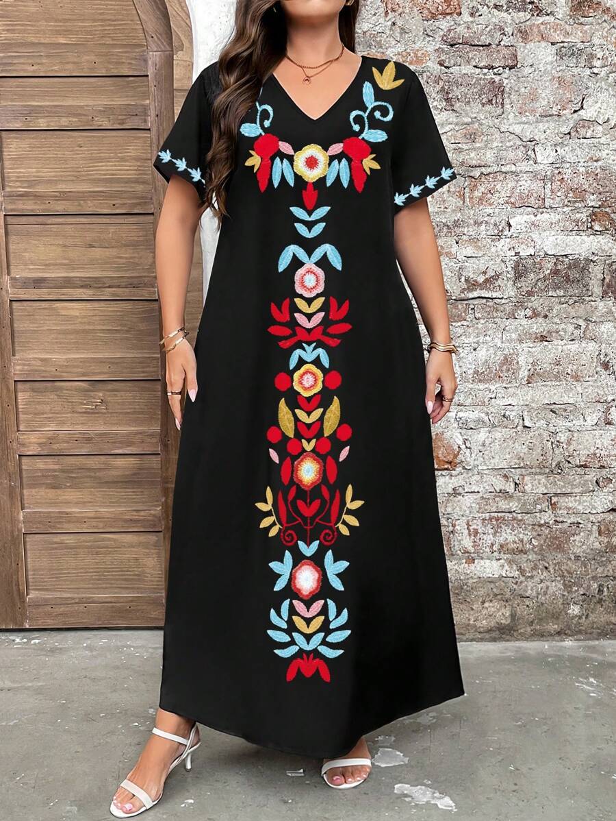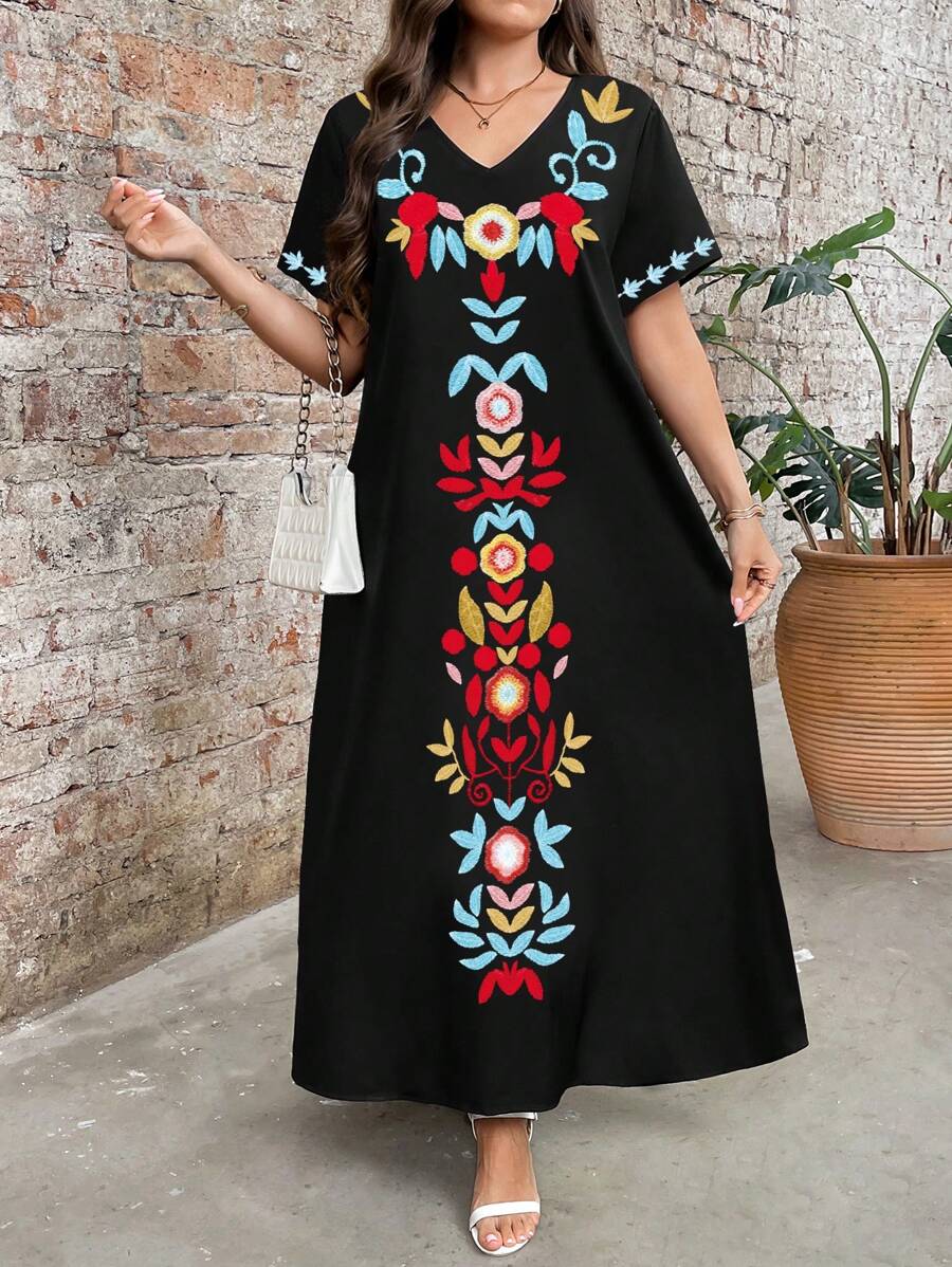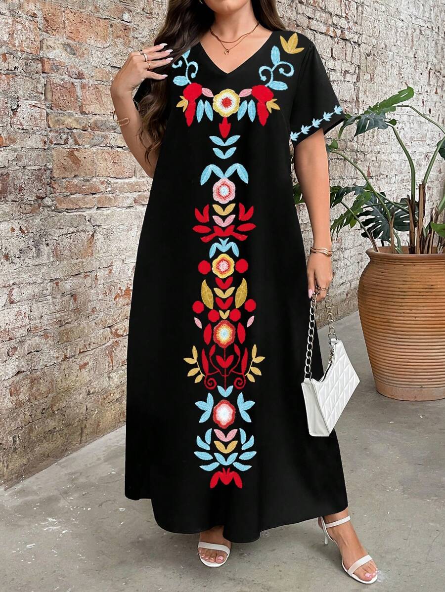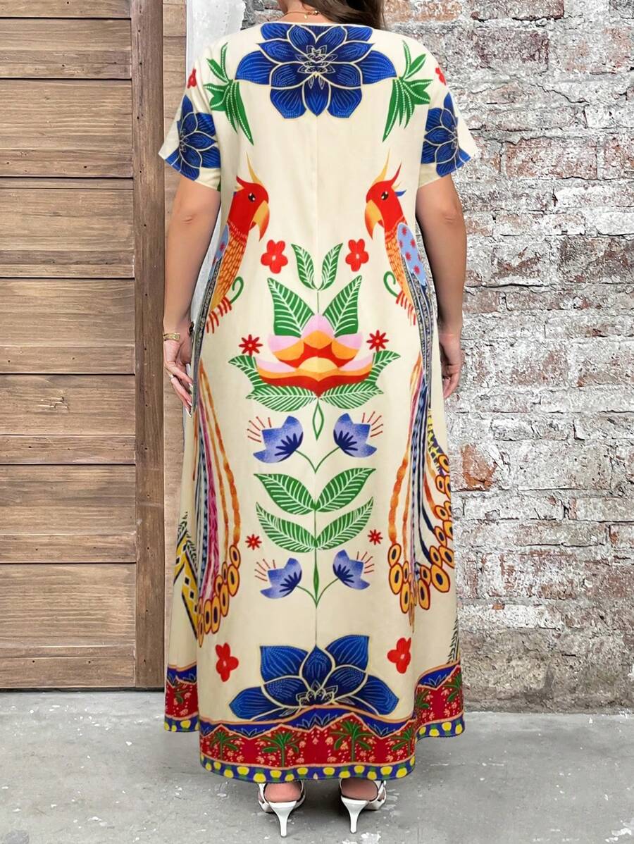 Vestido de manga corta con cuello redondo y estampado floral para mujeres de talla grande, elegante y adecuado para el uso diario