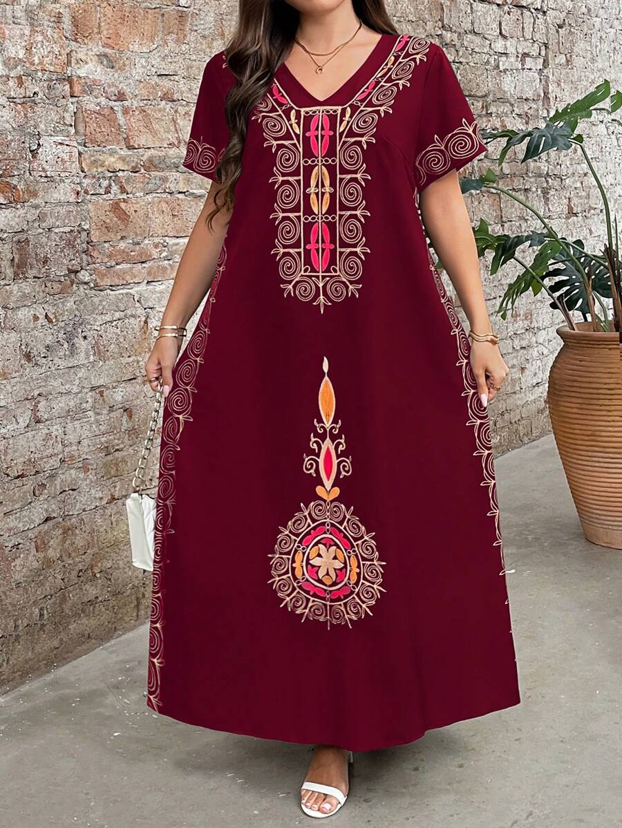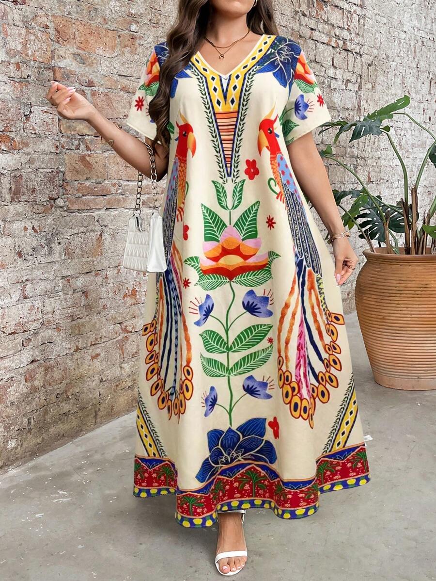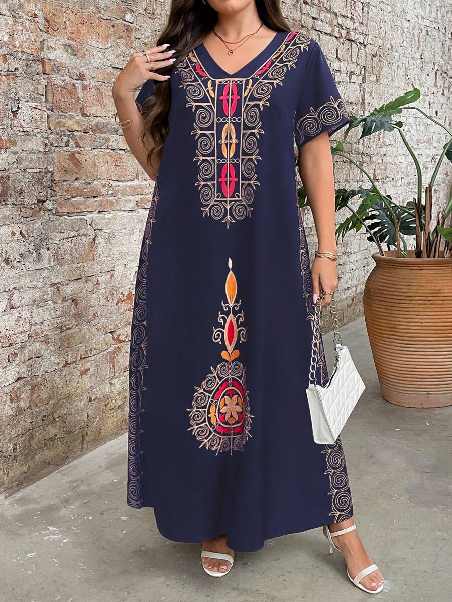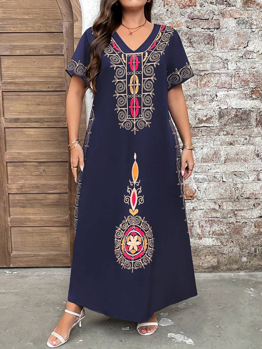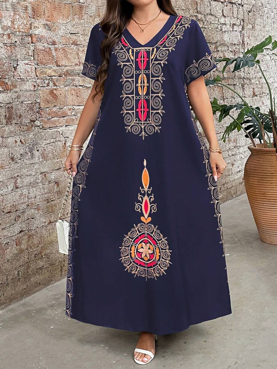 Vestido de manga corta con cuello redondo y estampado floral para mujeres de talla grande, elegante y adecuado para el uso diario