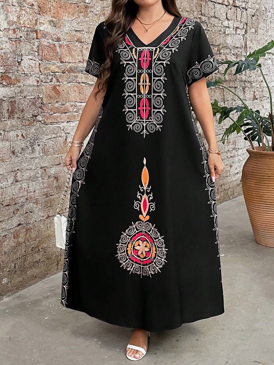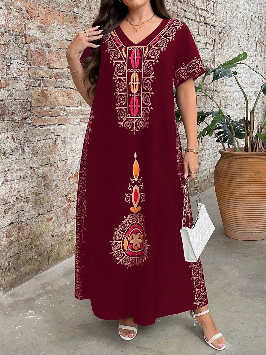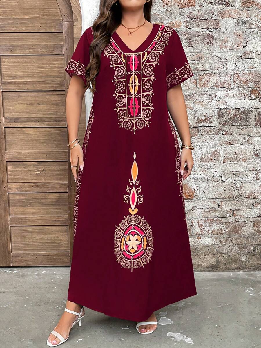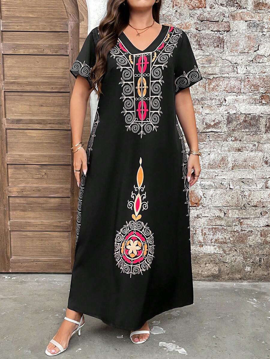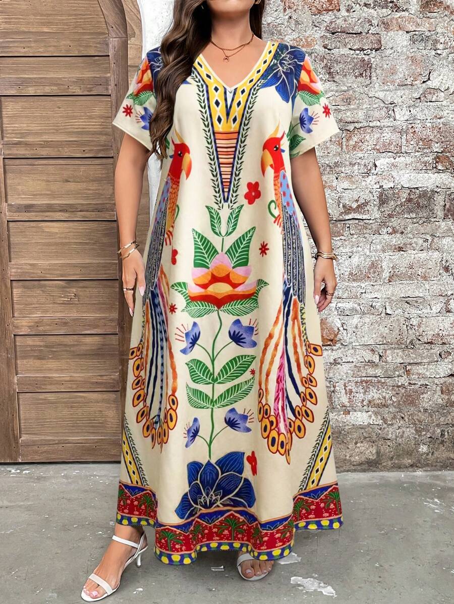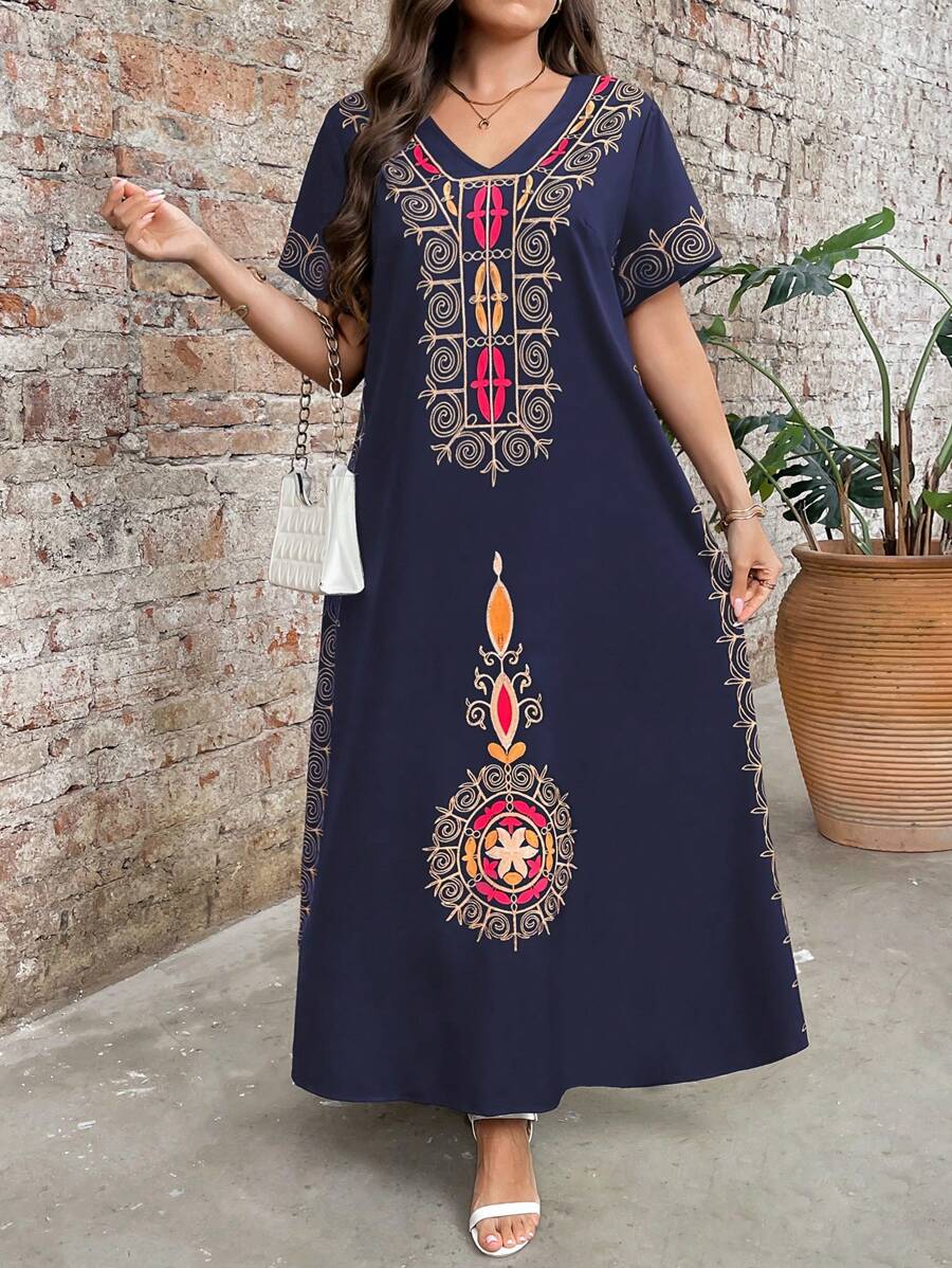 Vestido de manga corta con cuello redondo y estampado floral para mujeres de talla grande, elegante y adecuado para el uso diario