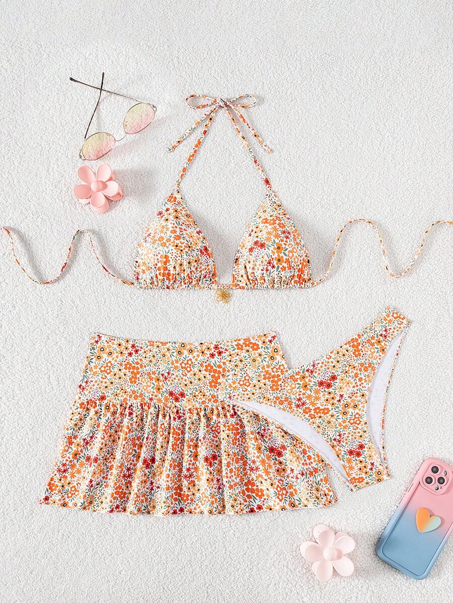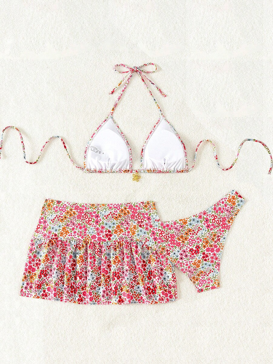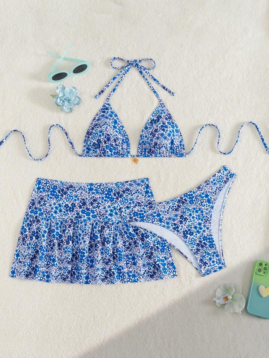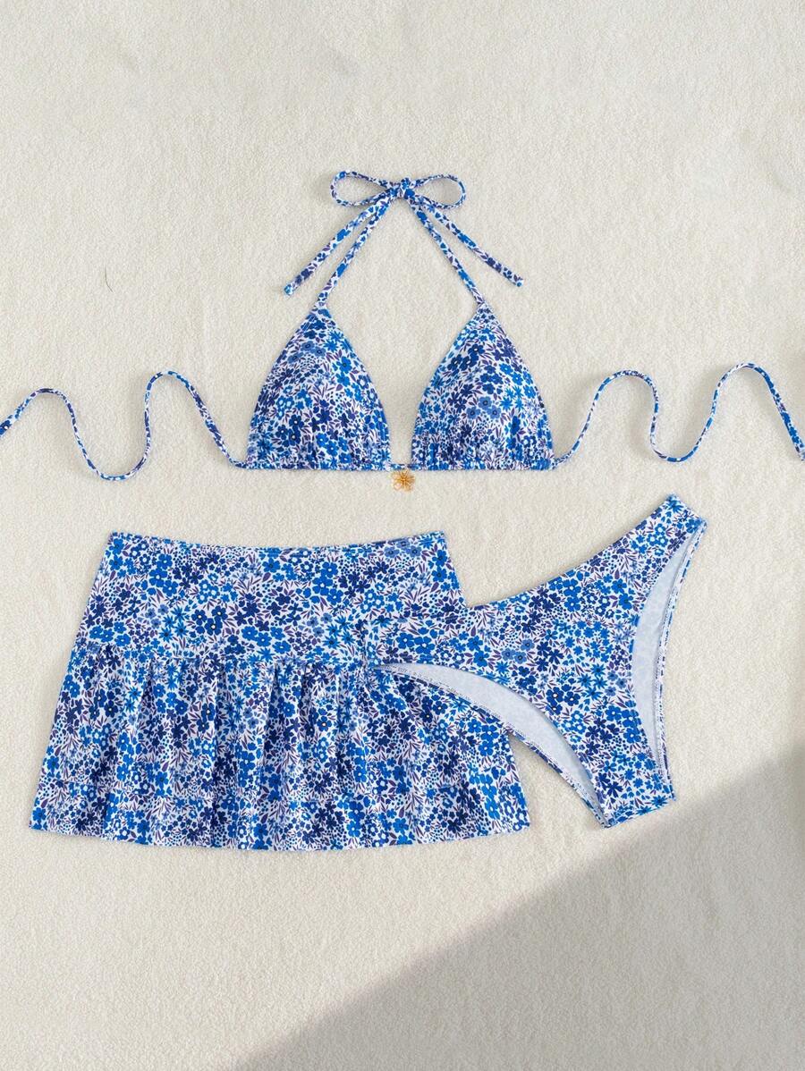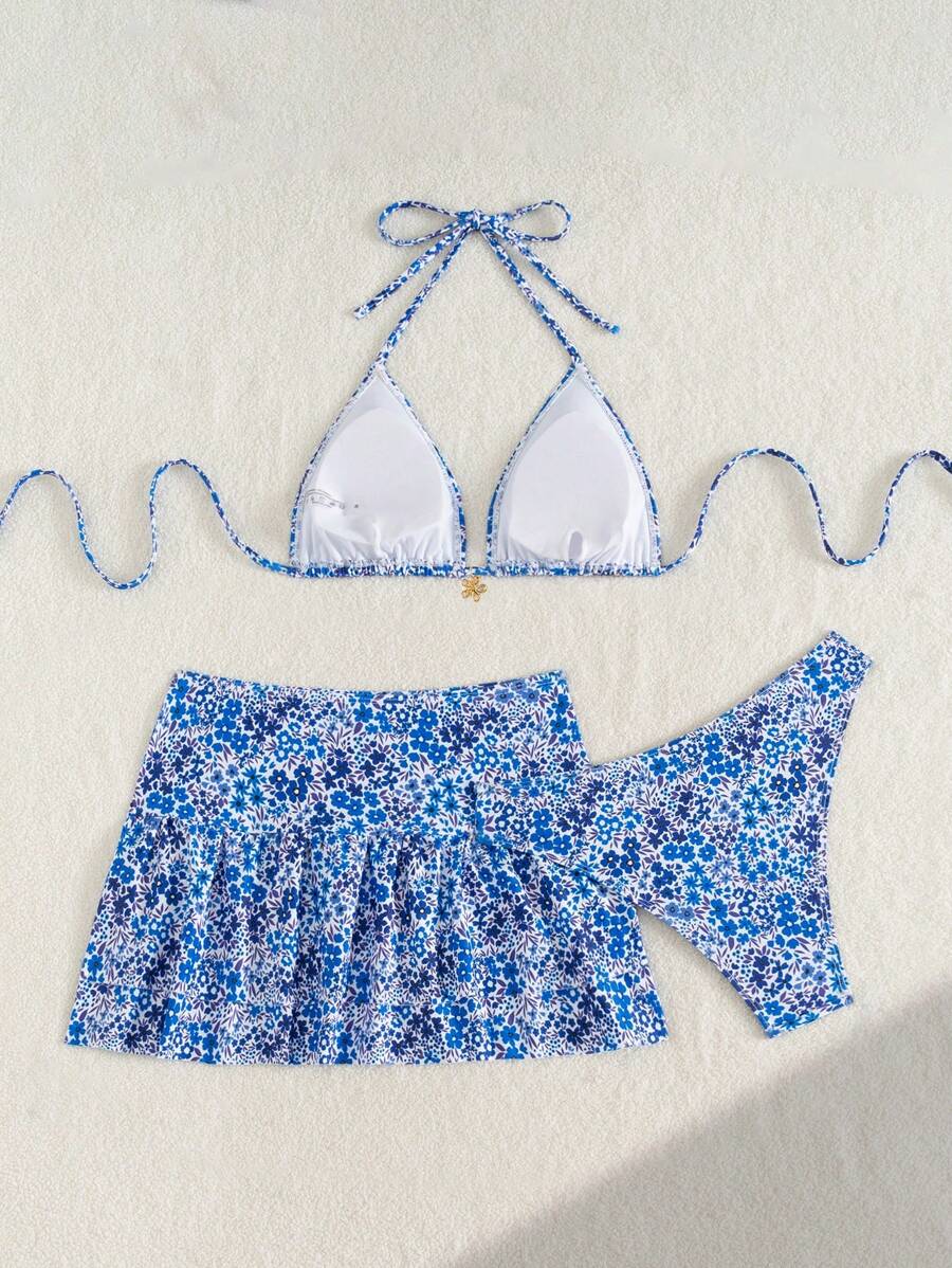 Conjunto de atuendo de playa de 3 piezas para mujer con traje de bano triangular de cuello halter con estampado floral diminuto, falda con volante y cubrecuerpo