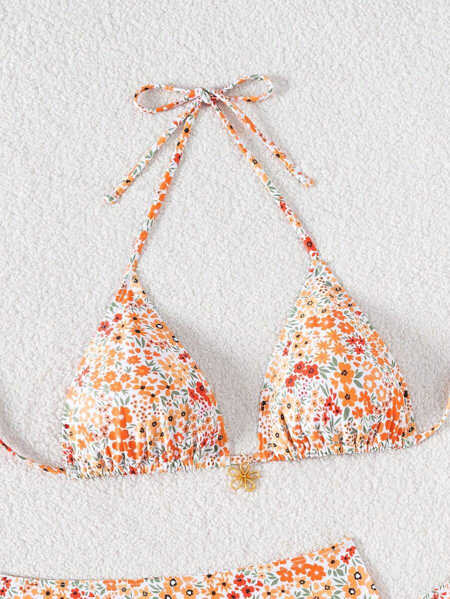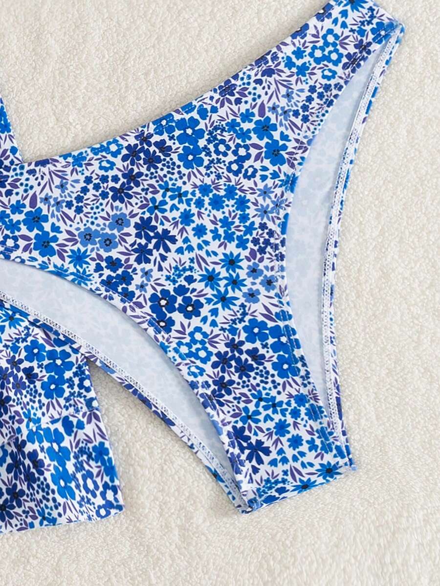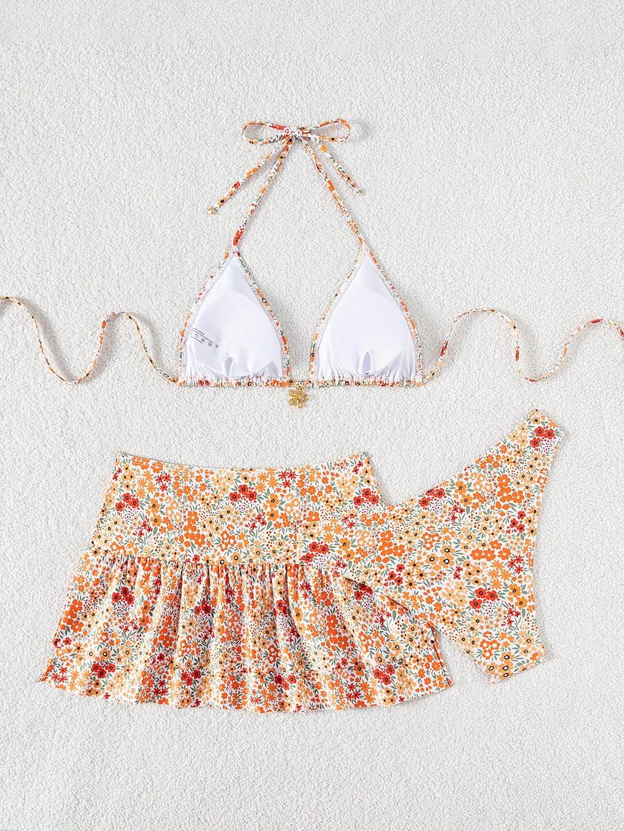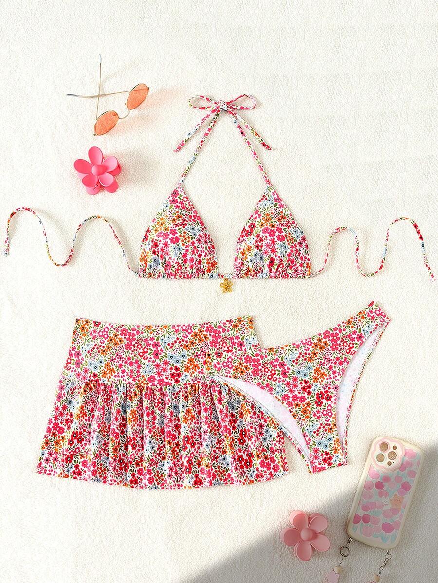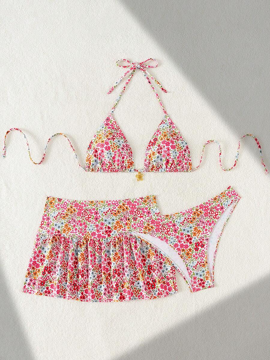 Conjunto de atuendo de playa de 3 piezas para mujer con traje de bano triangular de cuello halter con estampado floral diminuto, falda con volante y cubrecuerpo