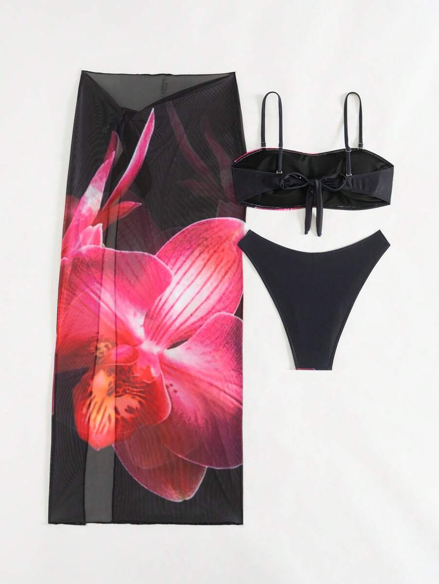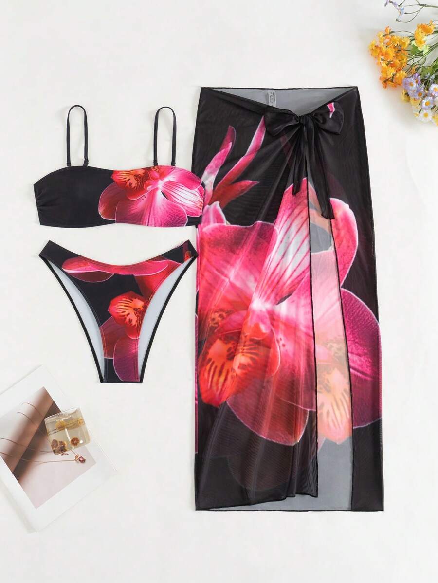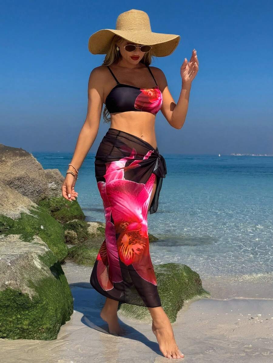 3 piezas conjunto de ropa de playa para mujer para el verano: top brasier sin tirantes estampado y falda de playa, conjunto de vestido de bano bikini de verano