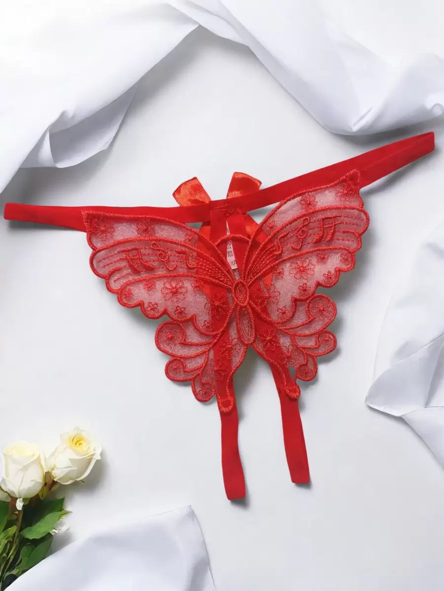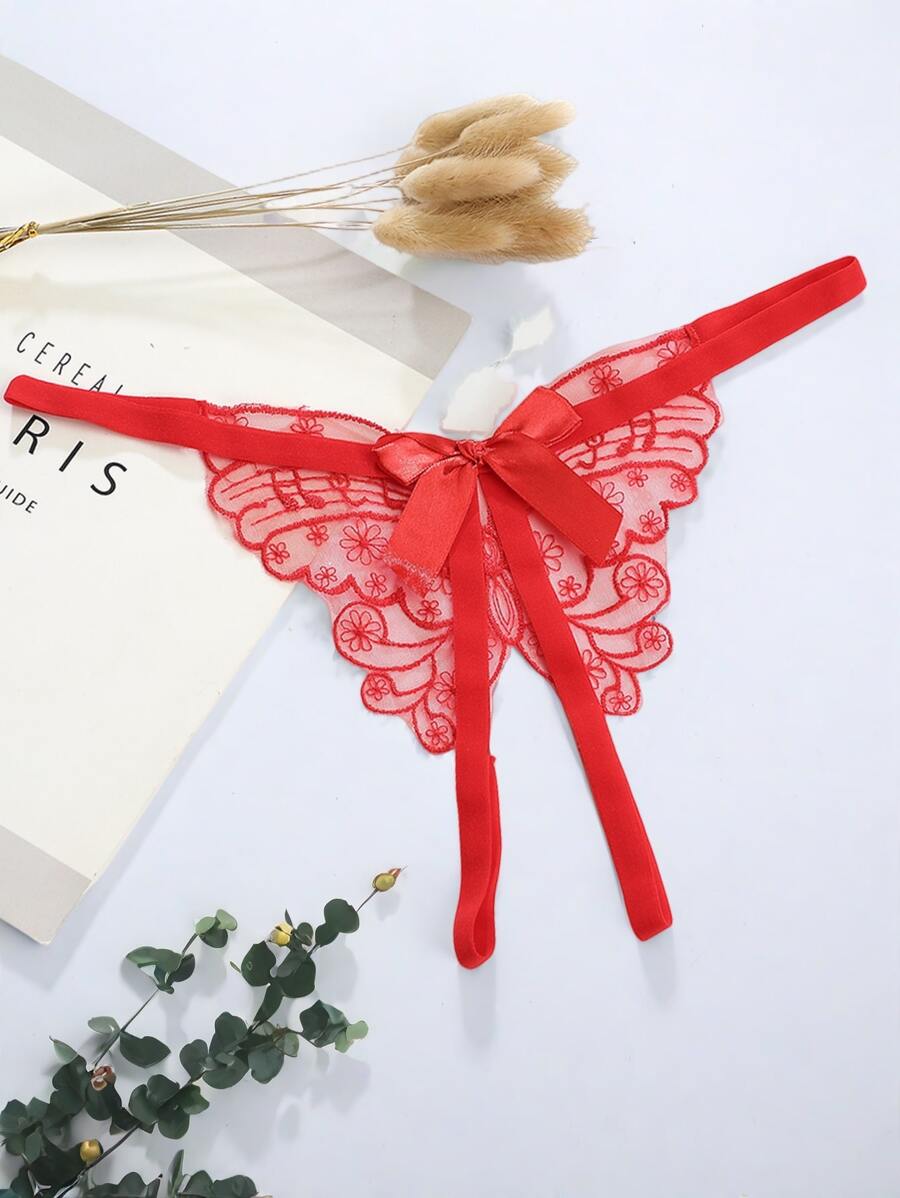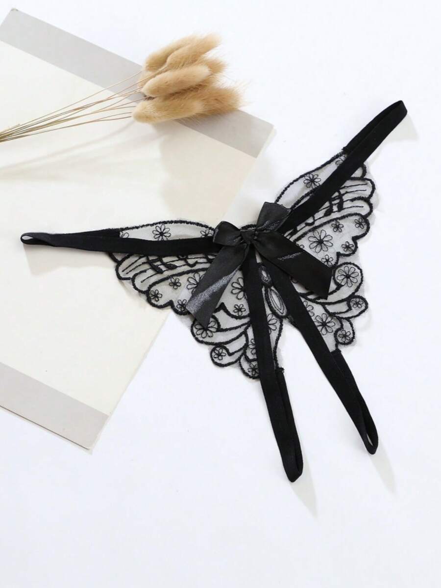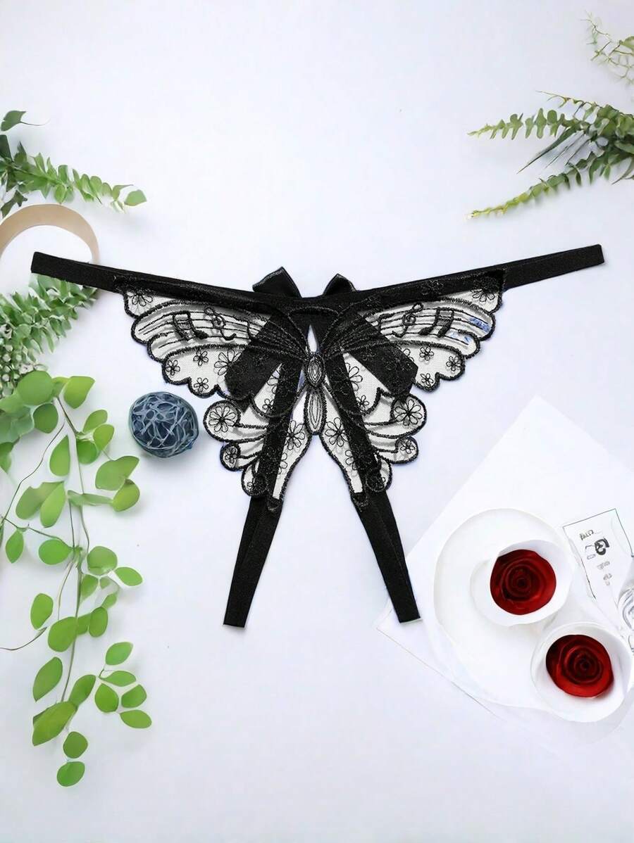 Ropa interior sexy con mariposa bordada transparente, bragas de tiro bajo con abertura en la entrepierna y lazo, tanga de encaje, tentadora para salir