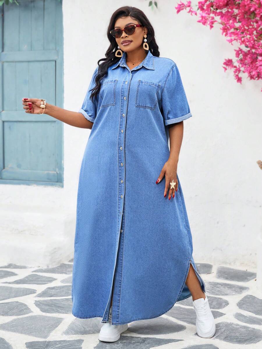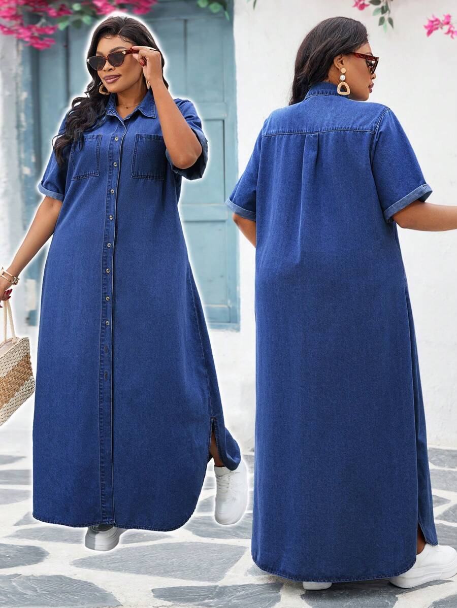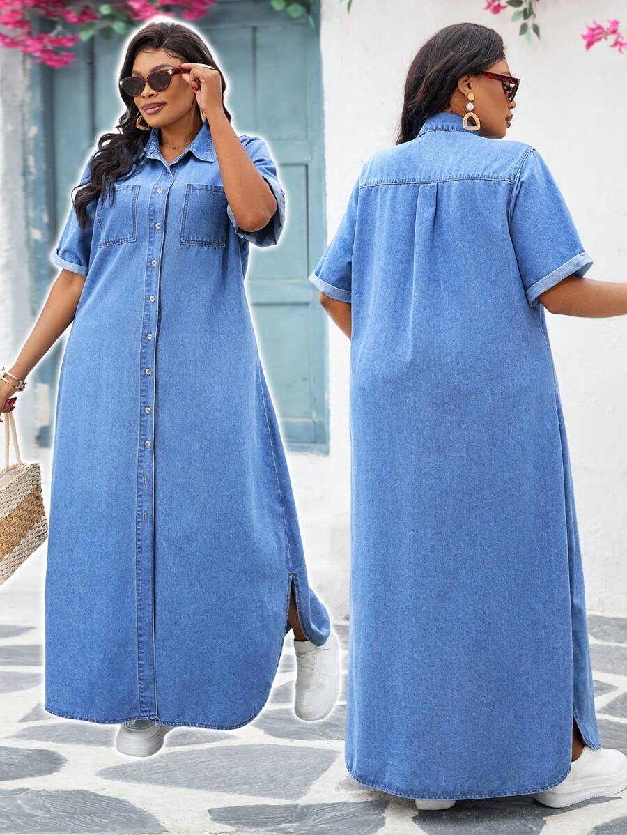 Vestido vaquero de manga corta y corte holgado para mujer de talla grande, ideal para casual, vacaciones, pascua, primavera, oficina, festivales, baby shower, campestre, estilo antiguo, salir, conciertos, aeropuerto, kpop, vacaciones