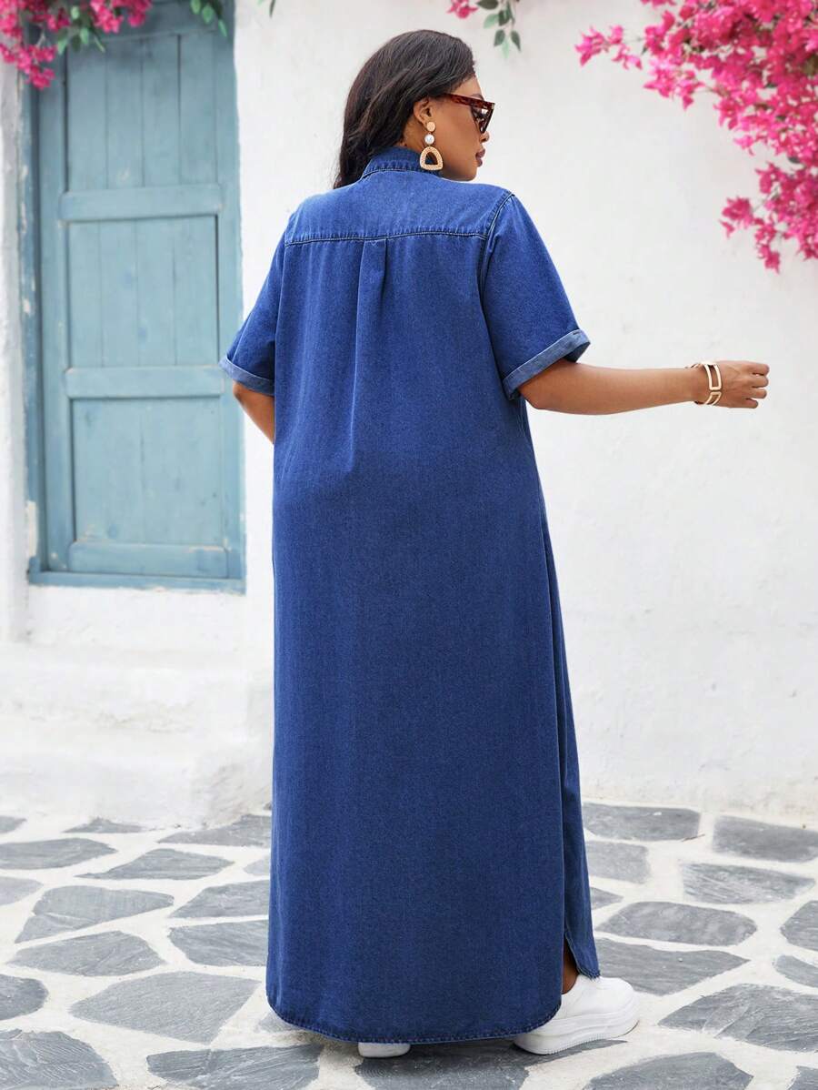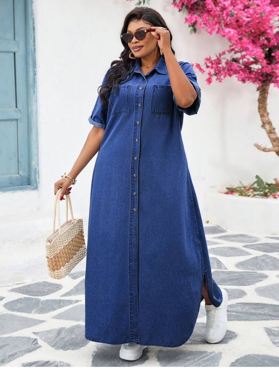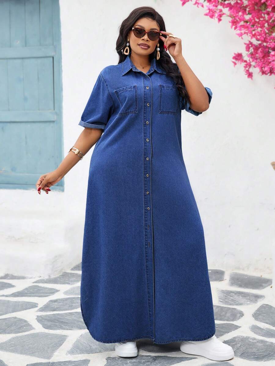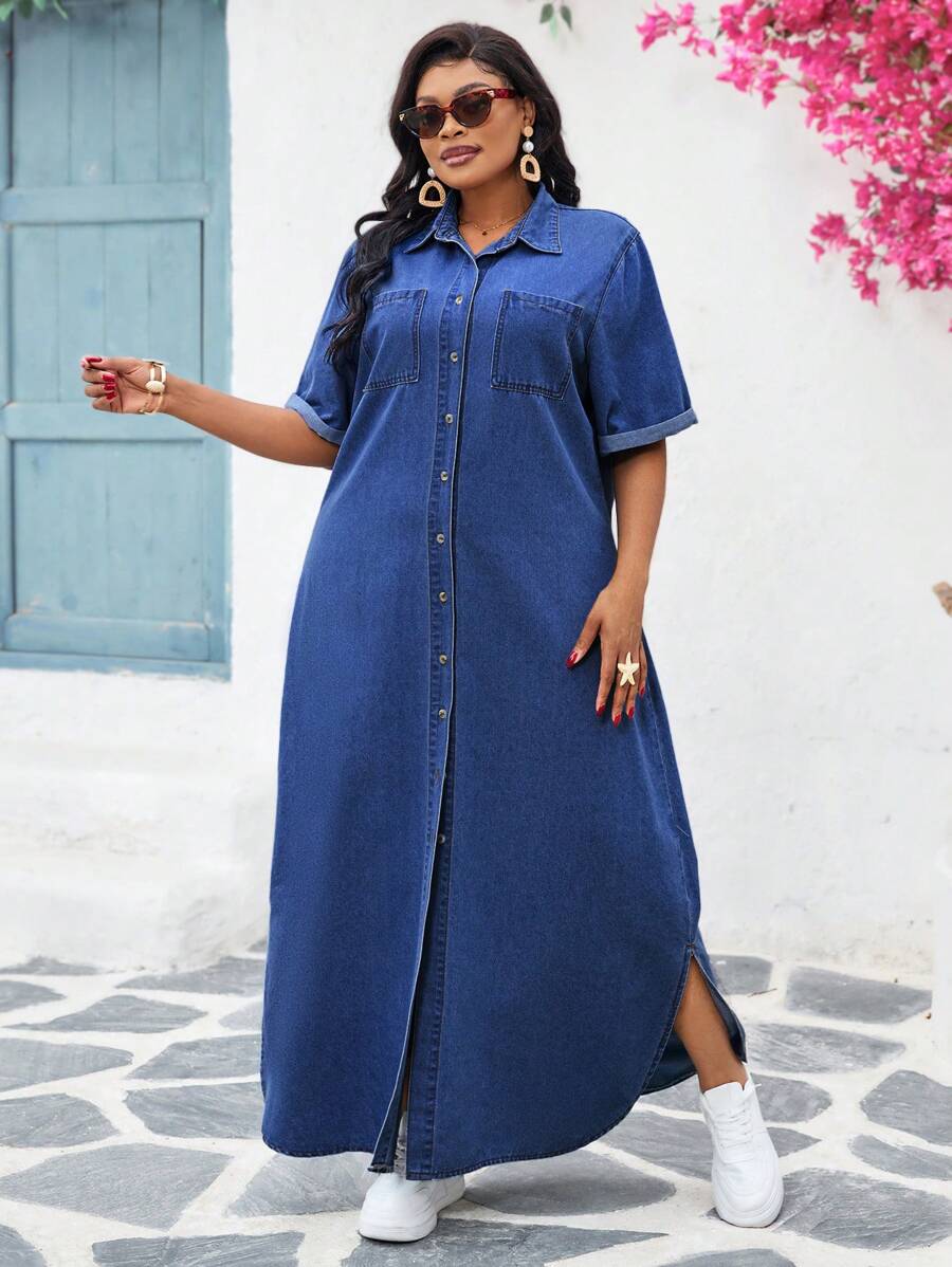 Vestido vaquero de manga corta y corte holgado para mujer de talla grande, ideal para casual, vacaciones, pascua, primavera, oficina, festivales, baby shower, campestre, estilo antiguo, salir, conciertos, aeropuerto, kpop, vacaciones