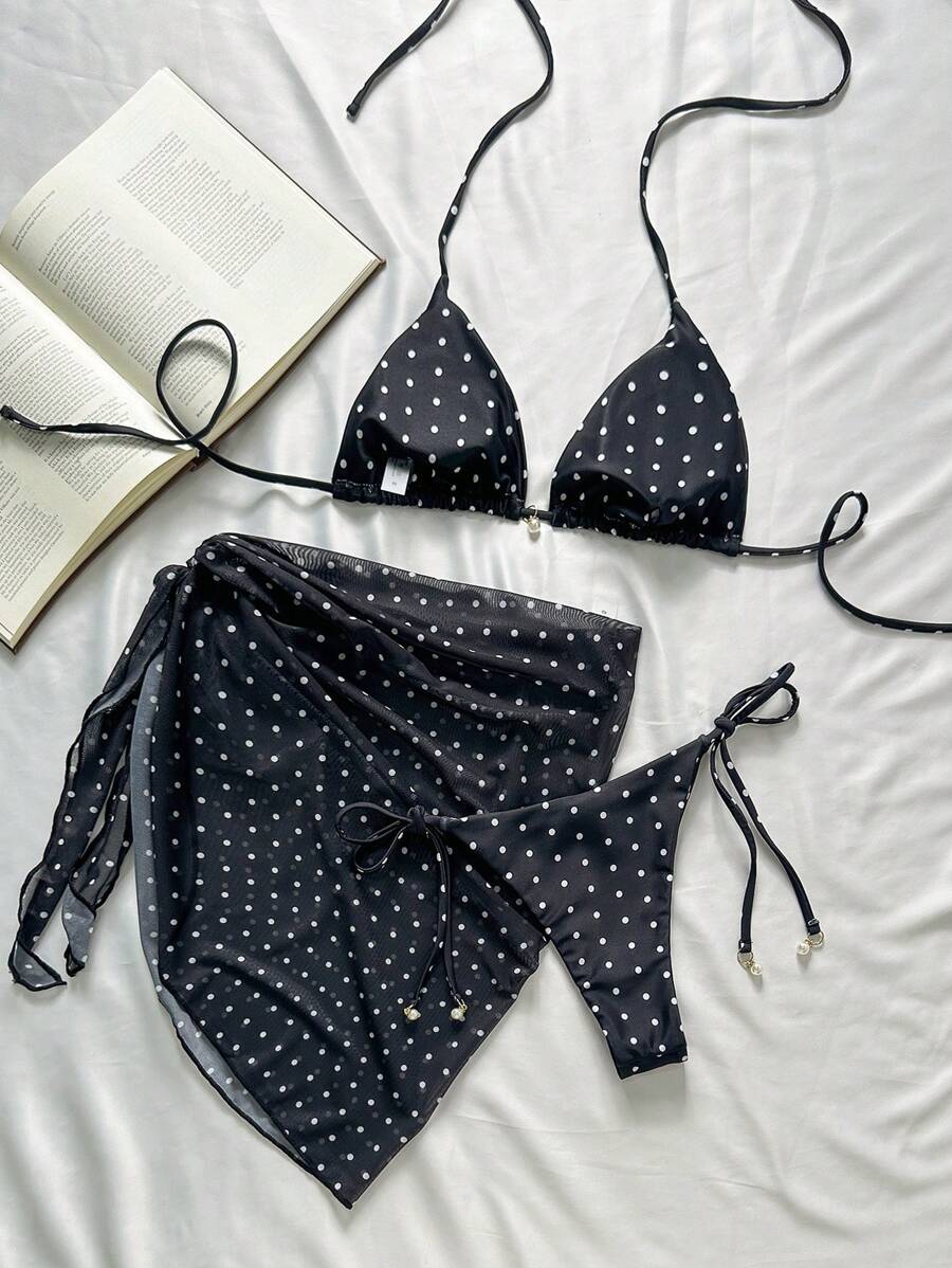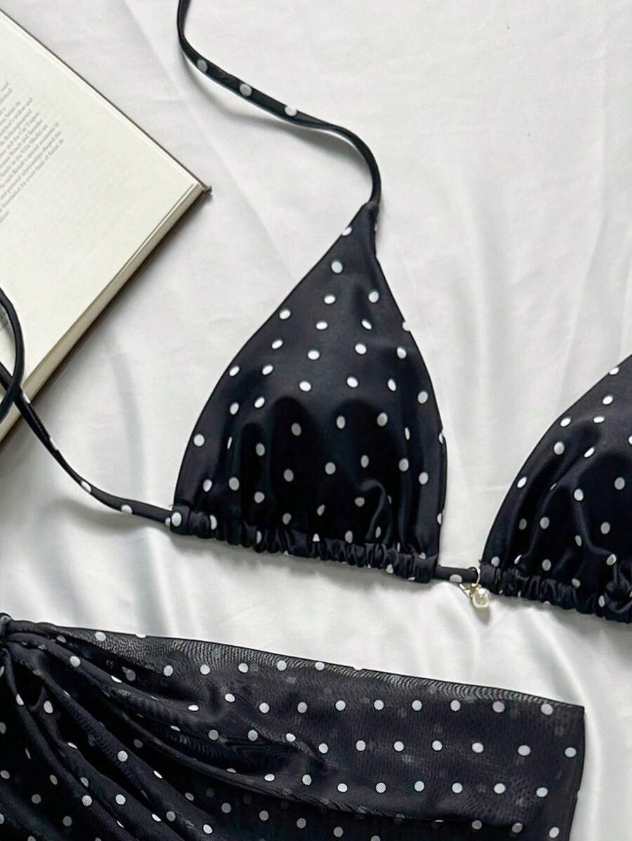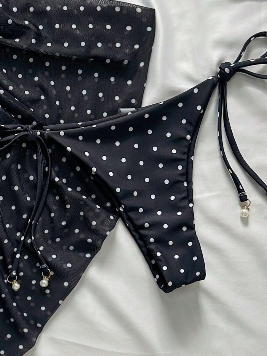 Conjunto de 3 piezas de ropa de playa y verano para mujer: top con tirantes de puntos blanco y negro, conjunto de traje de bano sexy de 2 piezas con decoracion de perlas