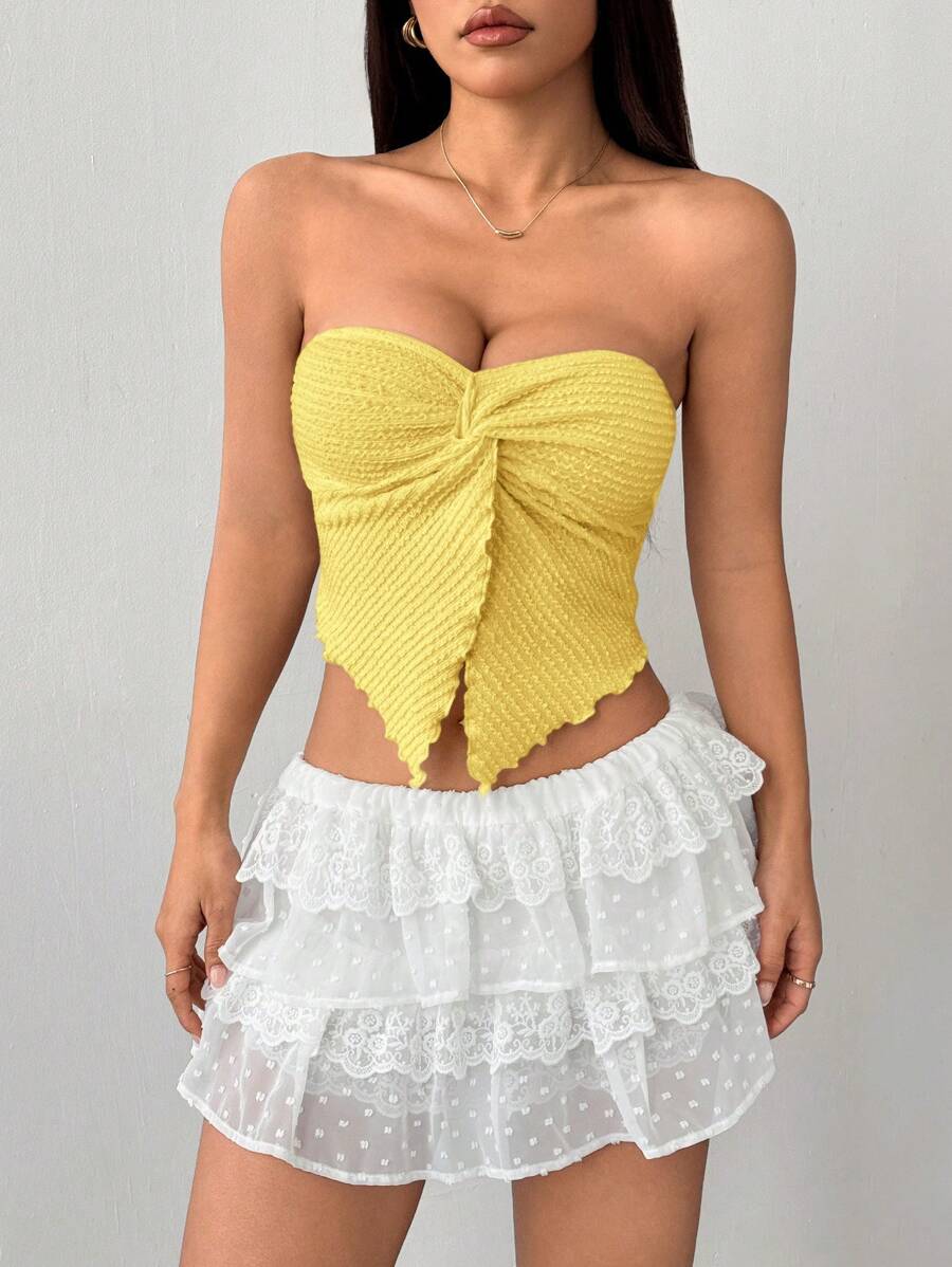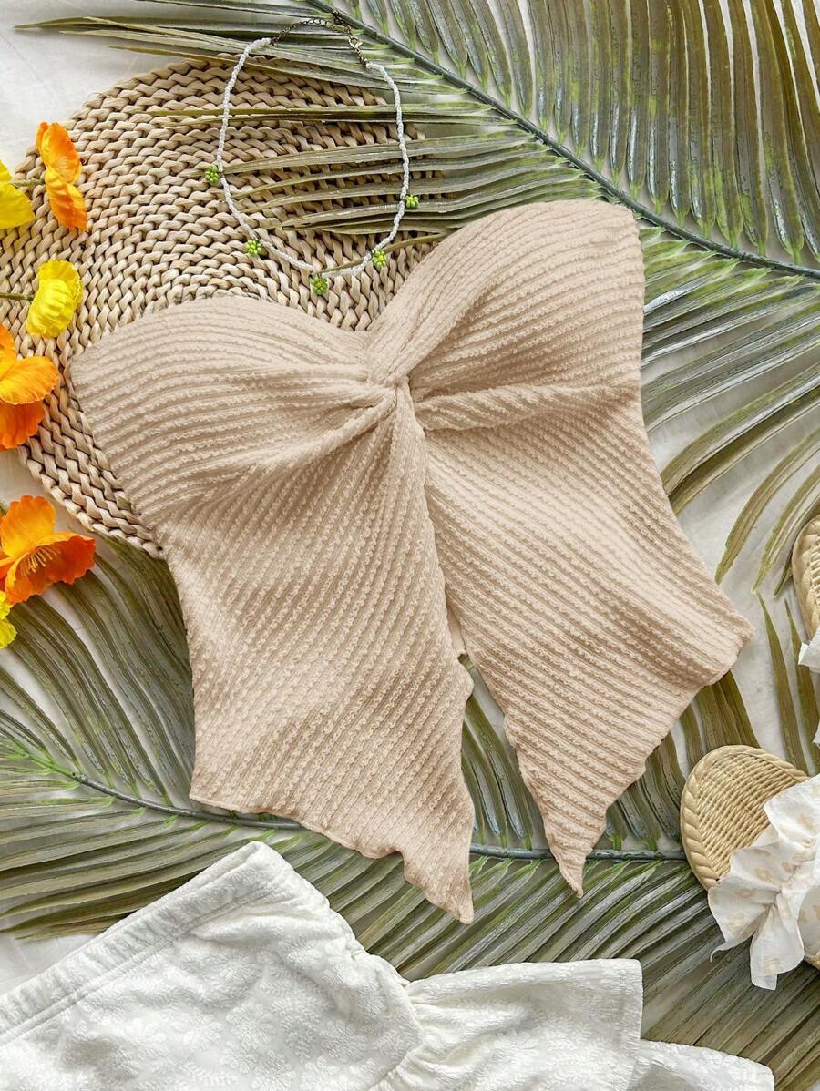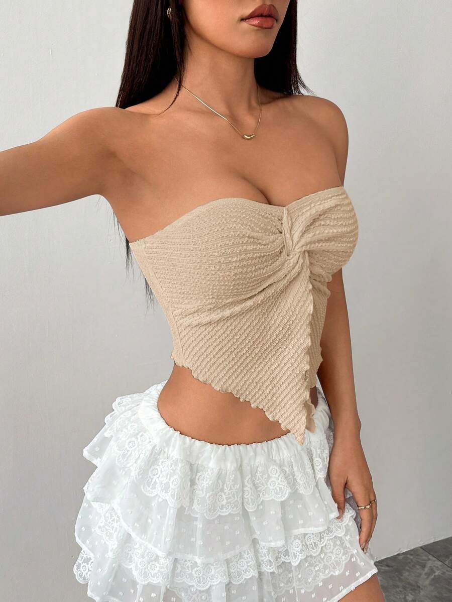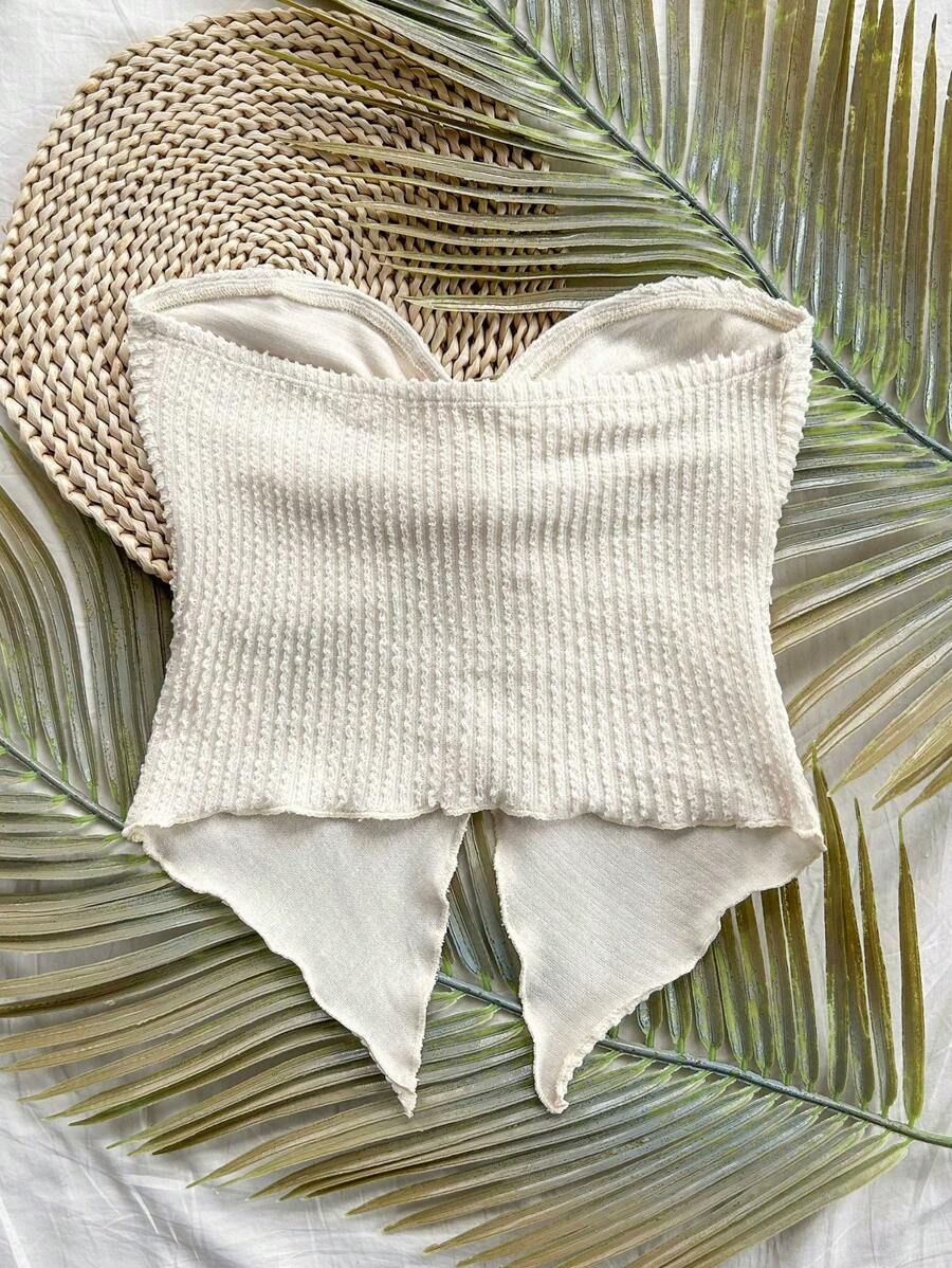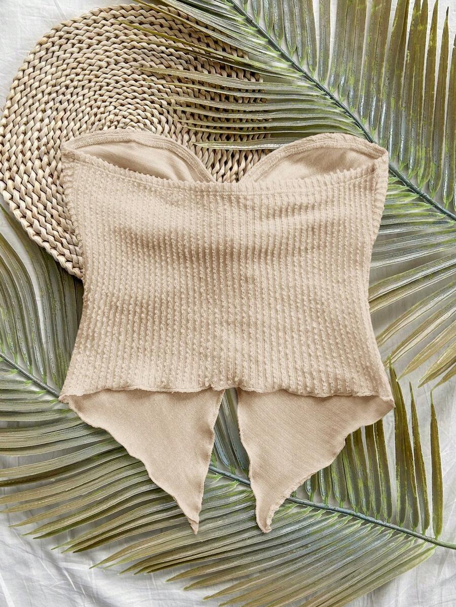 Chaleco de mujer de vacaciones con parte superior de tubo tejida con textura en color albaricoque y bajo asimetrico retorcido
