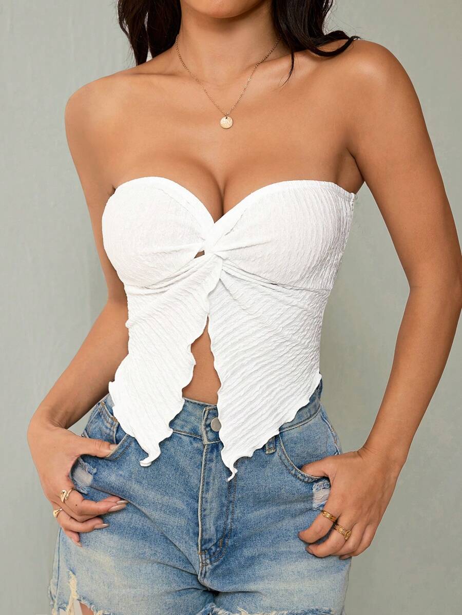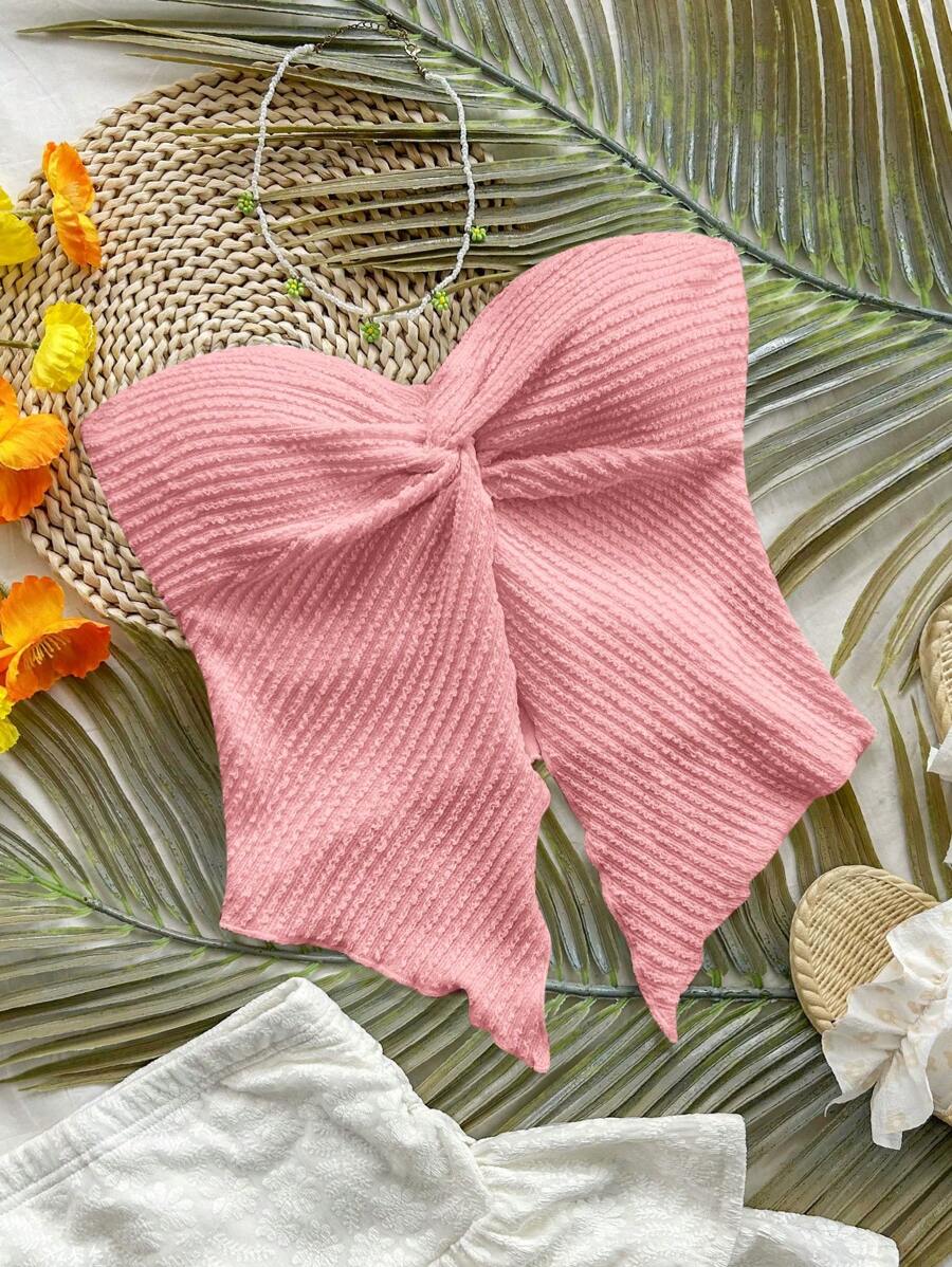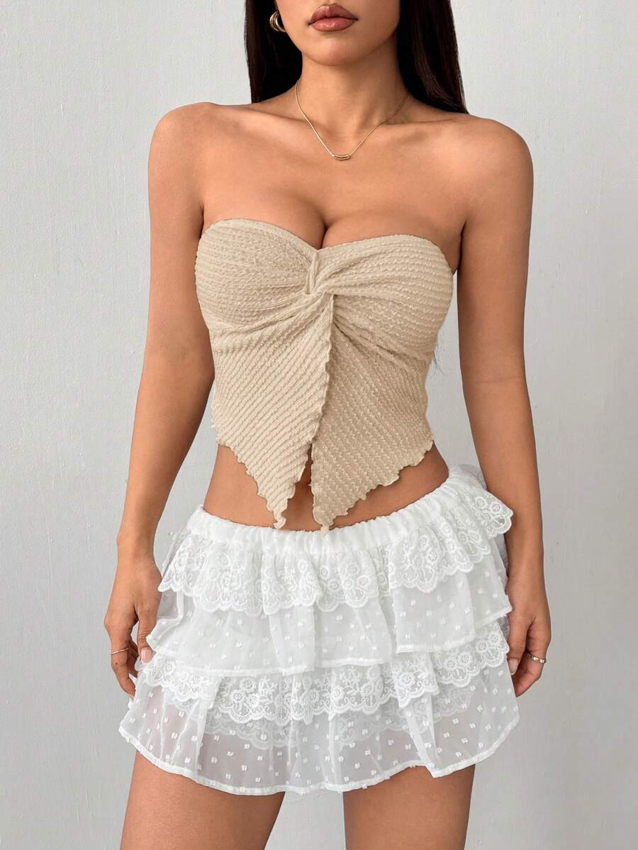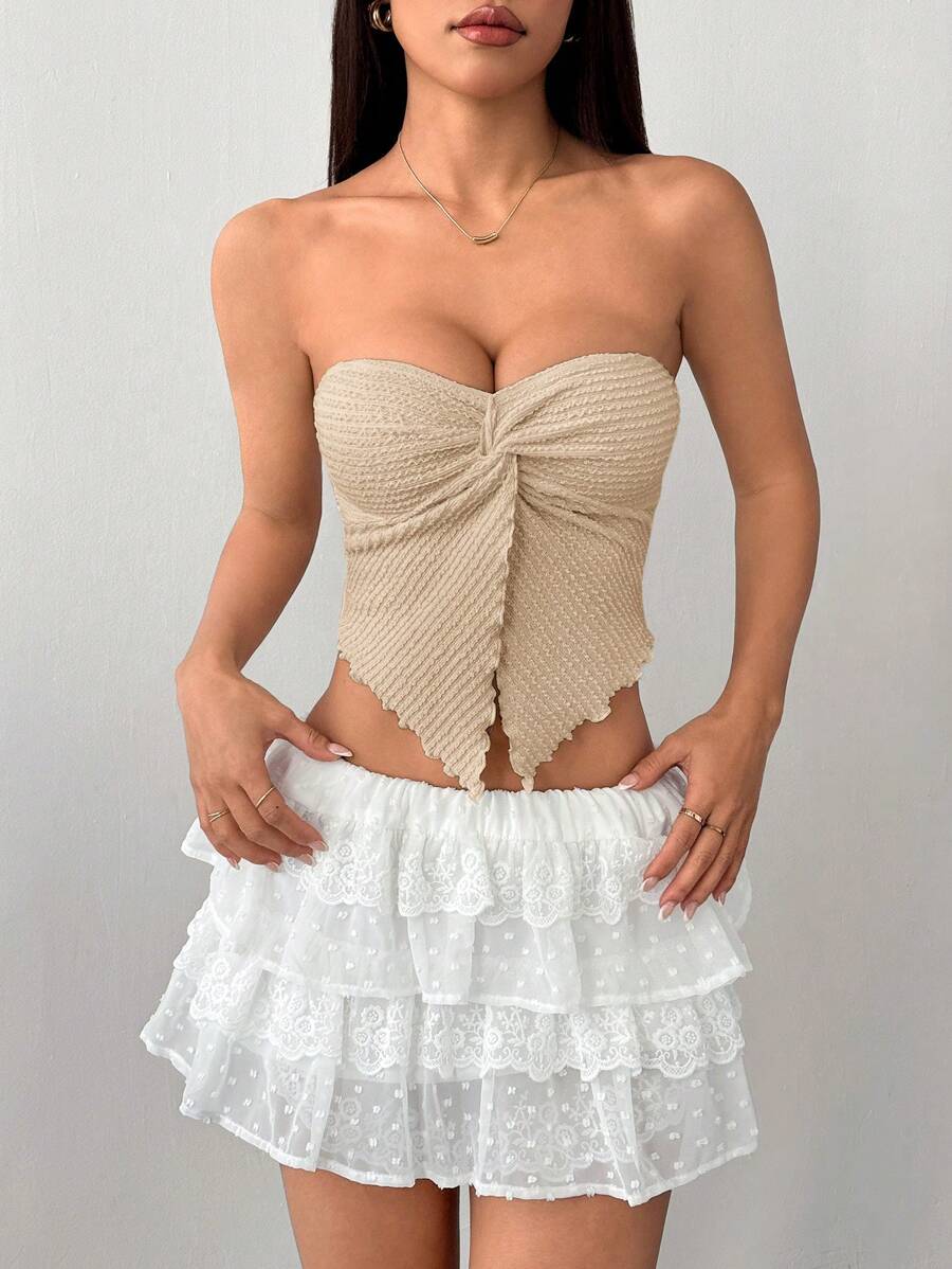 Chaleco de mujer de vacaciones con parte superior de tubo tejida con textura en color albaricoque y bajo asimetrico retorcido