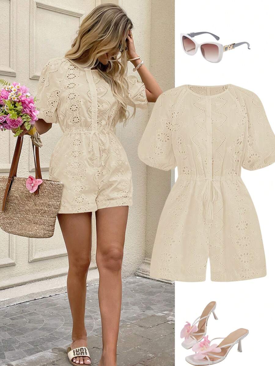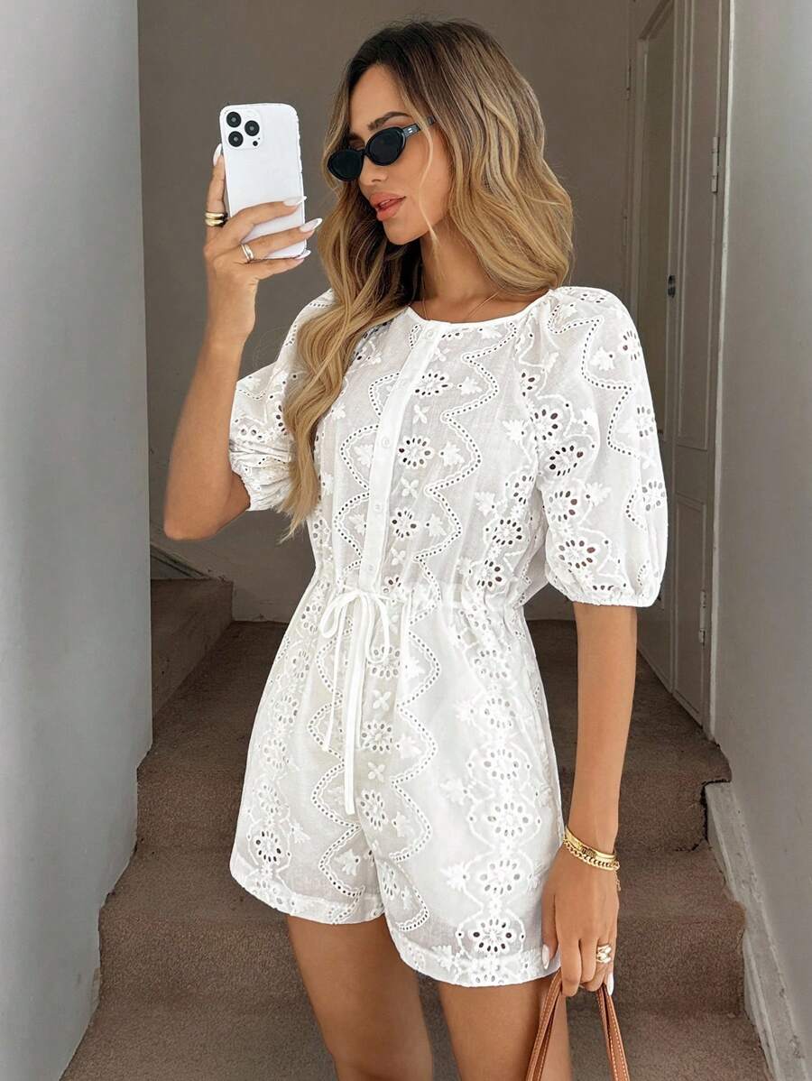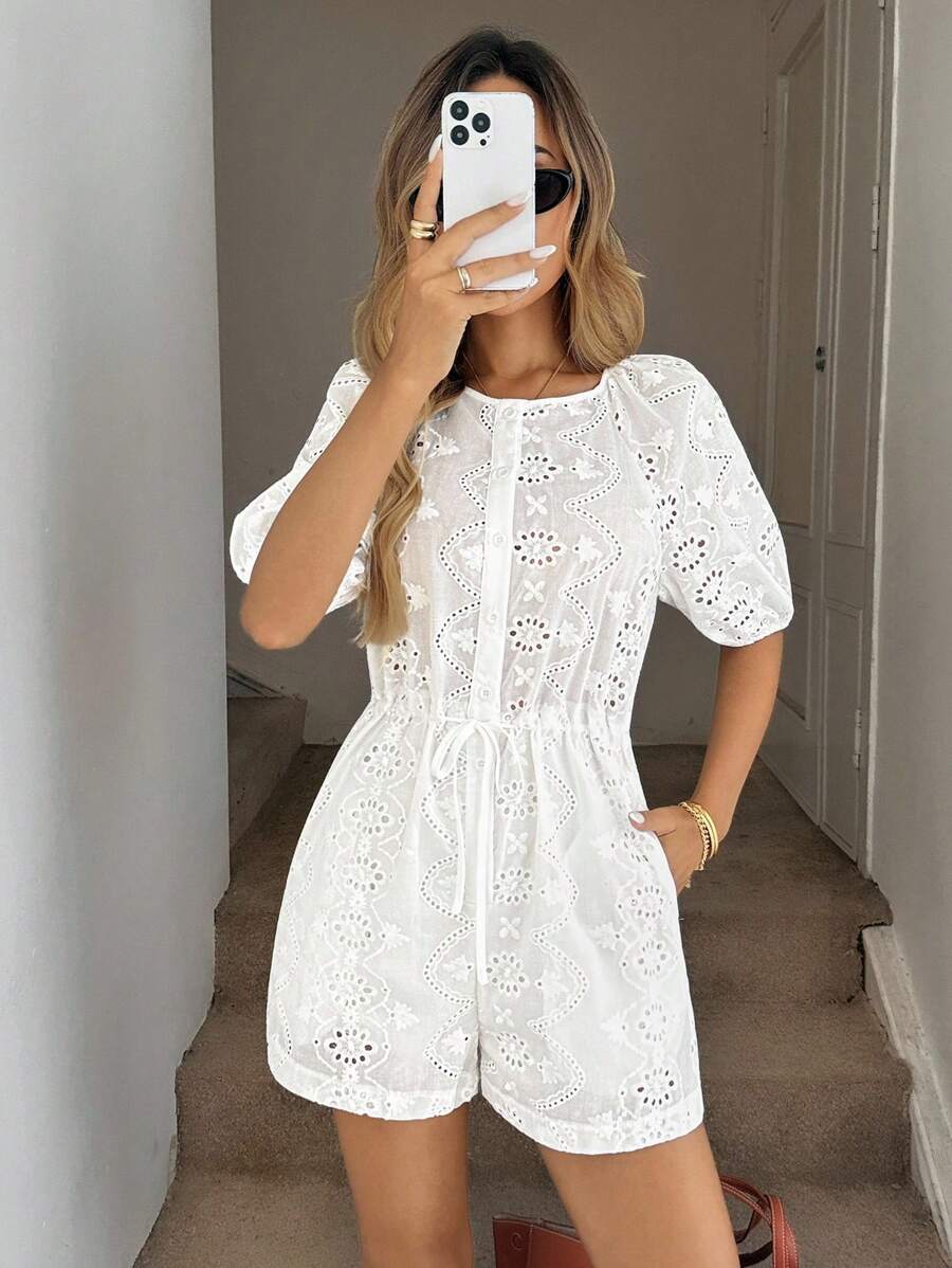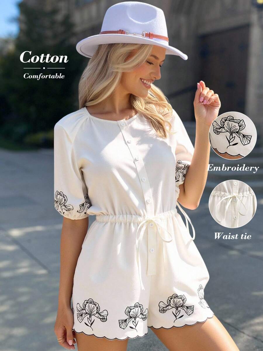 1 pieza enterizo corto con bolsillos para mujer de tela con bordado blanco y manga corta, adecuado para primavera/verano y vacaciones romanticas