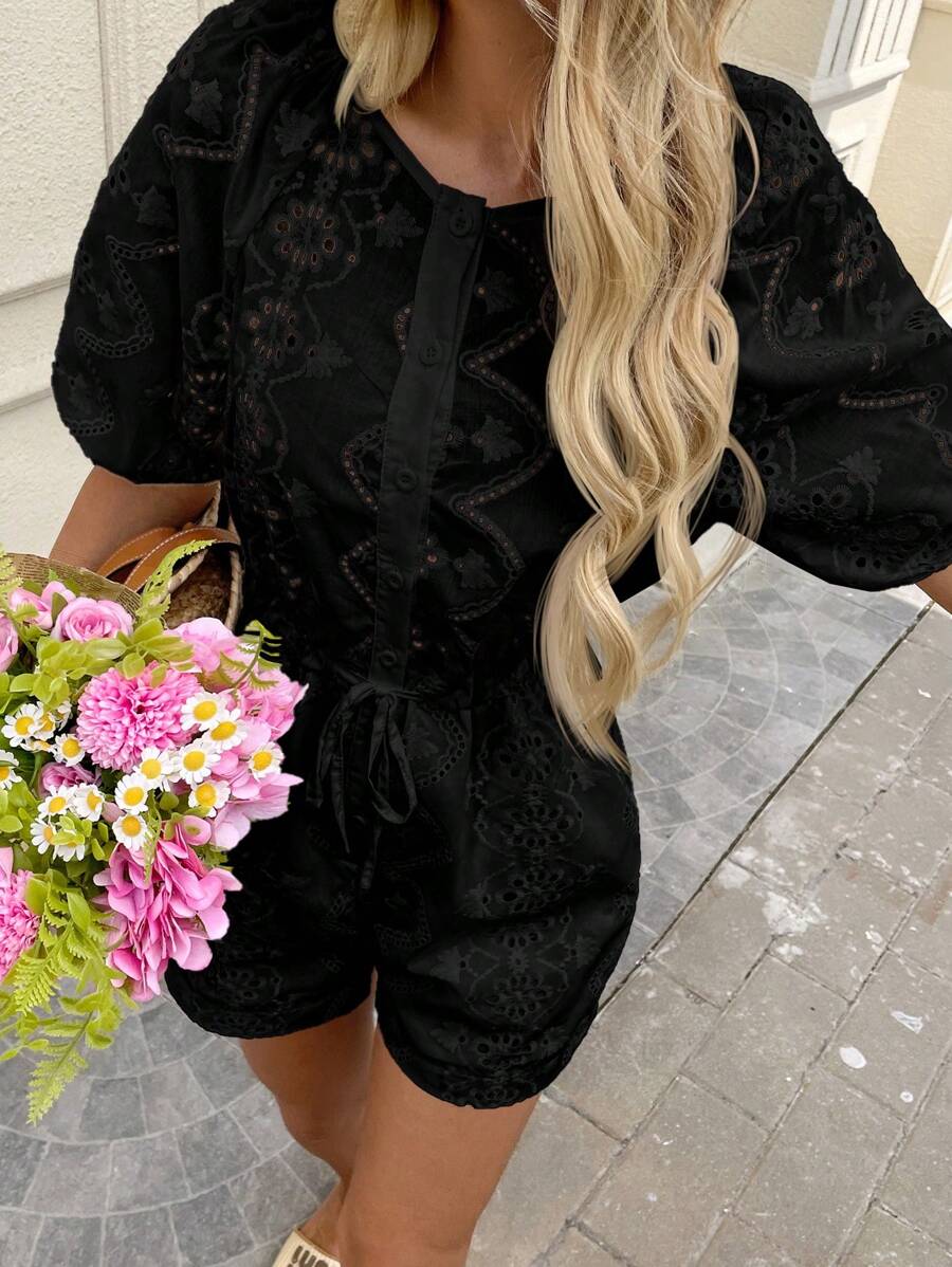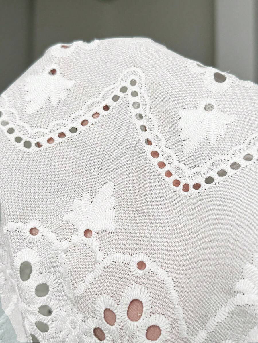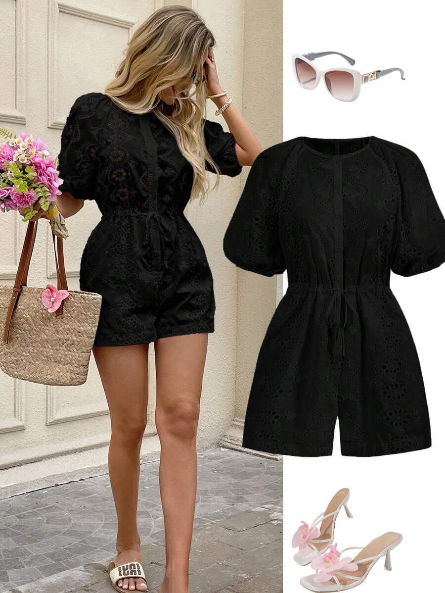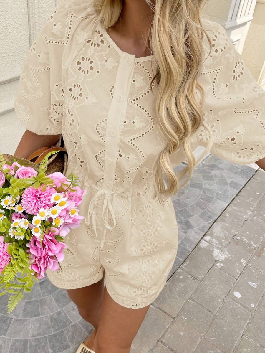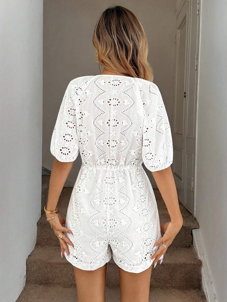 1 pieza enterizo corto con bolsillos para mujer de tela con bordado blanco y manga corta, adecuado para primavera/verano y vacaciones romanticas