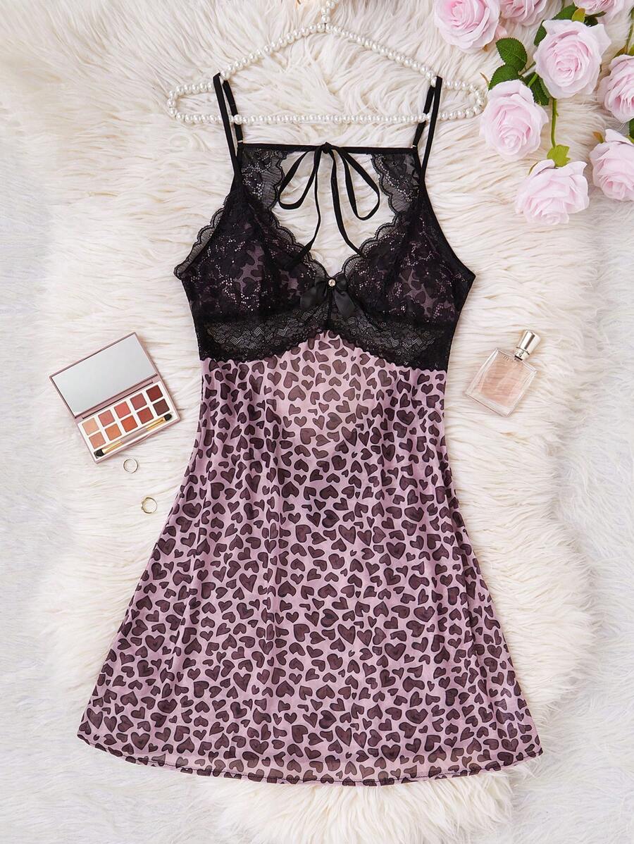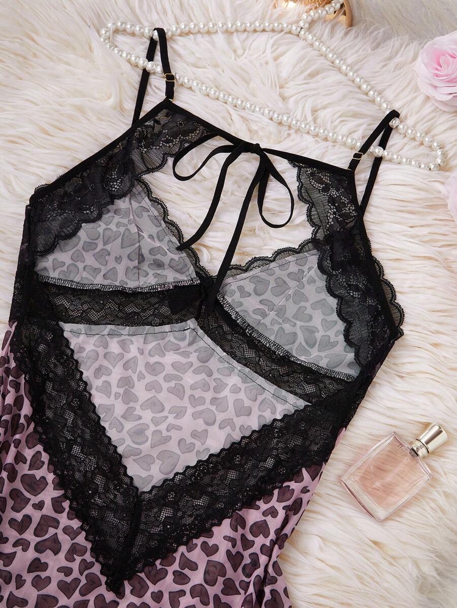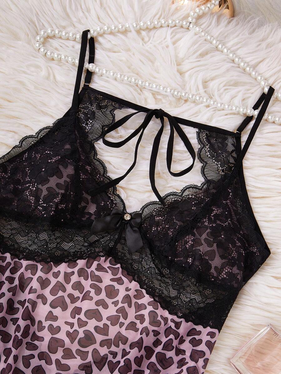 Camison tipo top con paneles de encaje, cordones y estampado de corazones en malla, con efecto colorblock