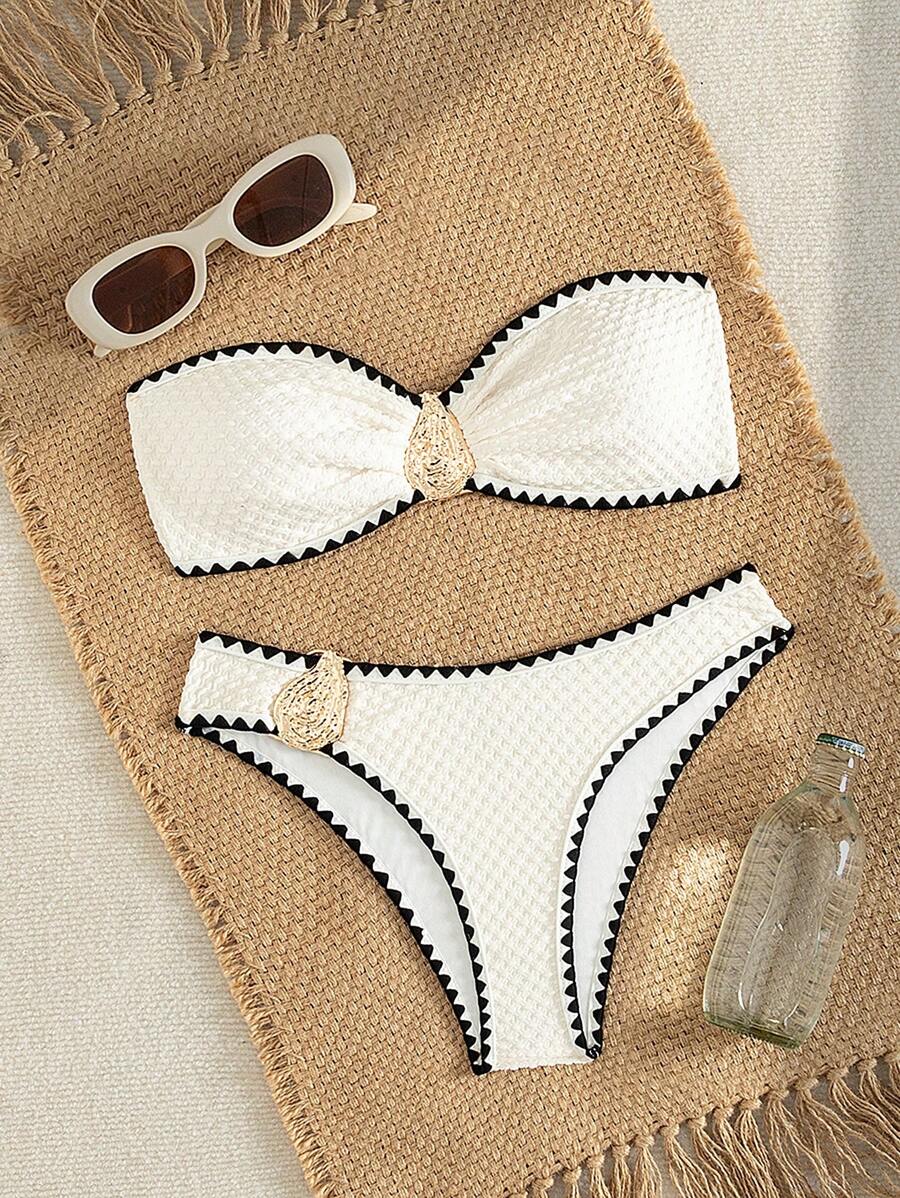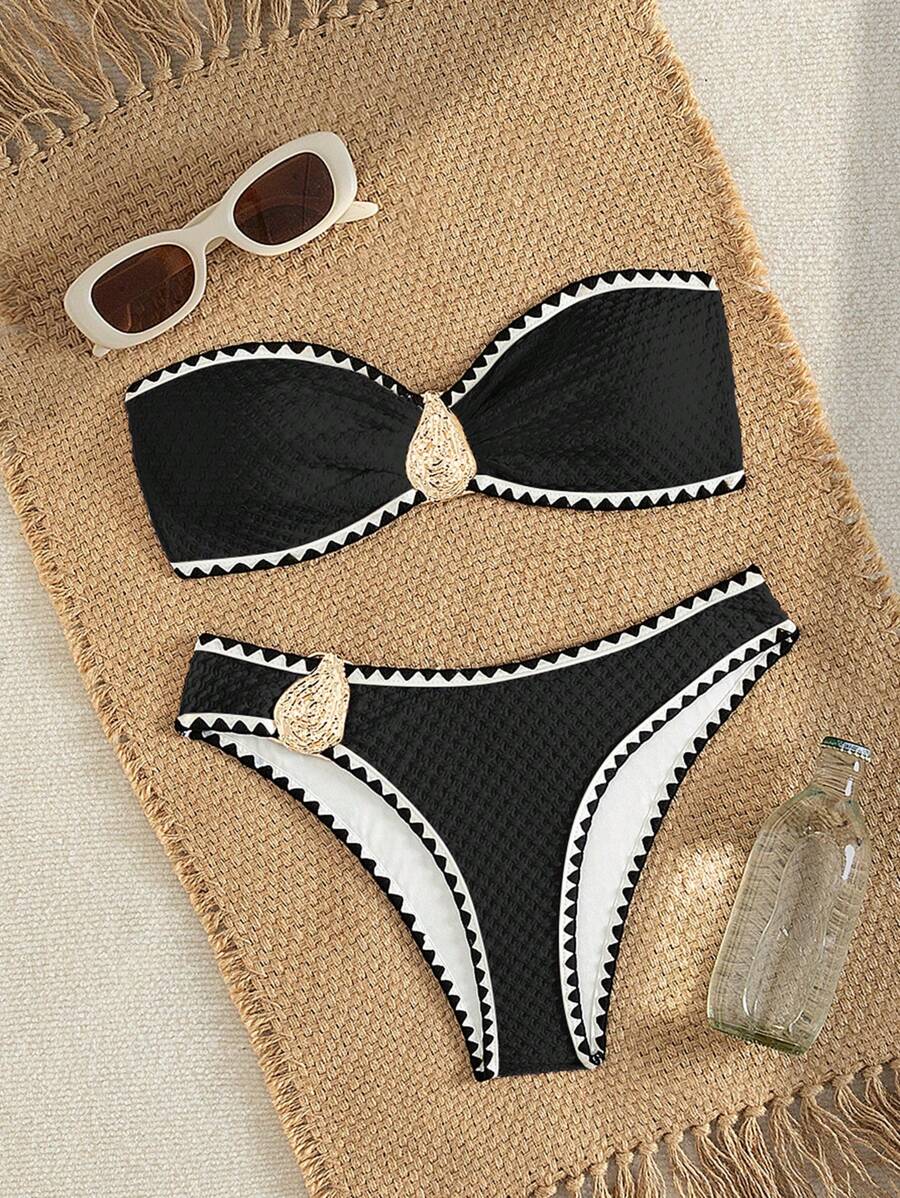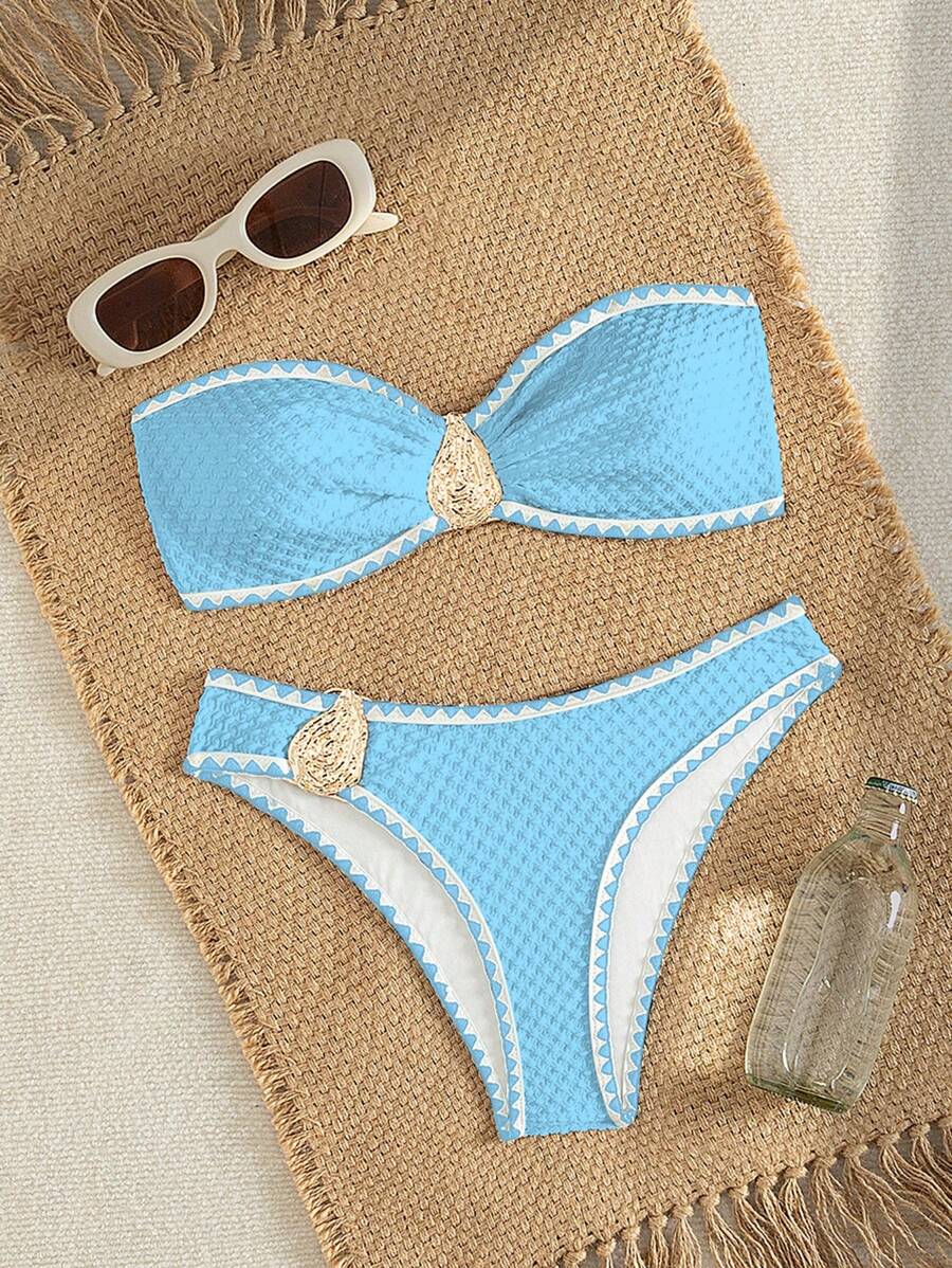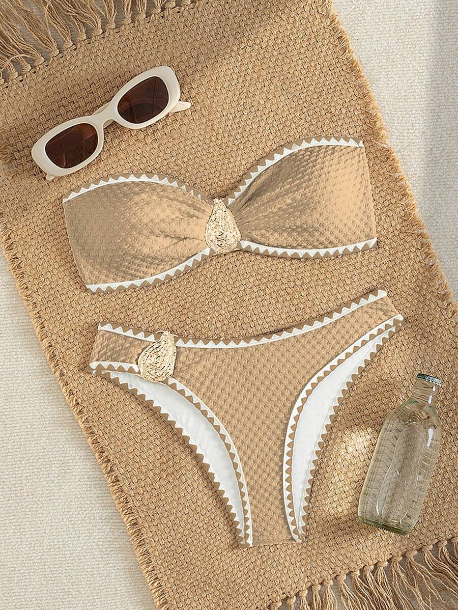2 piezas conjunto de bikini brasier sin tirantes de unicolor con textura y accesorios metalicos, traje de bano sexy y elegante para vacaciones, playa, fiesta en la piscina para mujer, verano